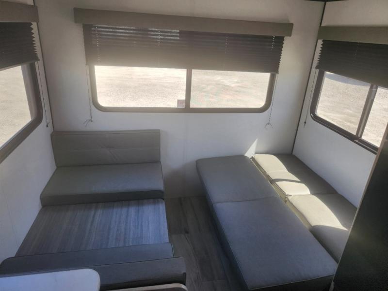After making dinner on the two burner cooktop or microwave, you can dine at the booth dinette or outside under the 16' power awning if you brought along your camping chairs. There is also a sofa inside for additional seating and sleeping space. After playing outdoors all day, everyone can return to get cleaned up in the full mid-coach bath including a shower. The front queen bed is sure to bring a great night's rest, and there are dual bedside wardrobes to keep your things organized.