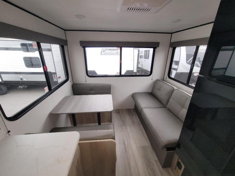 With any Coleman travel trailer, you will experience Keystone's quality throughout, plus enjoy lightweight towing to the campground or RV park. There is a walkable roof, tinted safety glass windows, and a power awning outdoors for an inviting space to relax. The friction hinge entry door is another convenience you'll appreciate, and there is Furrion backup camera prep if you want the option to make parking easier. Inside, you'll find blackout night shades, a 6' 8" ceiling height, bedside outlets, and many more comforts.