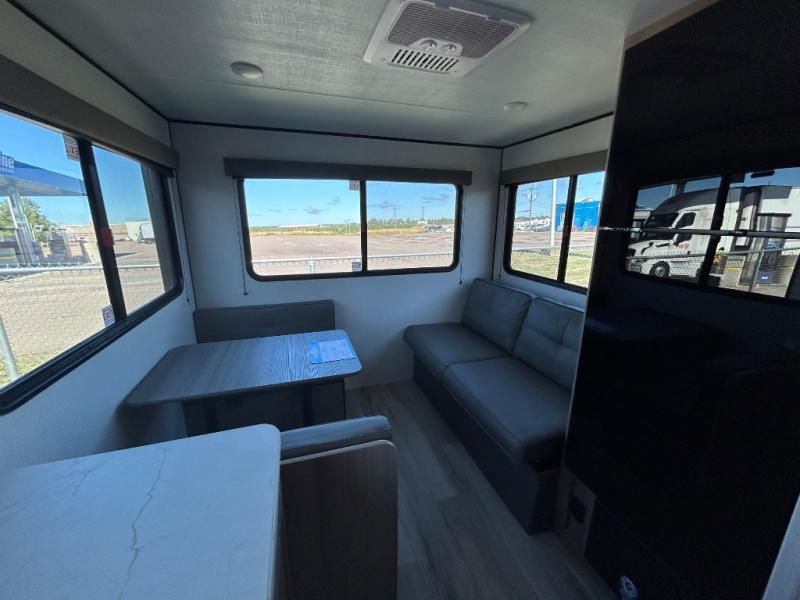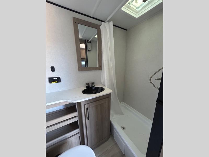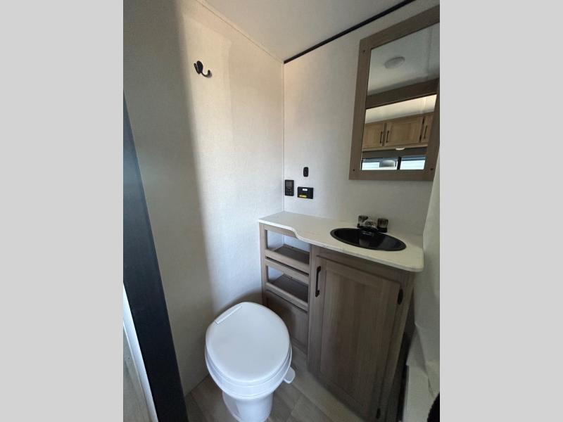 After making dinner on the two burner cooktop or microwave, you can dine at the booth dinette or outside under the 16' power awning if you brought along your camping chairs. There is also a sofa inside for additional seating and sleeping space. After playing outdoors all day, everyone can return to get cleaned up in the full mid-coach bath including a shower. The front queen bed is sure to bring a great night's rest, and there are dual bedside wardrobes to keep your things organized.