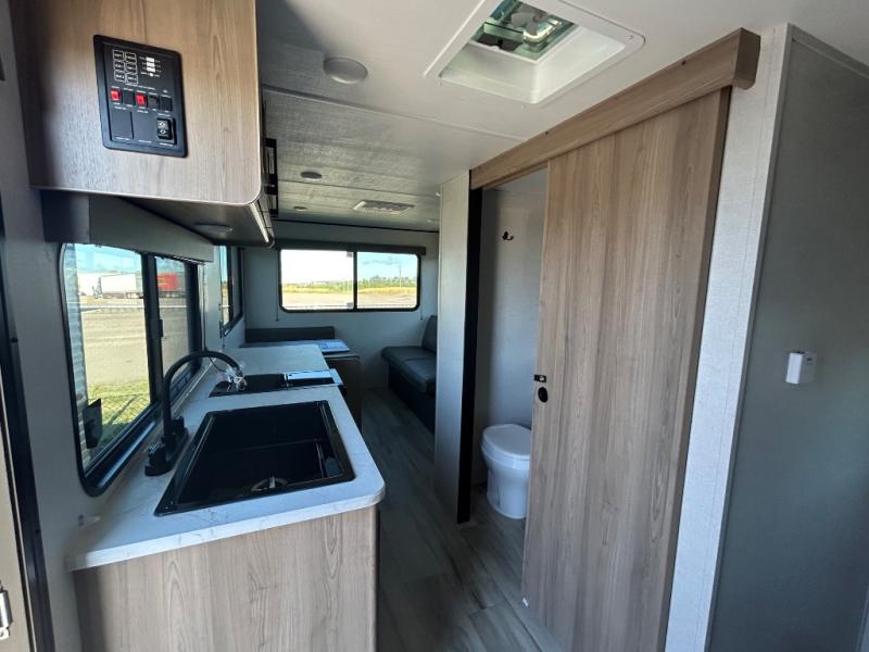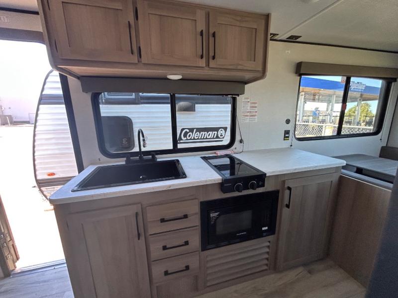 With any Coleman travel trailer, you will experience Keystone's quality throughout, plus enjoy lightweight towing to the campground or RV park. There is a walkable roof, tinted safety glass windows, and a power awning outdoors for an inviting space to relax. The friction hinge entry door is another convenience you'll appreciate, and there is Furrion backup camera prep if you want the option to make parking easier. Inside, you'll find blackout night shades, a 6' 8" ceiling height, bedside outlets, and many more comforts.