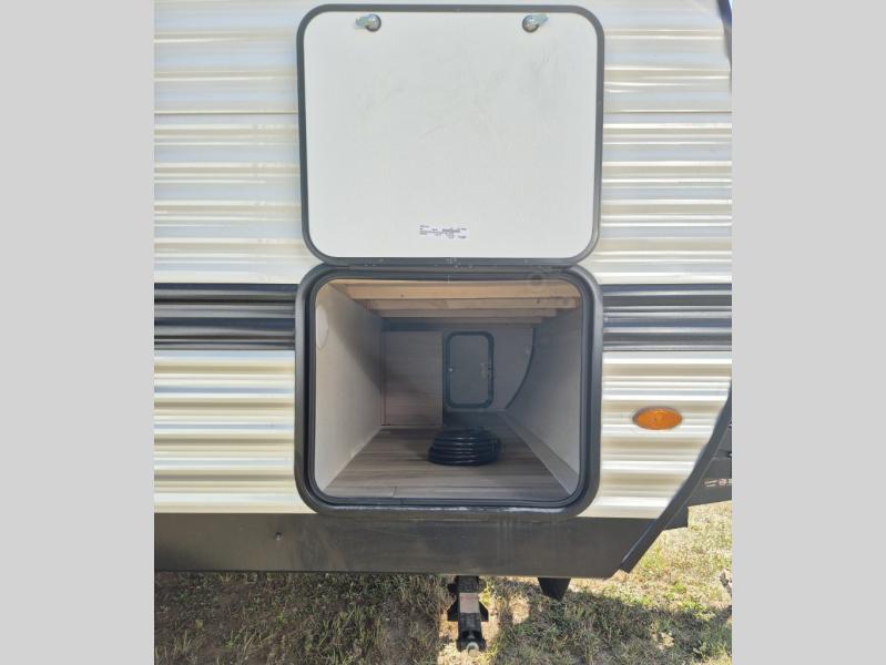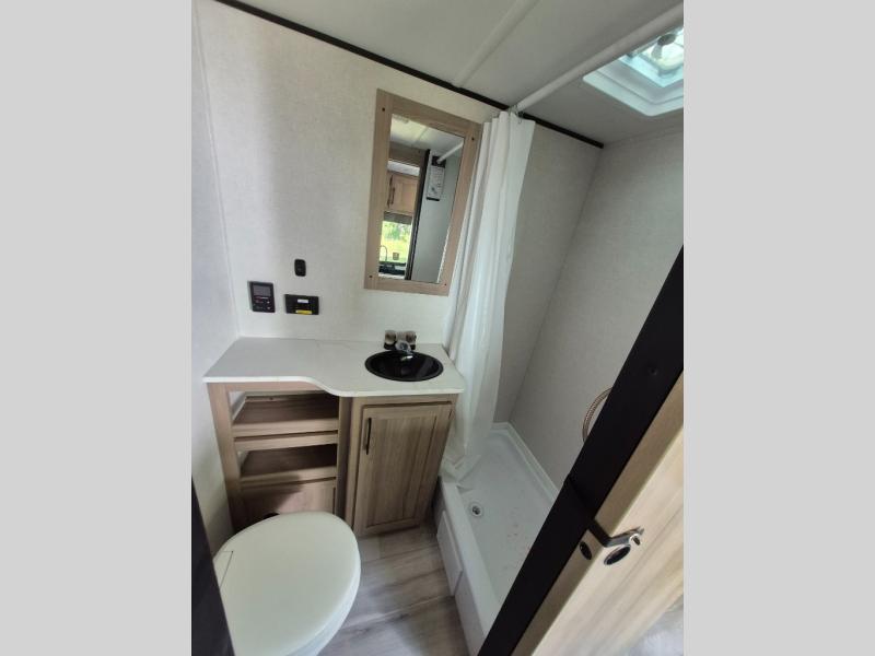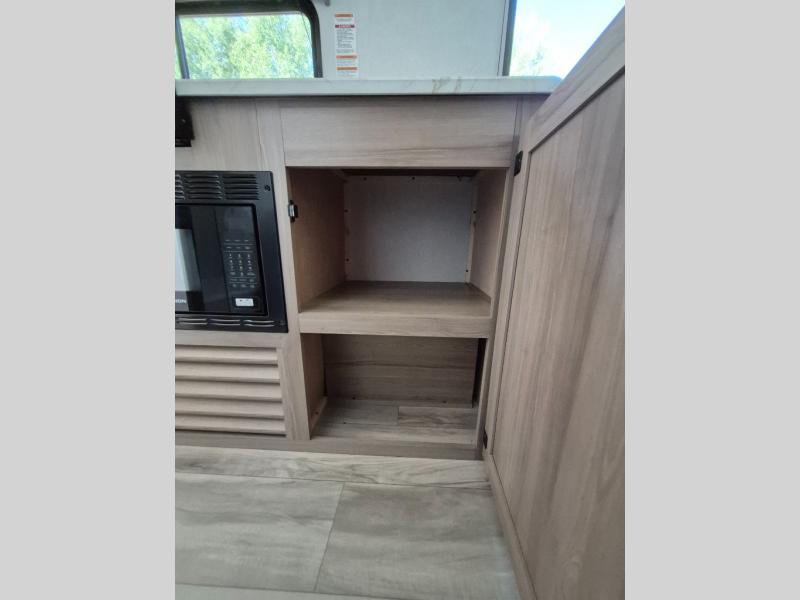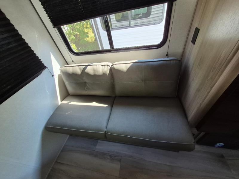 After making dinner on the two burner cooktop or microwave, you can dine at the booth dinette or outside under the 16' power awning if you brought along your camping chairs. There is also a sofa inside for additional seating and sleeping space. After playing outdoors all day, everyone can return to get cleaned up in the full mid-coach bath including a shower. The front queen bed is sure to bring a great night's rest, and there are dual bedside wardrobes to keep your things organized.