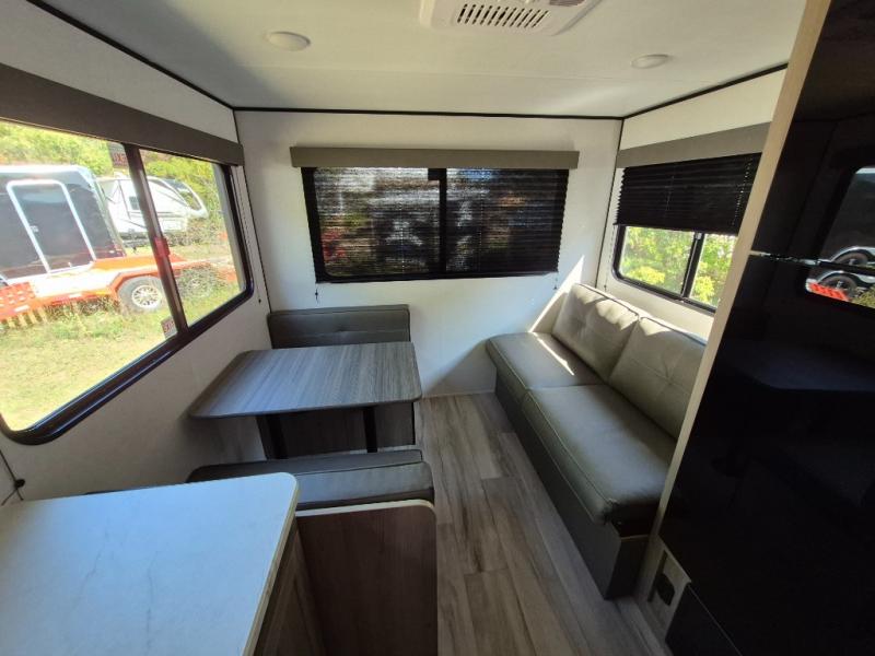 With any Coleman travel trailer, you will experience Keystone's quality throughout, plus enjoy lightweight towing to the campground or RV park. There is a walkable roof, tinted safety glass windows, and a power awning outdoors for an inviting space to relax. The friction hinge entry door is another convenience you'll appreciate, and there is Furrion backup camera prep if you want the option to make parking easier. Inside, you'll find blackout night shades, a 6' 8" ceiling height, bedside outlets, and many more comforts.