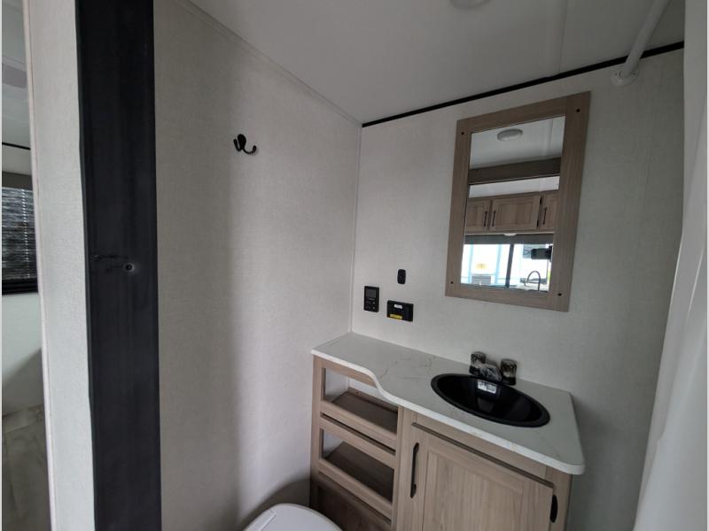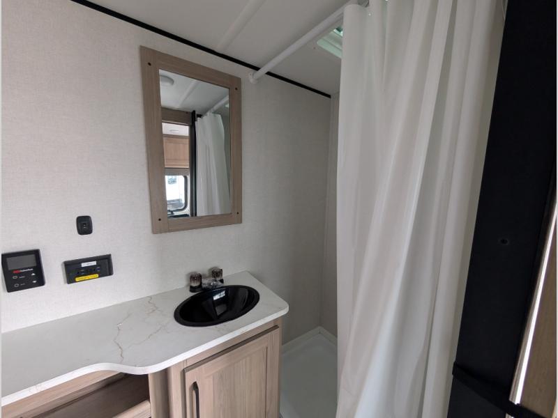 After making dinner on the two burner cooktop or microwave, you can dine at the booth dinette or outside under the 16' power awning if you brought along your camping chairs. There is also a sofa inside for additional seating and sleeping space. After playing outdoors all day, everyone can return to get cleaned up in the full mid-coach bath including a shower. The front queen bed is sure to bring a great night's rest, and there are dual bedside wardrobes to keep your things organized.