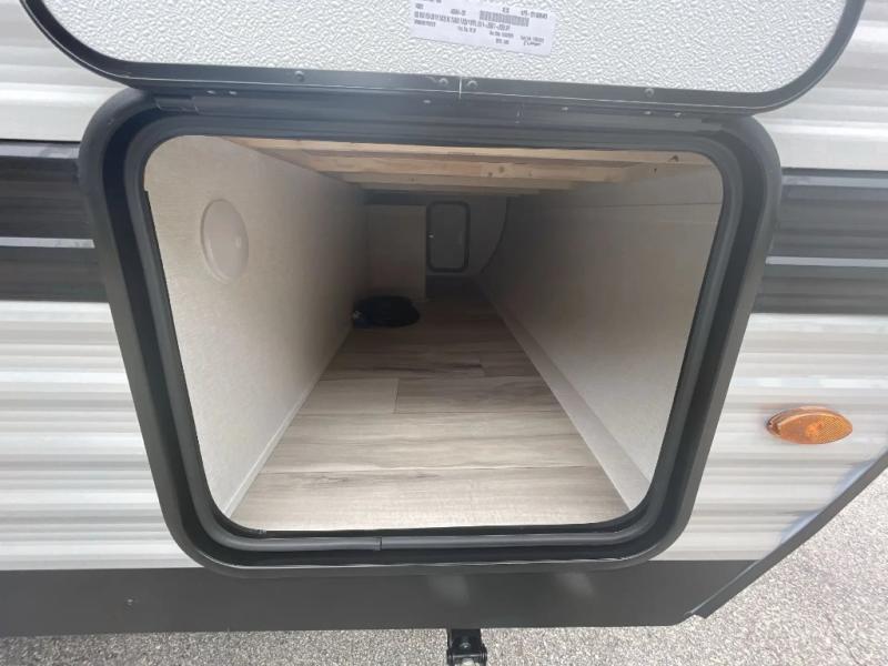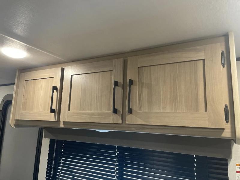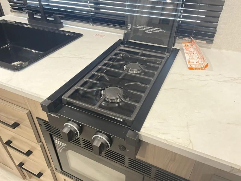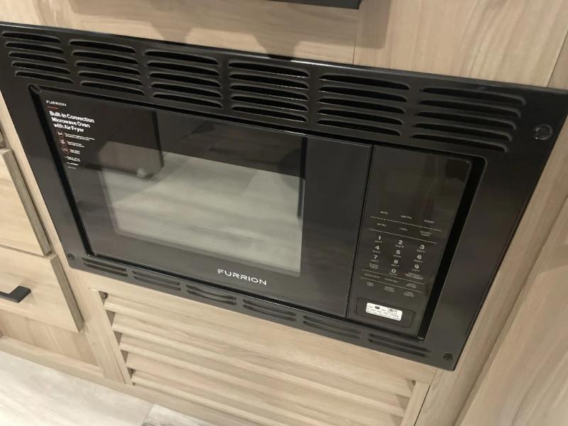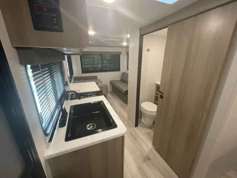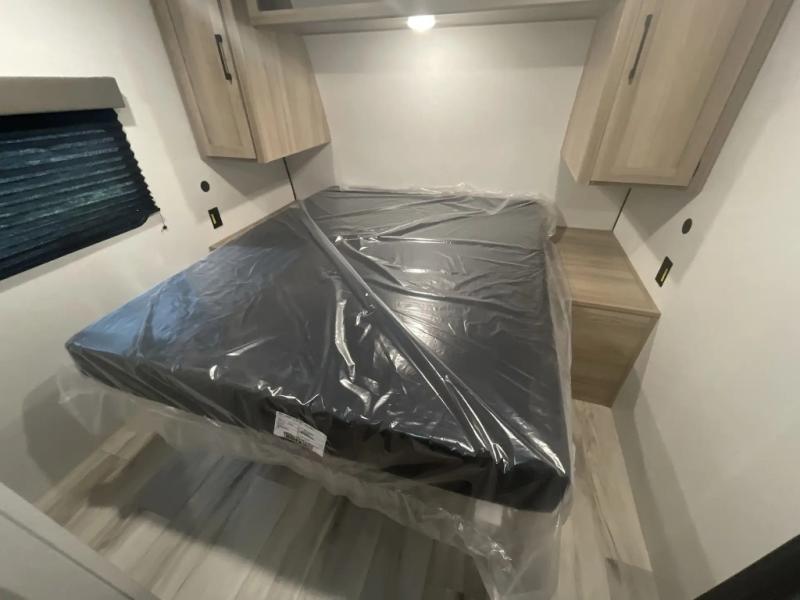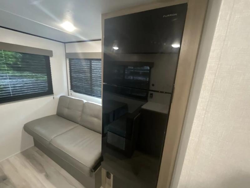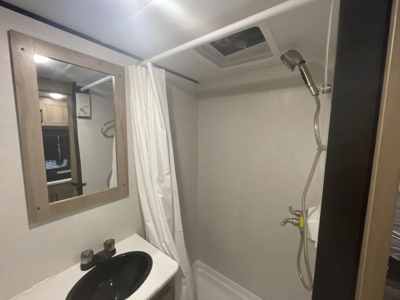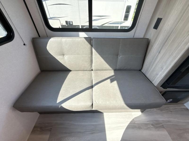 After making dinner on the two burner cooktop or microwave, you can dine at the booth dinette or outside under the 16' power awning if you brought along your camping chairs. There is also a sofa inside for additional seating and sleeping space. After playing outdoors all day, everyone can return to get cleaned up in the full mid-coach bath including a shower. The front queen bed is sure to bring a great night's rest, and there are dual bedside wardrobes to keep your things organized.