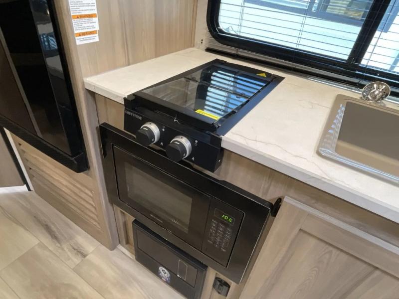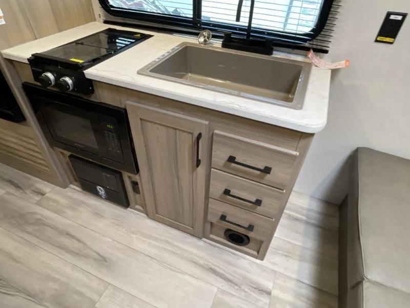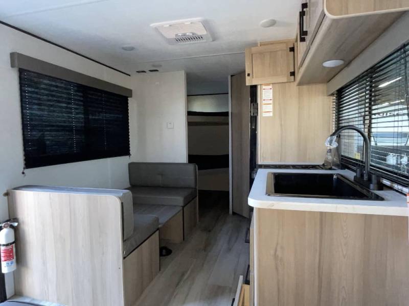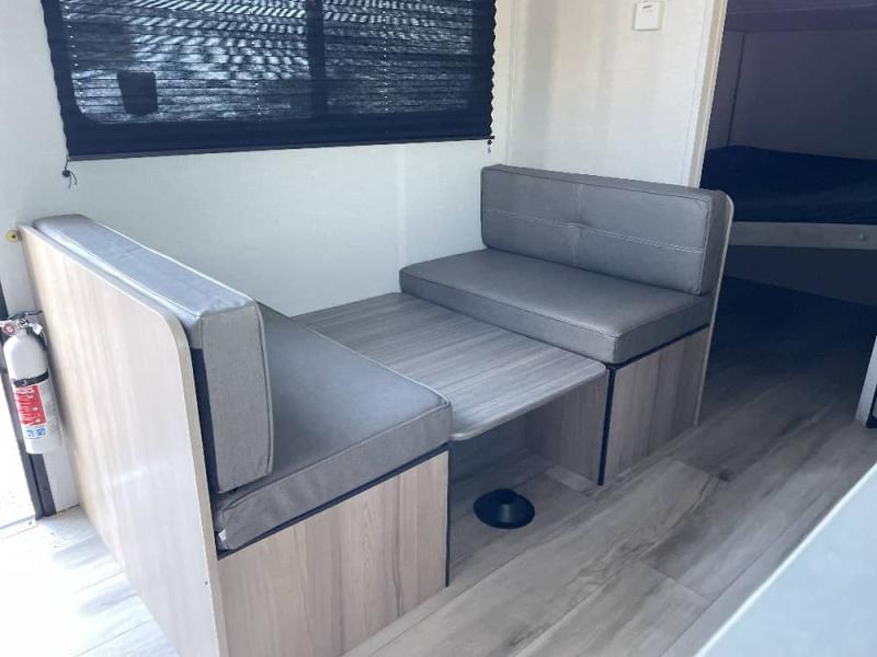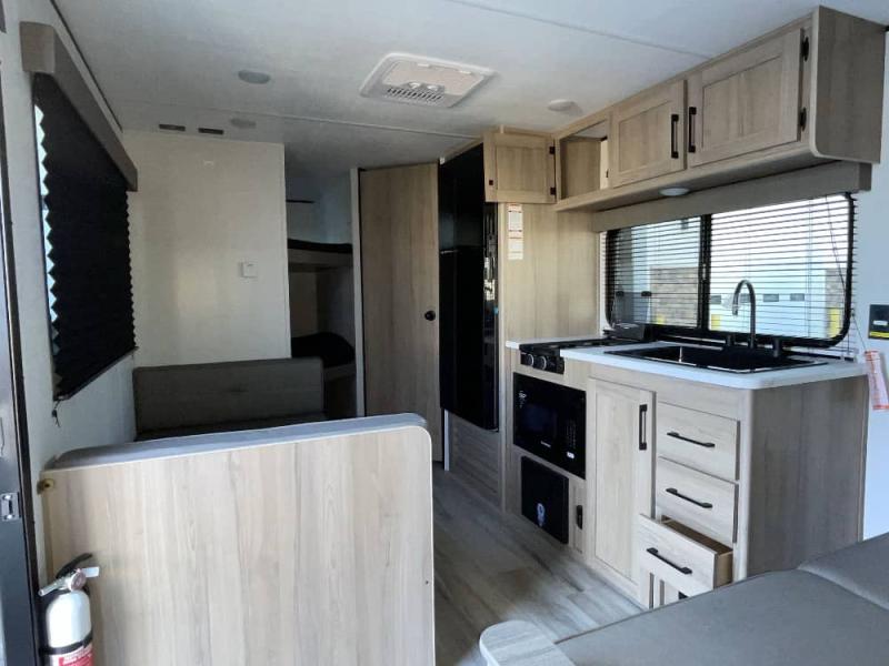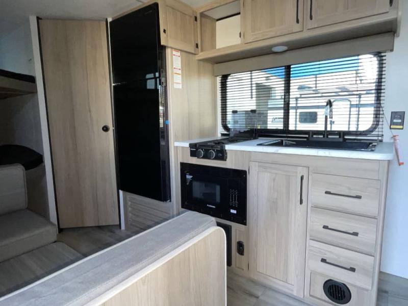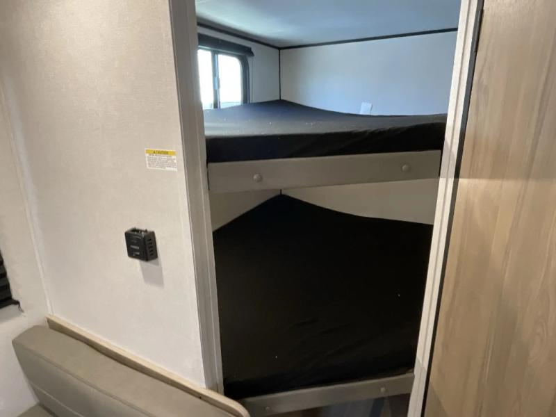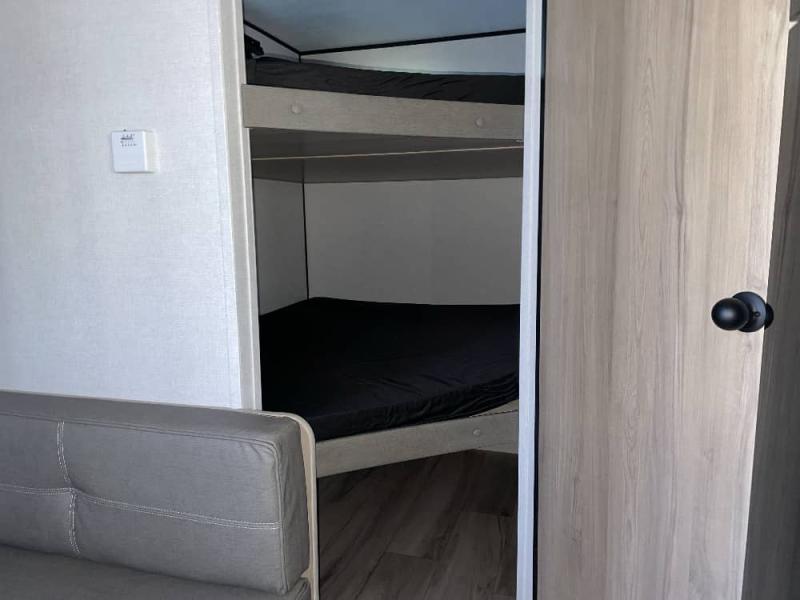 The whole gang will love camping in this no-slide bunkhouse travel trailer! While your guests take the bunks, you can have the queen bed in the front bedroom all to yourselves. There are also dual bedside wardrobes here and a privacy curtain for added convenience. A sofa and booth dinette provide seating space and additional sleeping space, and the full kitchen includes a two burner cooktop and microwave oven to cook meals. Head outdoors to enjoy the 16' power awning, or grab your fishing poles from the pass-through storage and head down to the lake. There is also outside storage under the bunks for even more camp gear!