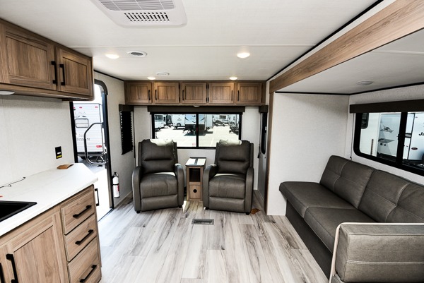 The spacious rear living area features a comfortable sofa and two recliner sofas, perfect for lounging and socializing. The booth dinette is a great spot for meals or added sleeping space for kids or guests. The kitchen is equipped with overhead cabinets for ample storage, a two-burner cooktop for culinary creativity, an air fryer for healthy and delicious meals, a refrigerator for keeping perishables and drinks fresh, and a pantry for storing snacks and ingredients The walk-through bathroom provides easy access and convenience, giving access to the front bedroom which boasts a spacious queen bed for restful sleep, dual wardrobes for storing clothing and essentials and a shelf for additional storage. In the outdoors of this travel trailer, you will find an exterior awning that provides shade and protection from the blazing sun, while the two entry/exit doors offer added convenience and flexibility.