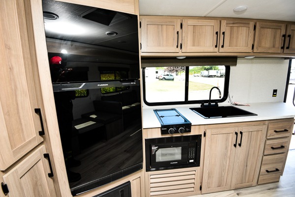 The spacious rear living area features a comfortable sofa and two recliner sofas, perfect for lounging and socializing. The booth dinette is a great spot for meals or added sleeping space for kids or guests. The kitchen is equipped with overhead cabinets for ample storage, a two-burner cooktop for culinary creativity, an air fryer for healthy and delicious meals, a refrigerator for keeping perishables and drinks fresh, and a pantry for storing snacks and ingredients The walk-through bathroom provides easy access and convenience, giving access to the front bedroom which boasts a spacious queen bed for restful sleep, dual wardrobes for storing clothing and essentials and a shelf for additional storage. In the outdoors of this travel trailer, you will find an exterior awning that provides shade and protection from the blazing sun, while the two entry/exit doors offer added convenience and flexibility.
