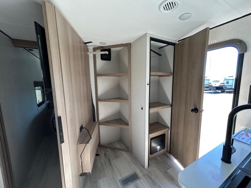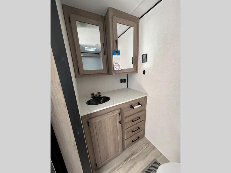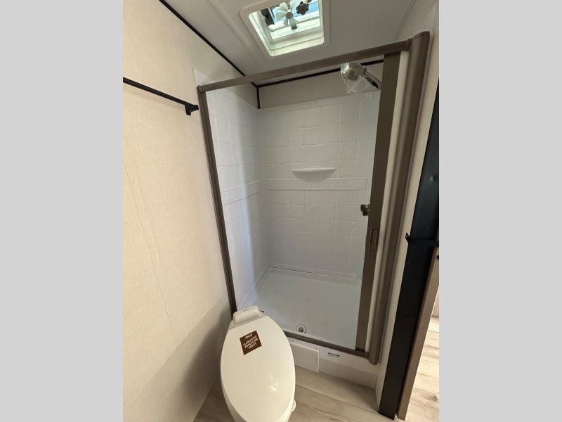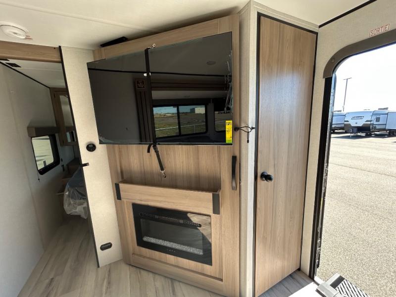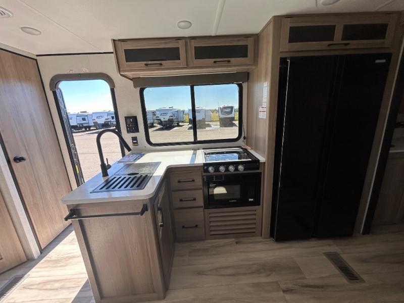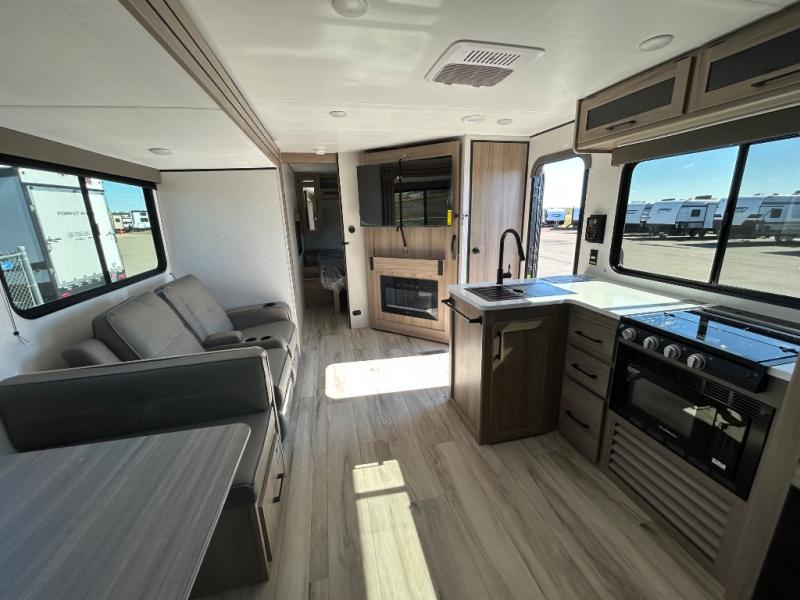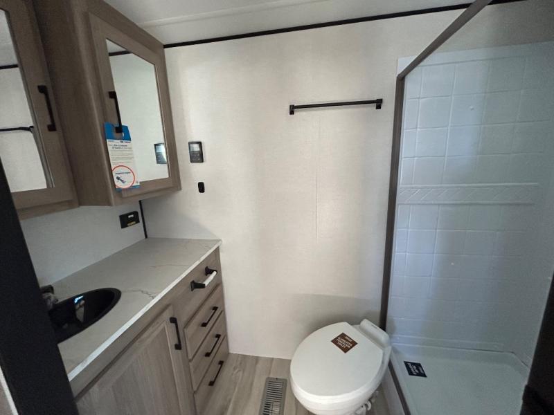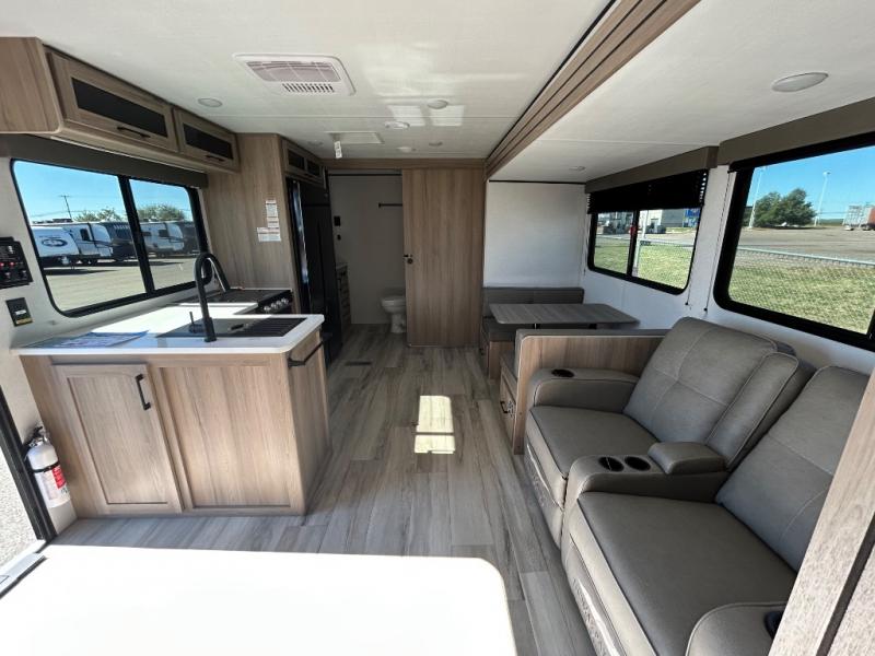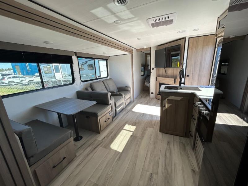 Time spent in this spacious travel trailer will be time well spent! You can wake up feeling refreshed each morning on the king-size bed in the front bedroom. There are dual bedside wardrobes and nightstands to keep your things tidy, and the full rear bath will let you freshen up before heading to the kitchen. Whip up your favorite breakfast with the three burner cooktop or the air fryer/convection microwave. There is a booth dinette where you can dine together, and a theater seat for relaxing. And if you have an overnight guest or two little ones, they can convert the dinette to sleeping space!