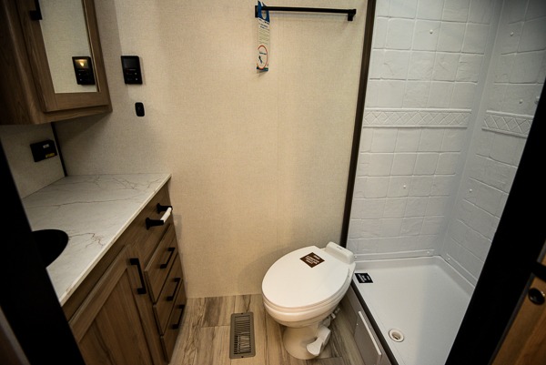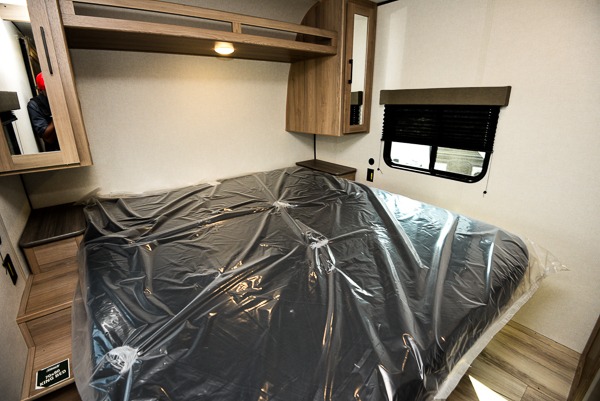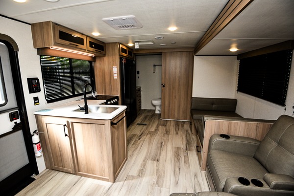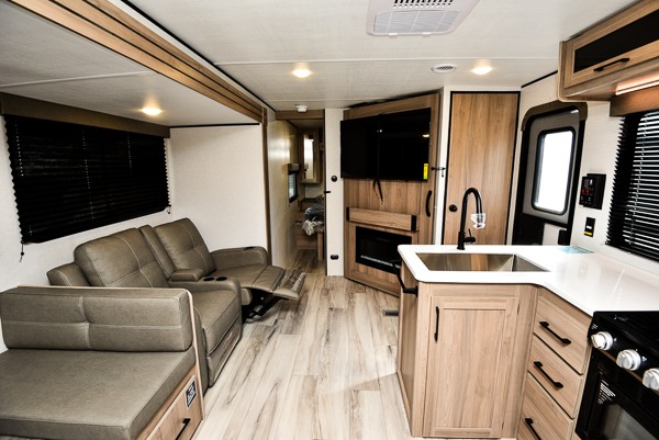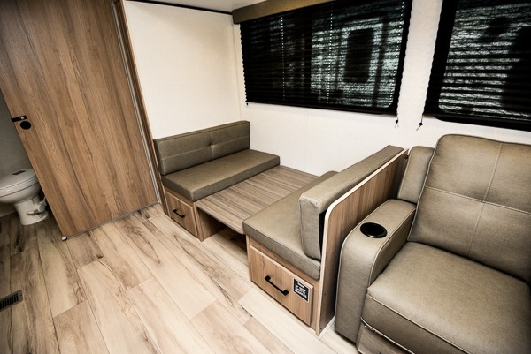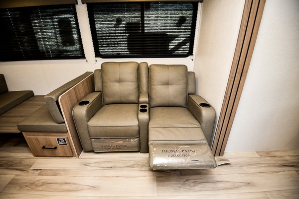 Time spent in this spacious travel trailer will be time well spent! You can wake up feeling refreshed each morning on the king-size bed in the front bedroom. There are dual bedside wardrobes and nightstands to keep your things tidy, and the full rear bath will let you freshen up before heading to the kitchen. Whip up your favorite breakfast with the three burner cooktop or the air fryer/convection microwave. There is a booth dinette where you can dine together, and a theater seat for relaxing. And if you have an overnight guest or two little ones, they can convert the dinette to sleeping space!