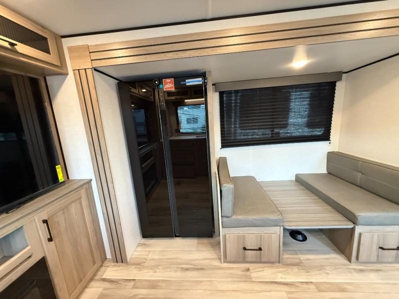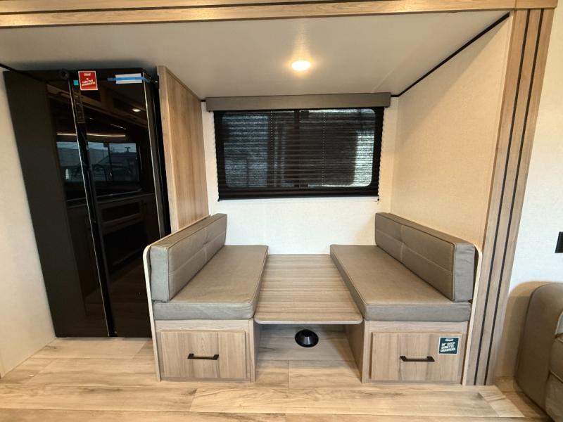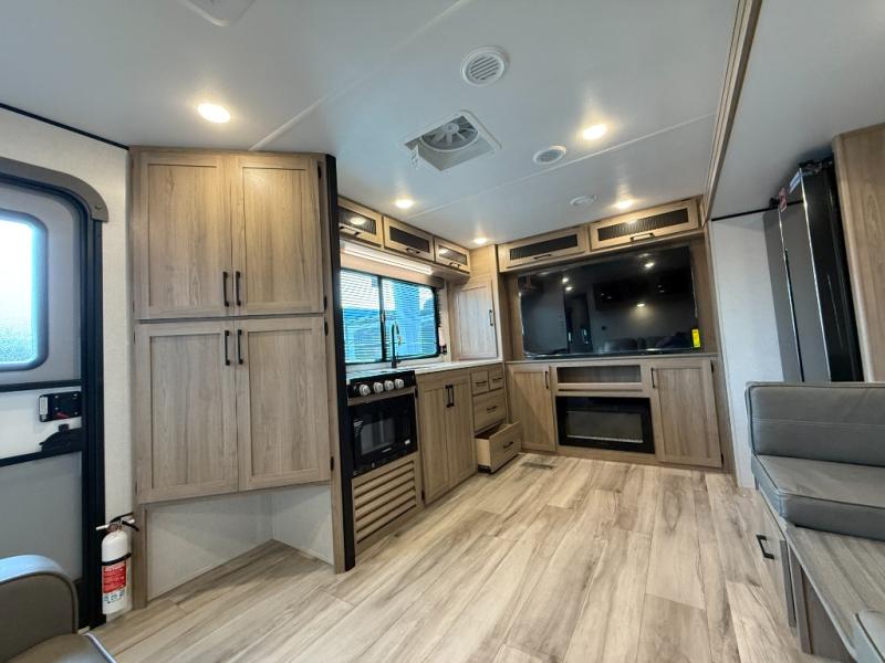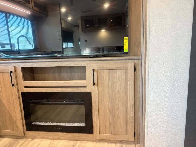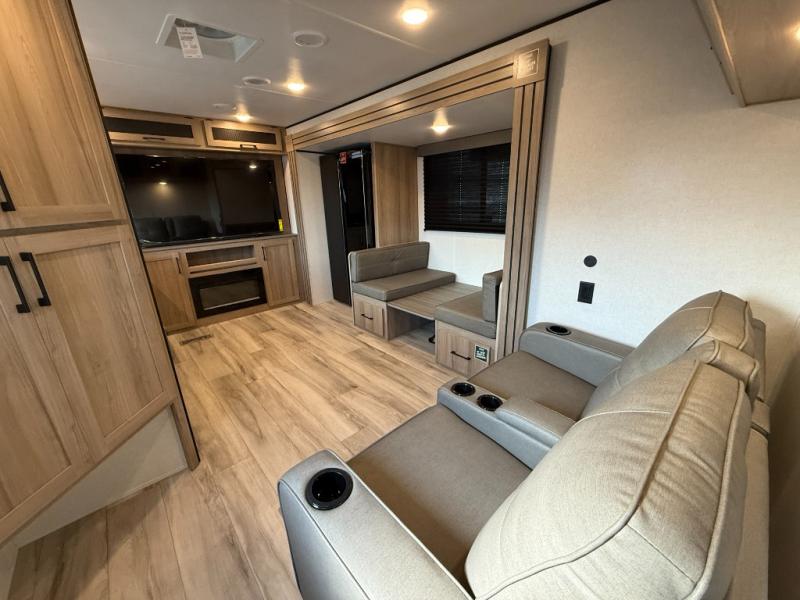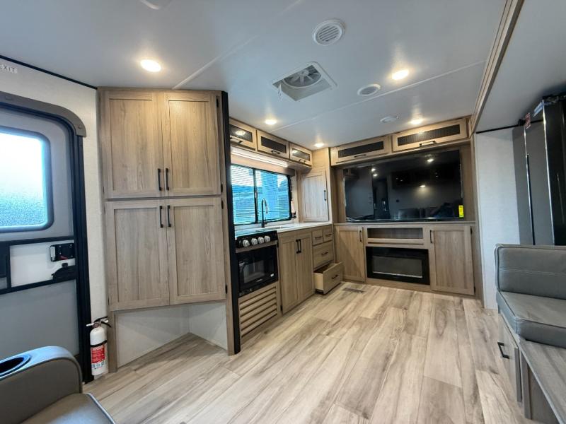 Camping trips are made complete in this travel trailer with a large slide and lots of comfort! There is theater seating in direct view of the 65" TV and fireplace for cozy evenings indoors, and the booth dinette provides a place to dine, play games, and let a guest sleep over. The chef of your crew can make meals on the three burner range or in the air fryer/convection microwave, and there is plenty of counter space to set out a veggie tray while dinner is being made. A full bath and front private bedroom include sliding doors to save on space, and you're sure to get a great night's rest on the king bed!