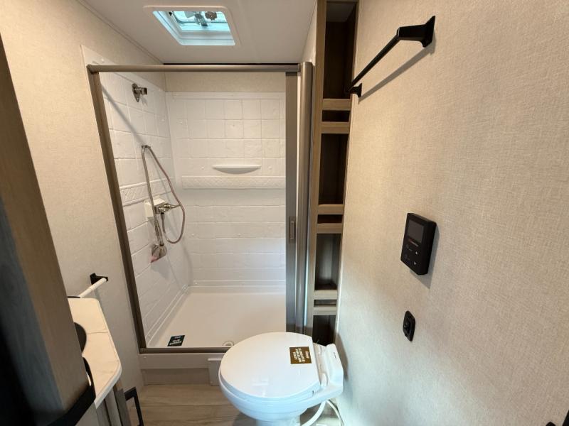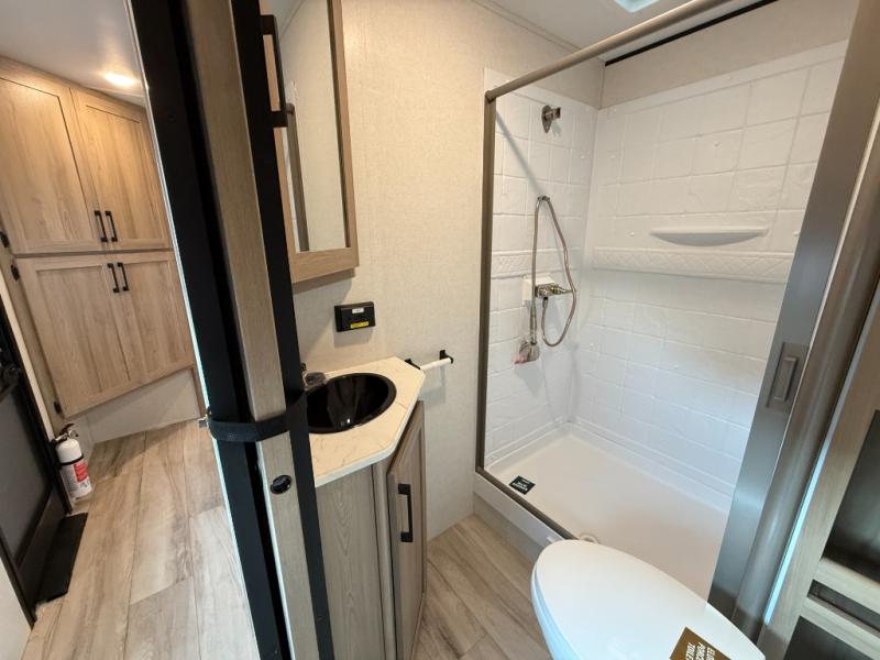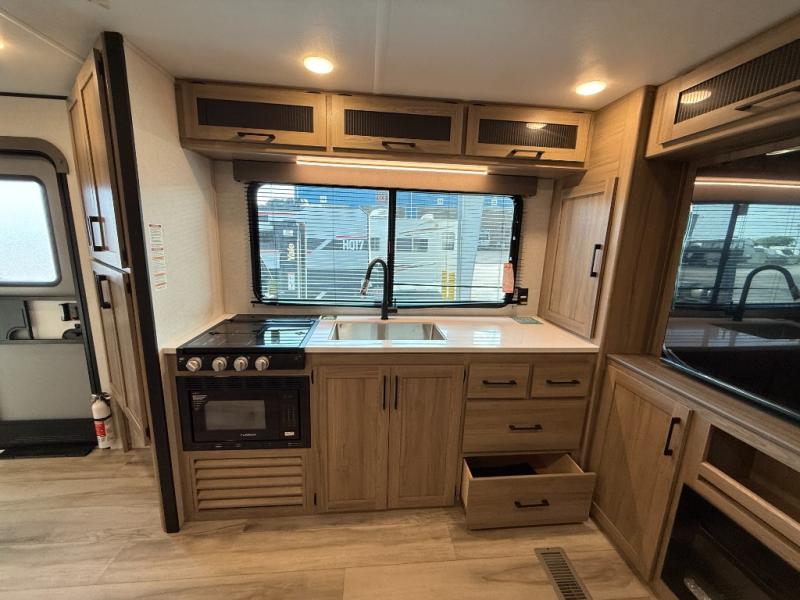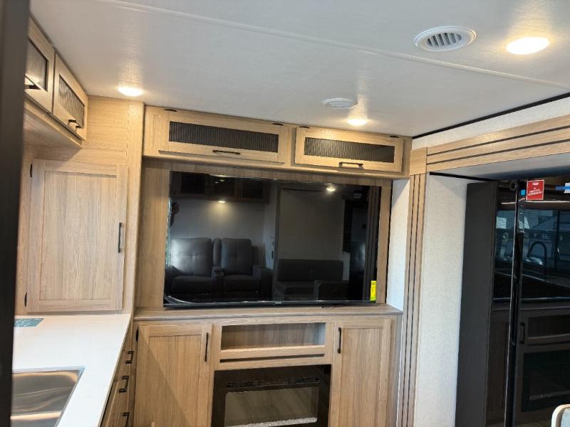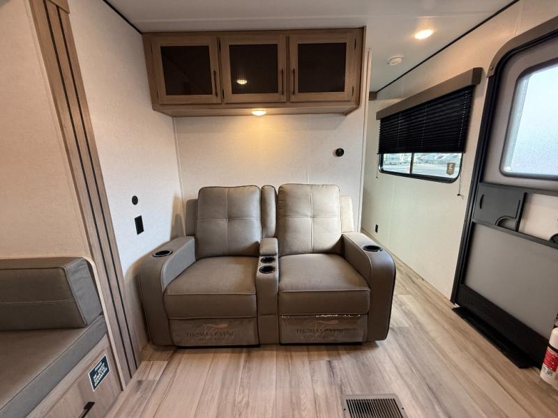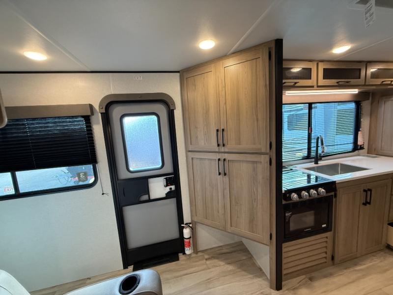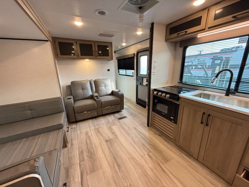 Camping trips are made complete in this travel trailer with a large slide and lots of comfort! There is theater seating in direct view of the 65" TV and fireplace for cozy evenings indoors, and the booth dinette provides a place to dine, play games, and let a guest sleep over. The chef of your crew can make meals on the three burner range or in the air fryer/convection microwave, and there is plenty of counter space to set out a veggie tray while dinner is being made. A full bath and front private bedroom include sliding doors to save on space, and you're sure to get a great night's rest on the king bed!