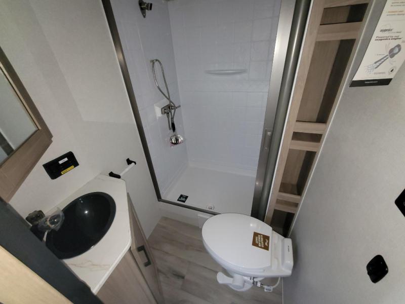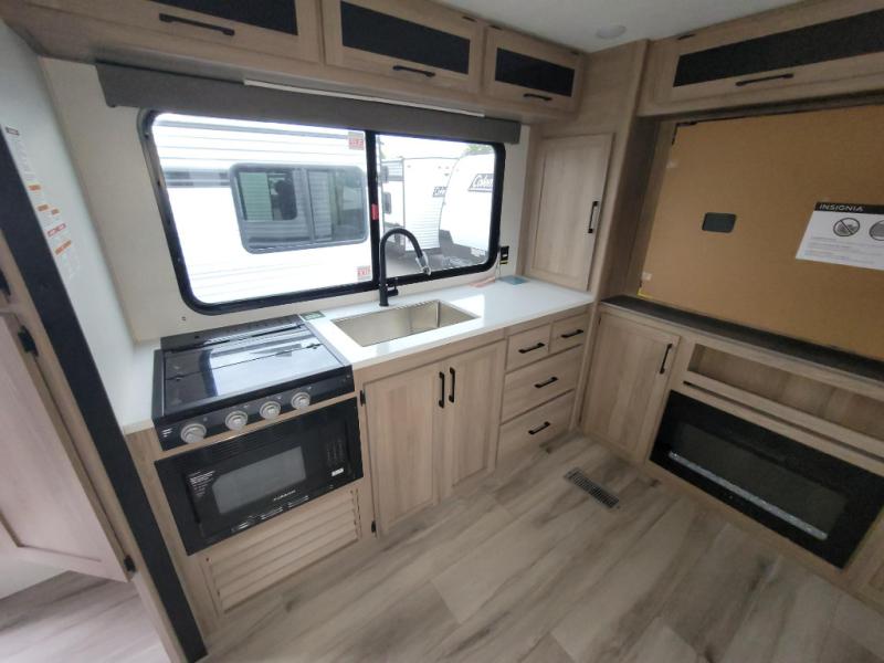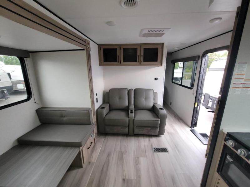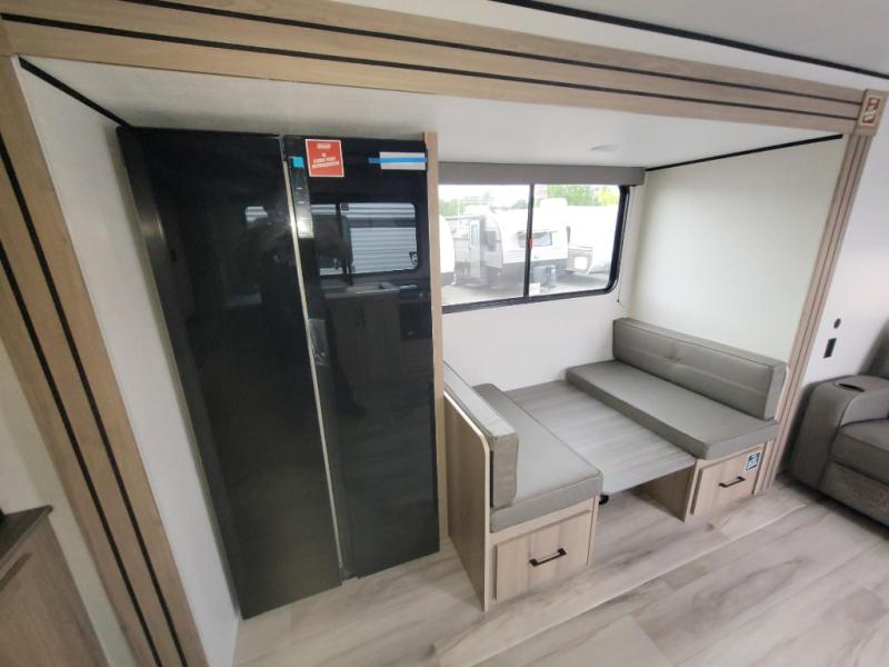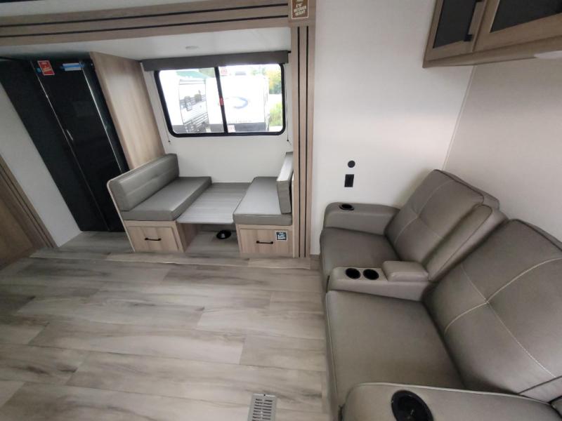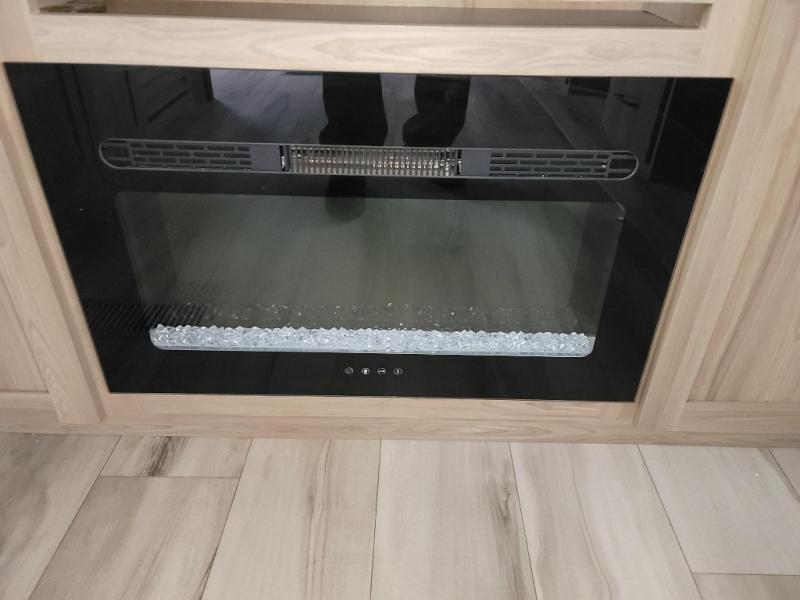 Camping trips are made complete in this travel trailer with a large slide and lots of comfort! There is theater seating in direct view of the 65" TV and fireplace for cozy evenings indoors, and the booth dinette provides a place to dine, play games, and let a guest sleep over. The chef of your crew can make meals on the three burner range or in the air fryer/convection microwave, and there is plenty of counter space to set out a veggie tray while dinner is being made. A full bath and front private bedroom include sliding doors to save on space, and you're sure to get a great night's rest on the king bed!