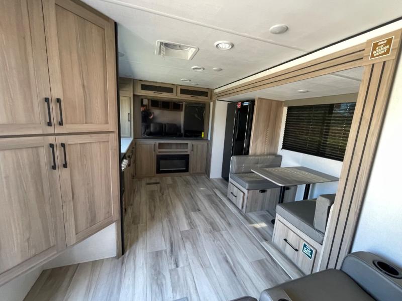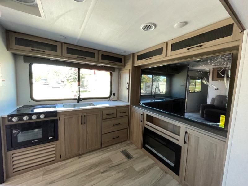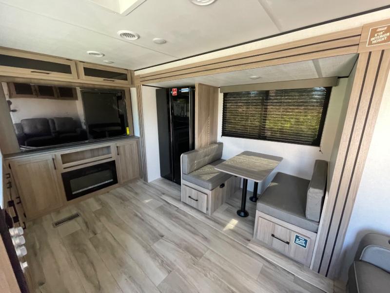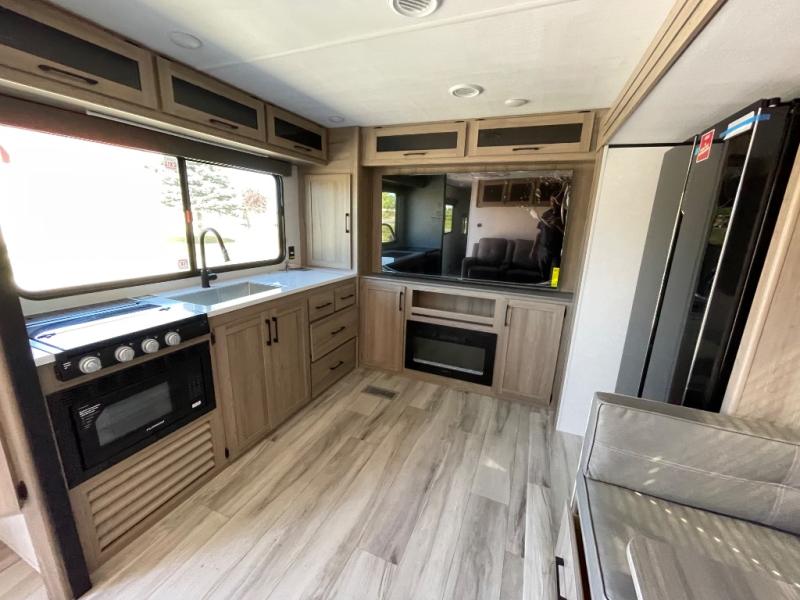 Inside, the large slide opens up the living area so you can relax in theater seating directly across from the 65" LED smart TV and electric fireplace. The booth dinette provides a dedicated place for meals, cards and extra sleeping space when friends or family join you. Cooking is a pleasure with dual pantries, solid-surface countertops, a three-burner range and an air fryer/convection microwave; there's even plenty of counter space for prepping.