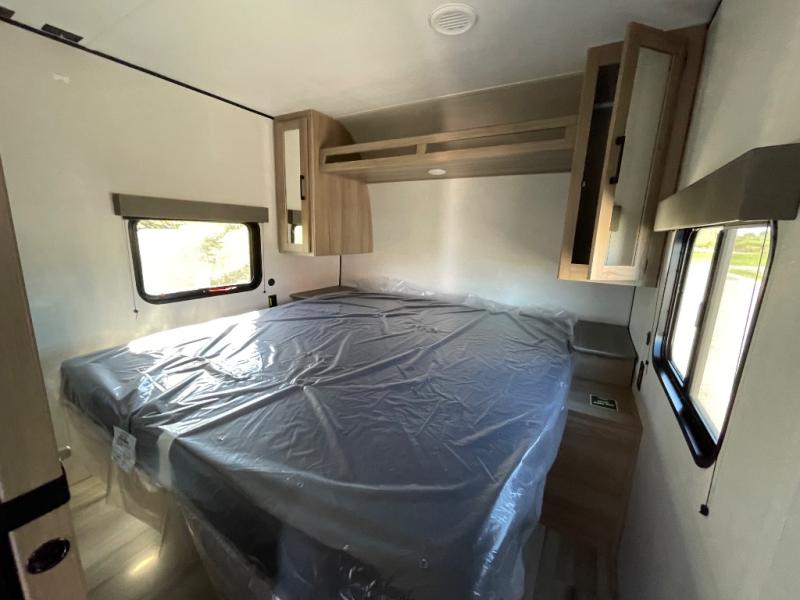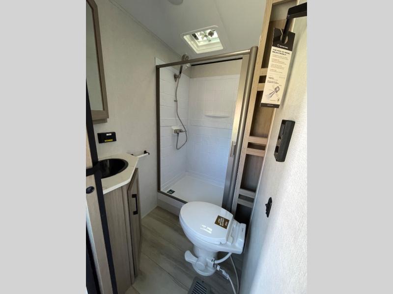 A sliding door separates the full bathroom with a 30" x 40" shower, tankless water heater and linen storage. At the front is your private king-size bedroom with wardrobes and overhead cabinets, plus bedside outlets for CPAP machines or devices. Exterior features include a power awning, quick-drop stabilizer jacks, power tongue jack and a full pass-through storage compartment with extra-tall doors so you can bring along chairs, grills and gear.
