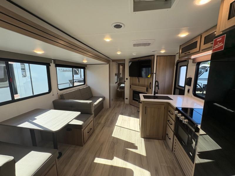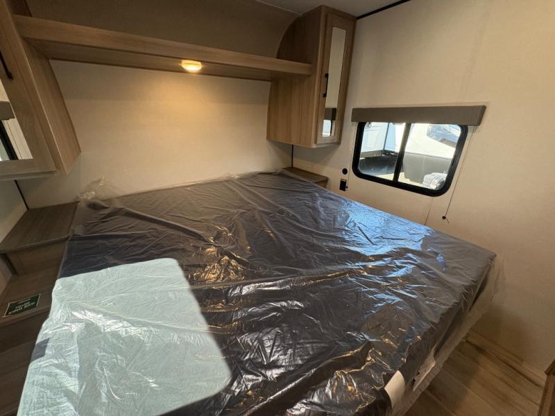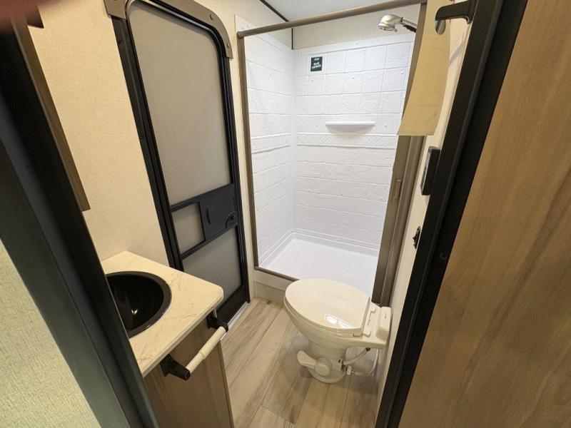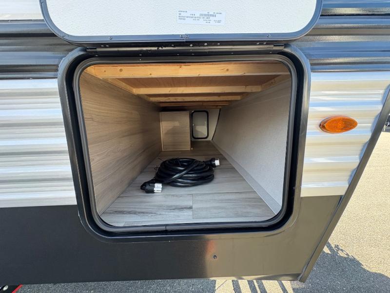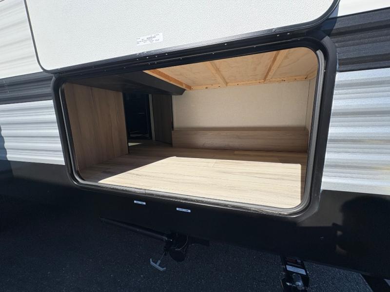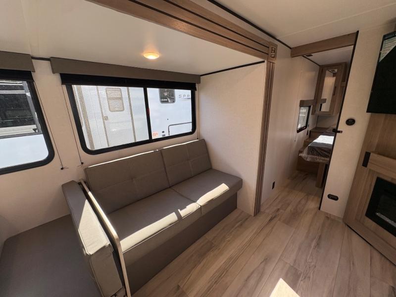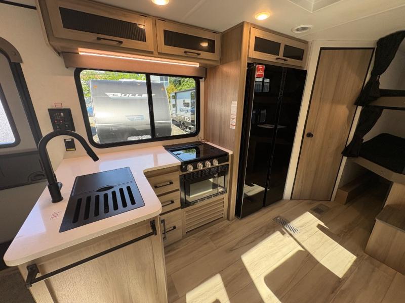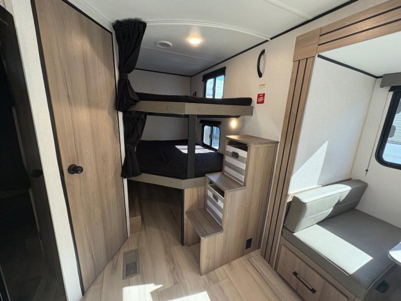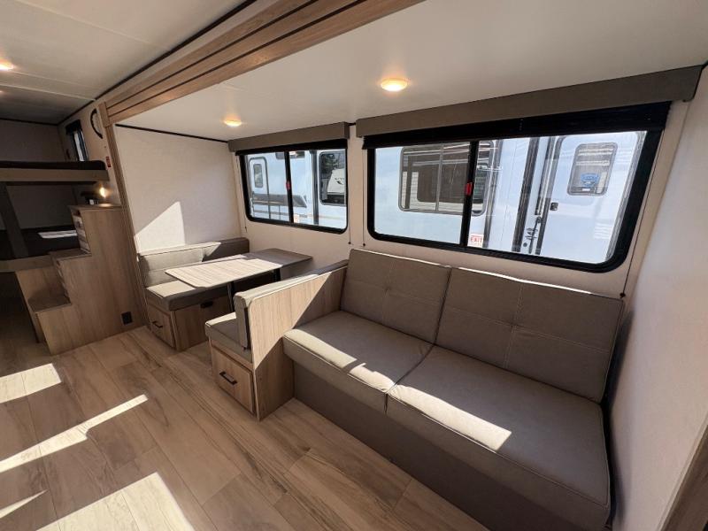If you're needing additional sleeping space and added comfort in your next RV, this travel trailer is the one! There are double-size bunks with steps in the back for your guests or little ones, and the full bath includes one of the dual entry doors to the unit for added convenience. The combined kitchen and living area is made spacious thanks to the large slide out which houses the sofa and booth dinette. You can make meals on the three burner range or in the air fryer/convection microwave, and there is a 16 cu. ft. 12V refrigerator to keep food fresh. A 50" TV and fireplace features hidden shelves behind it for smart storage space plus there is an entryway pantry for snacks galore! Outside, the 21' power awning will provide shade as you visit in your camp chairs, and there is a 2.6 cu. ft. outdoor refrigerator to keep cold drinks on hand!
