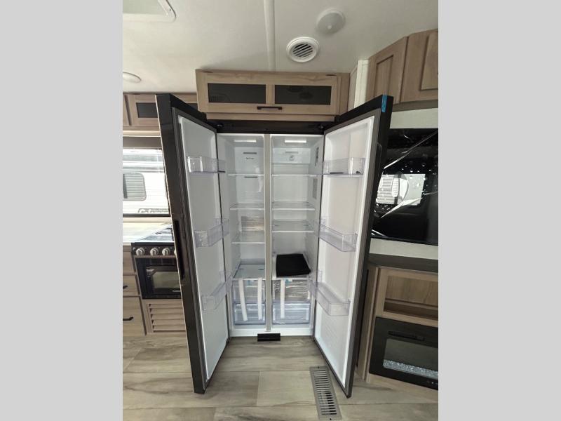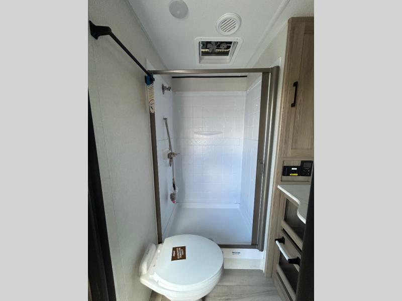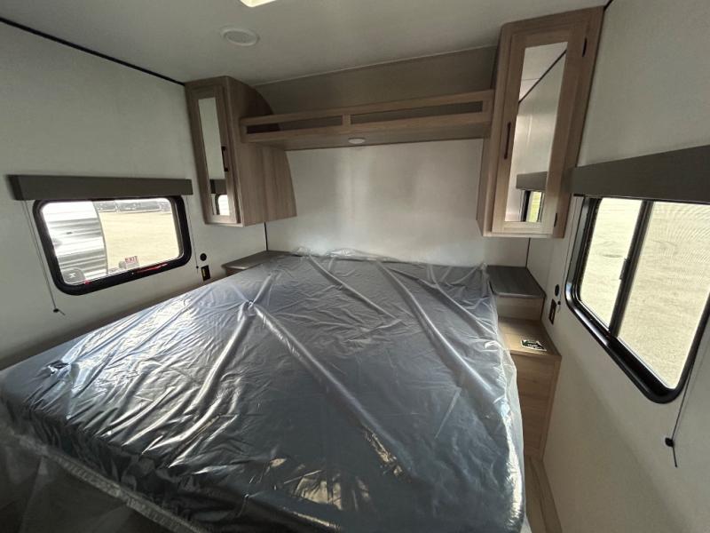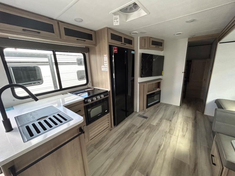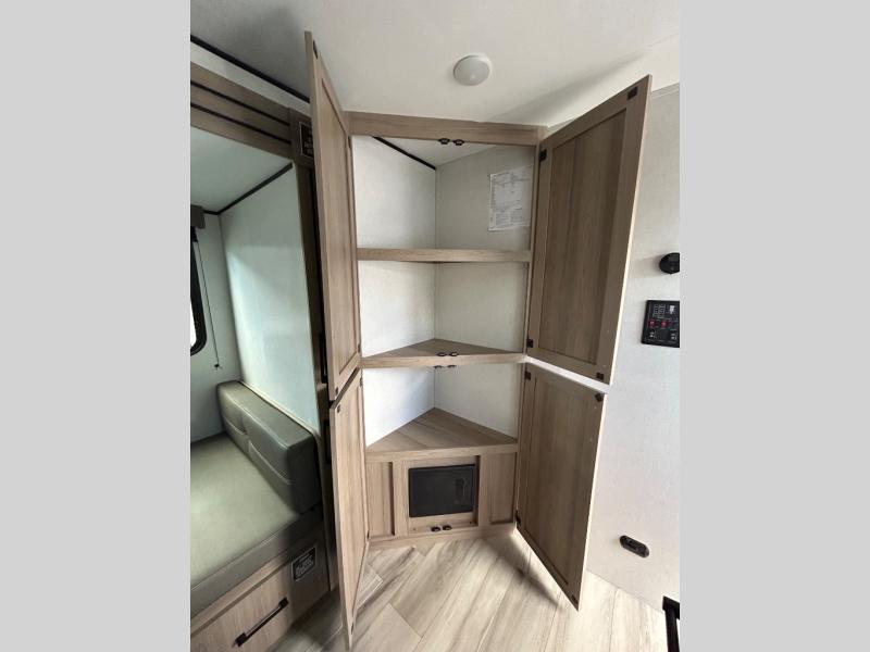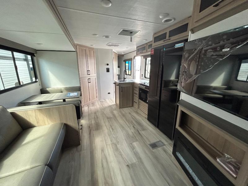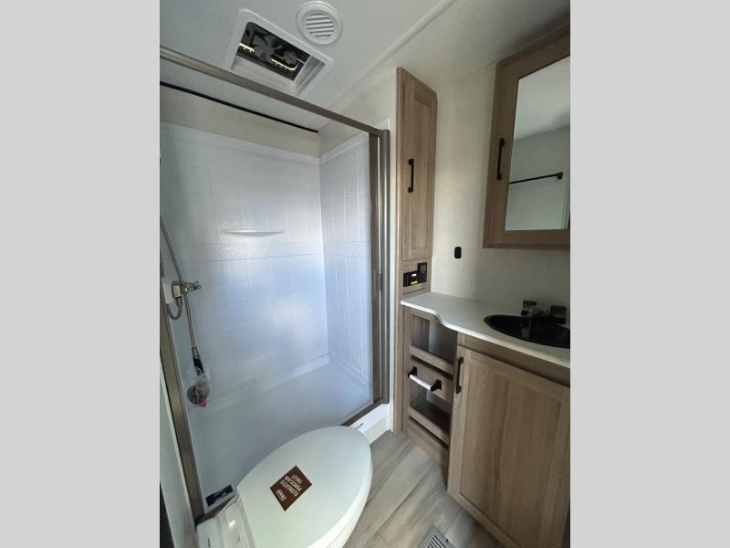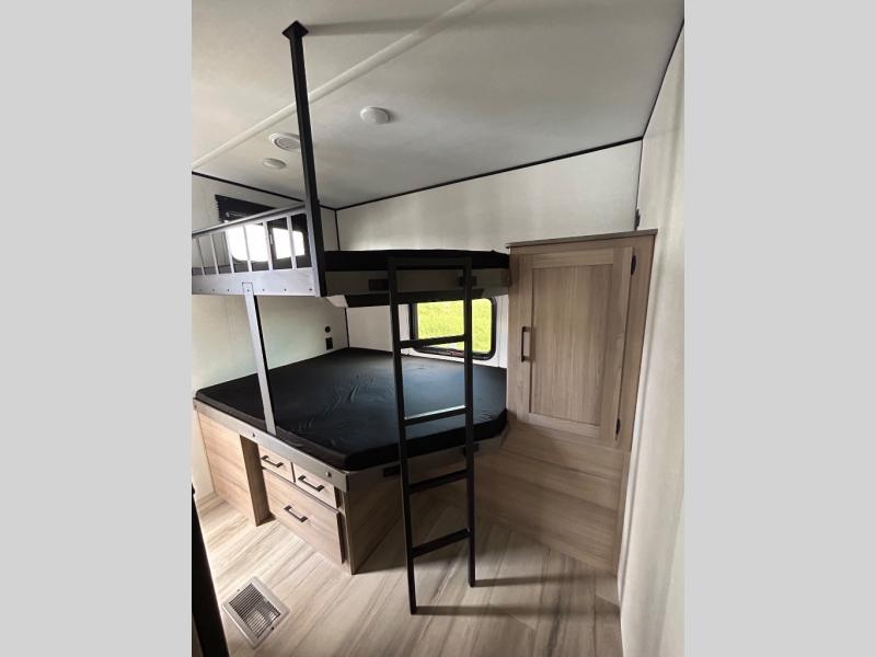 For those who enjoy camping with a larger group, this unit will be perfect! There is a rear private bunkhouse with double-size bunks, a wardrobe, and a half bath with one of the dual entry doors to the unit. The other entry door leads into the main living area and combined kitchen. Here, your crew can dine at the booth dinette, relax on the sofa, and watch a movie with the 50" TV. There is also a fireplace here to make it more cozy, and the pantry across the room can hold all the snacks. The full bath is right next to the front private bedroom where you'll find a king bed, dual bedside wardrobes and nightstands, plus a third wardrobe for ample storage space!