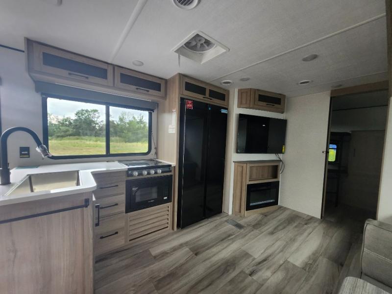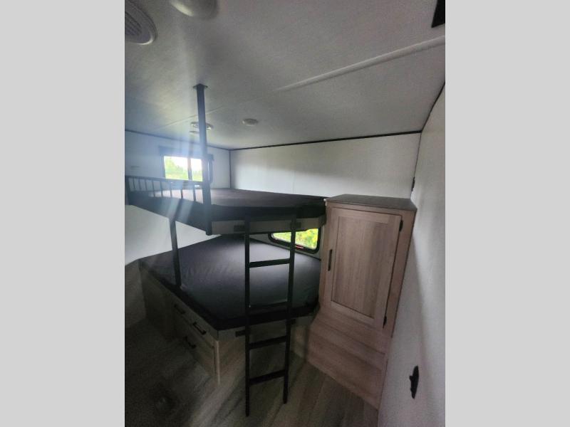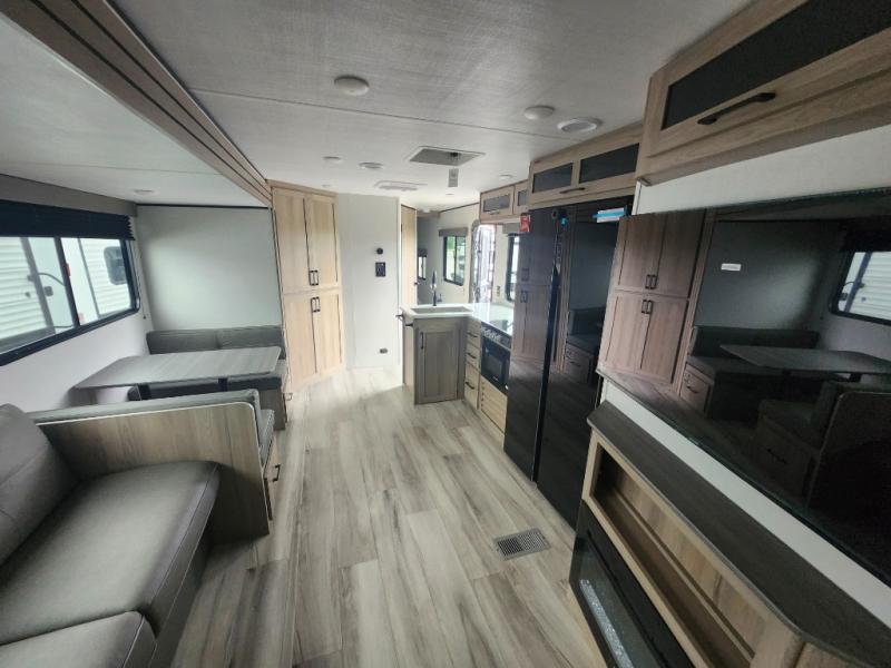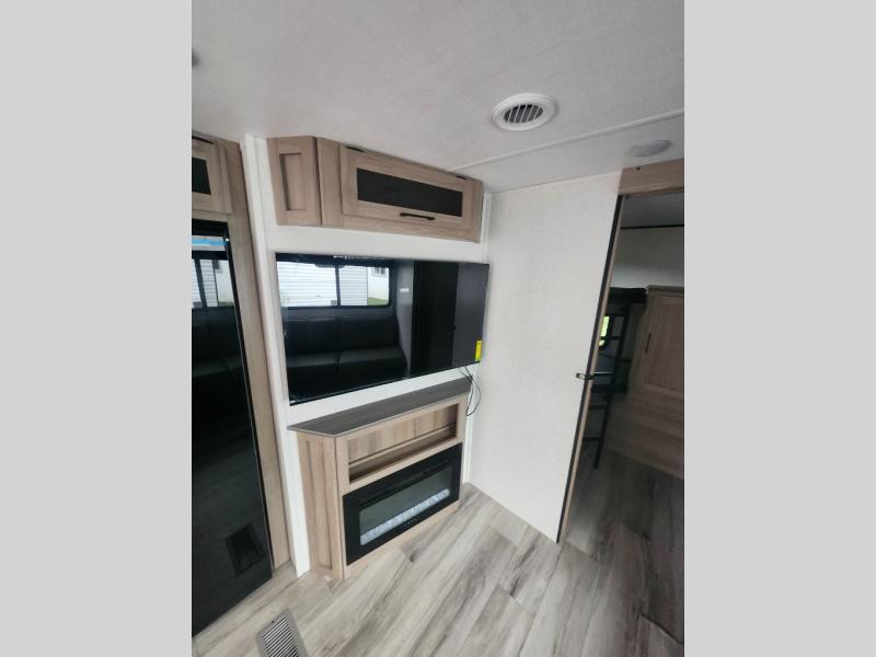 For those who enjoy camping with a larger group, this unit will be perfect! There is a rear private bunkhouse with double-size bunks, a wardrobe, and a half bath with one of the dual entry doors to the unit. The other entry door leads into the main living area and combined kitchen. Here, your crew can dine at the booth dinette, relax on the sofa, and watch a movie with the 50" TV. There is also a fireplace here to make it more cozy, and the pantry across the room can hold all the snacks. The full bath is right next to the front private bedroom where you'll find a king bed, dual bedside wardrobes and nightstands, plus a third wardrobe for ample storage space!