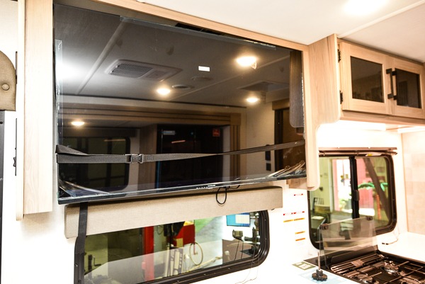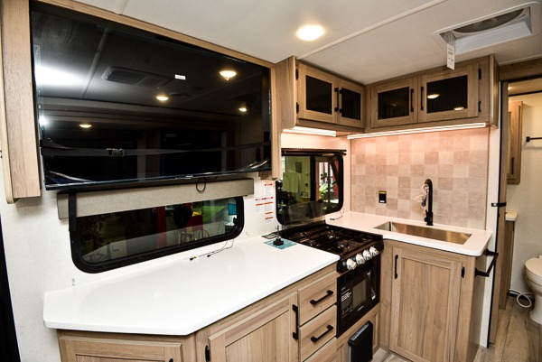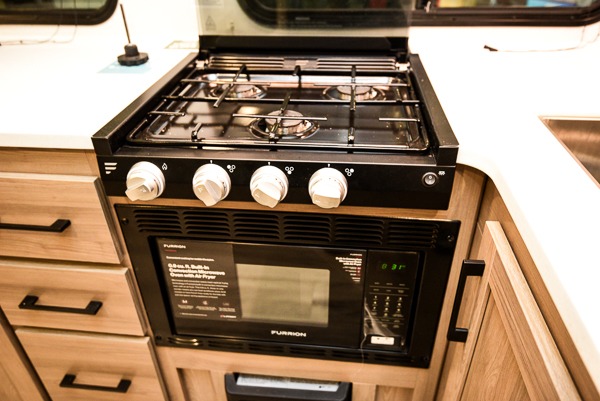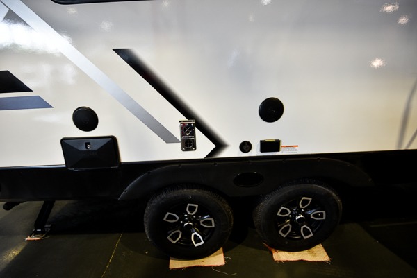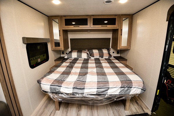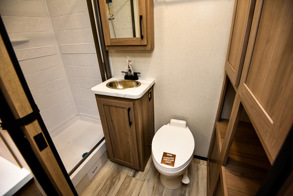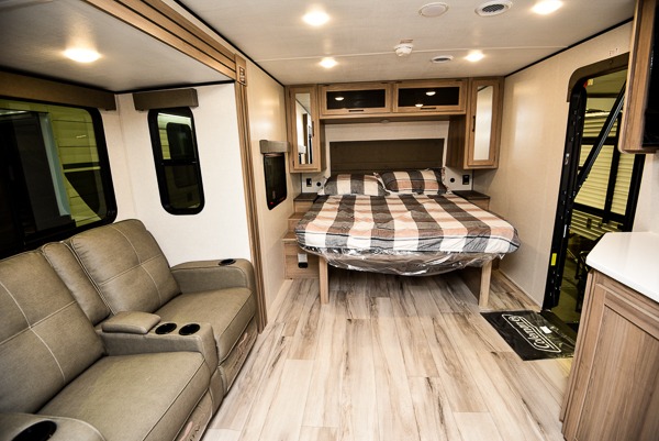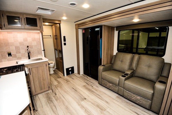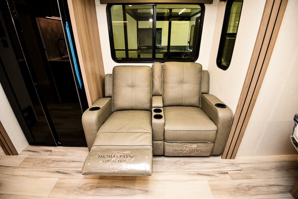 You can't go wrong with this couple's trailer! Once you arrive at the campground, you can unload the pass-through storage, then put out the 16' power awning and relax in your camp chairs. The theater seating with a removable table provides a place to relax inside if the weather isn't cooperating, and there is a 50" TV if you want to stay indoors all day and watch movies! You can make lunch on the three burner cooktop or in the air fryer/convection microwave when you get hungry, and there is a 16 cu. ft. 12V refrigerator to keep cold items fresh. The full rear bath includes a 30" x 40" spacious shower, a large linen closet, and a medicine cabinet to name a few comforts!