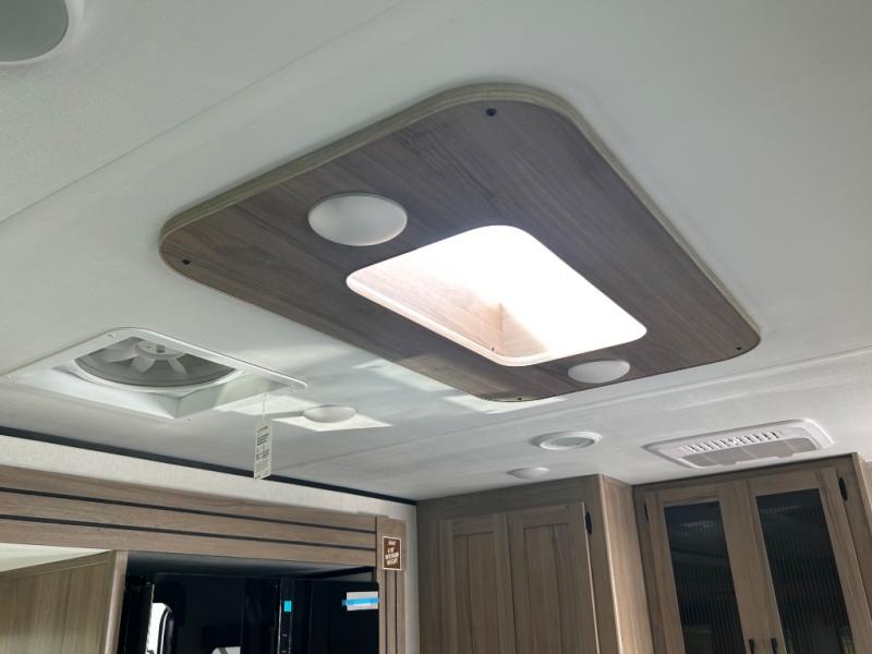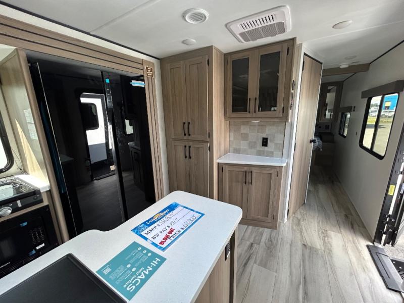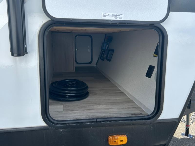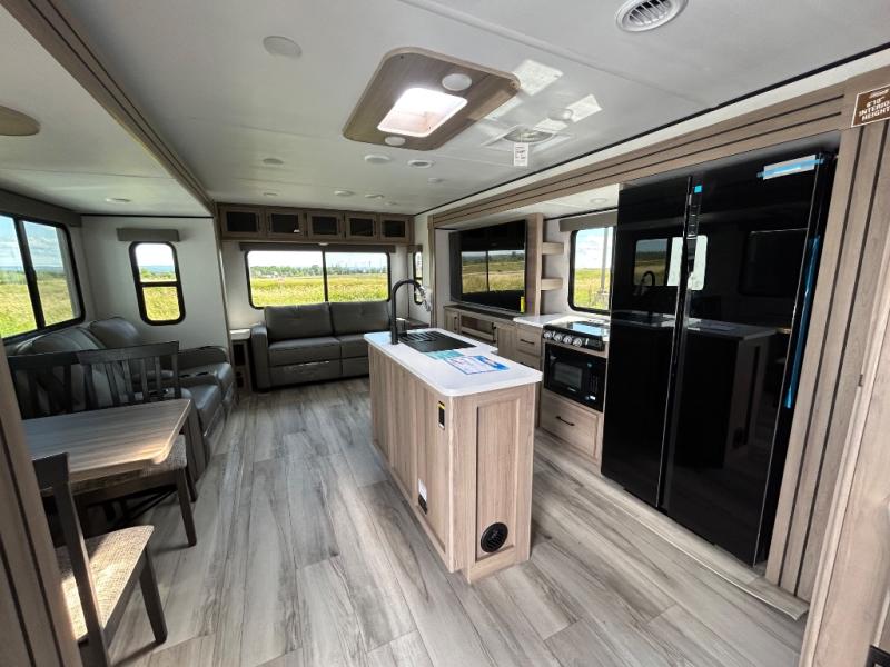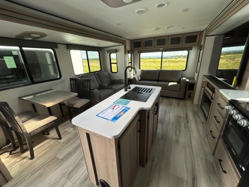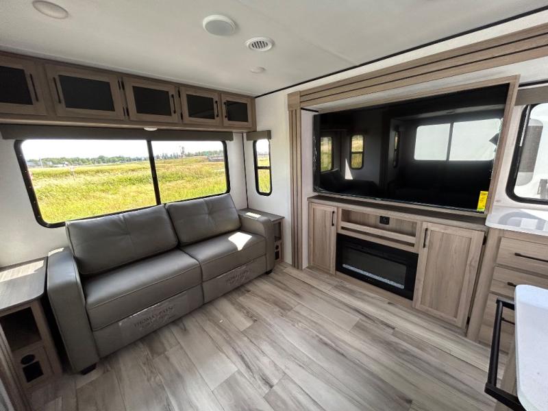 It won't be hard to find comfort in this travel trailer with dual opposing slides! These slides will provide a more open floorplan and allow the chef of your group more space to prep meals on the kitchen island. There is also an air fryer/convection microwave, a three burner gas range, plus a pantry and 16 cu. ft. 12V refrigerator for food storage. A free-standing dinette provides a place to dine together, and a rear tri-fold sofa gives your guests a place to sleep at night. There is also a theater seat directly across from the 65" TV and fireplace to for easy viewing! A full bath on board removes the need to use the camp's facilities, and you'll feel right at home in the front private bedroom with a king bed!