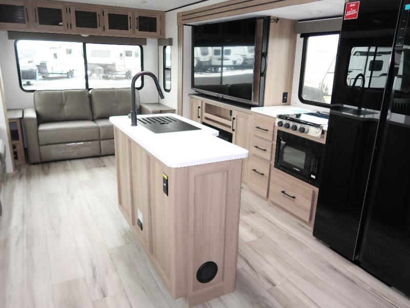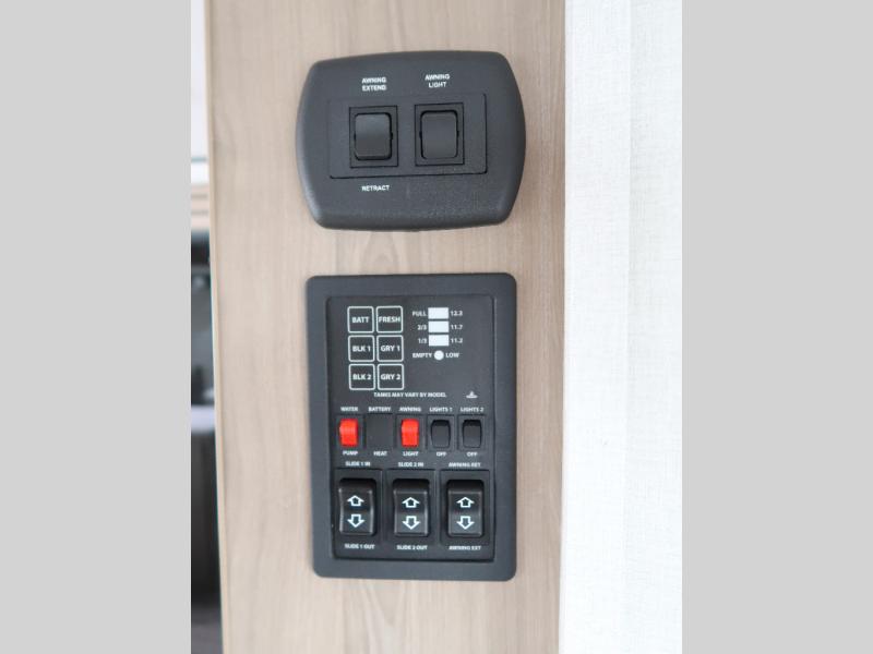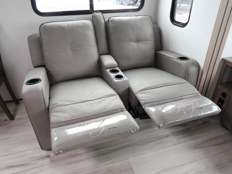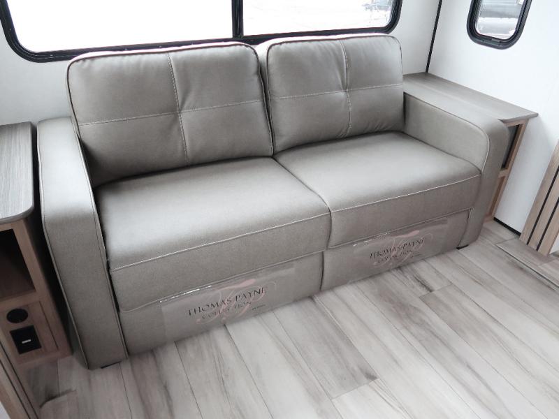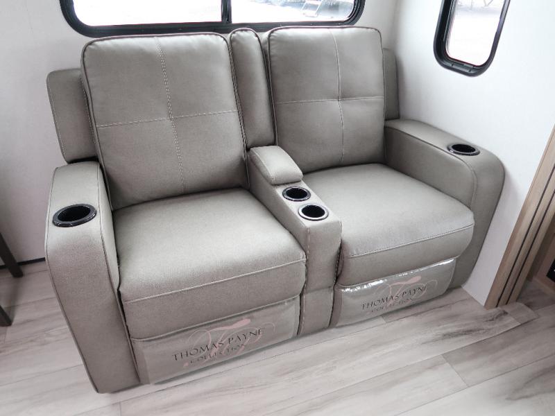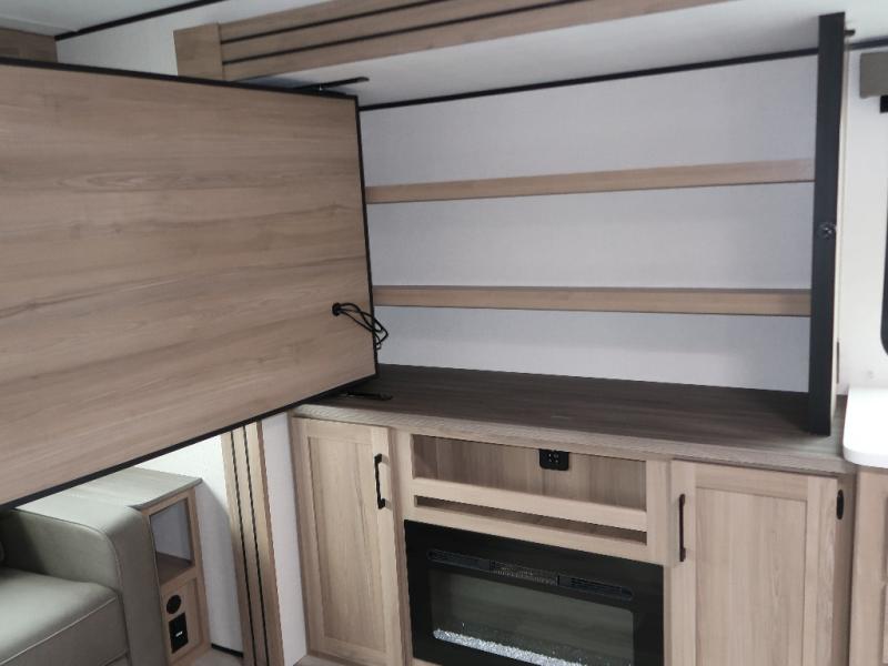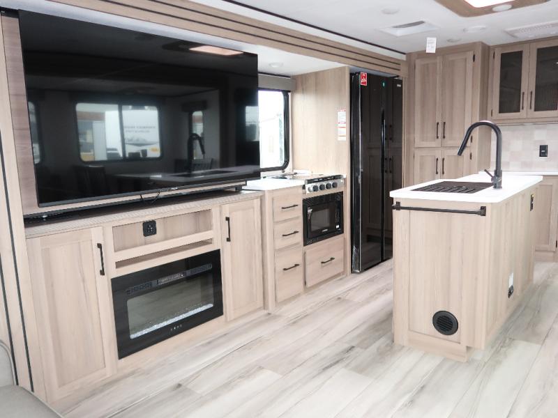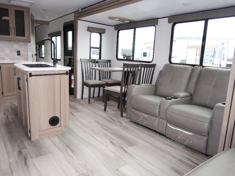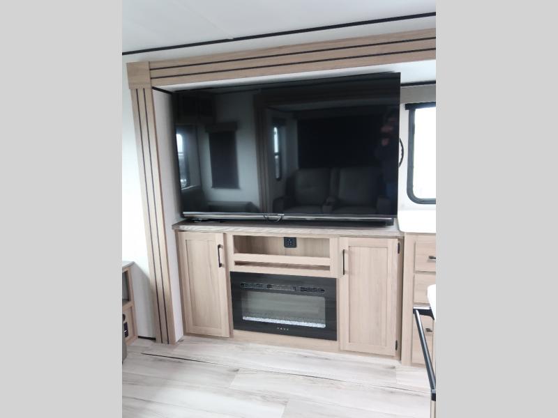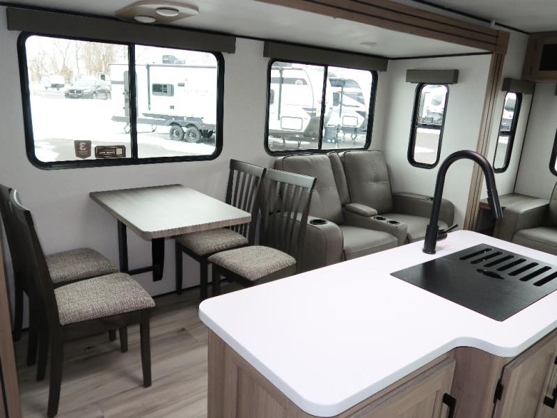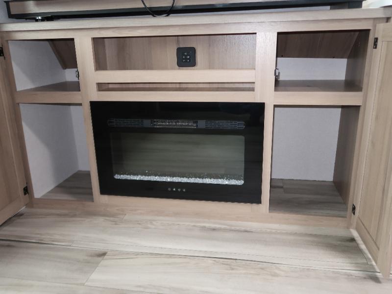 It won't be hard to find comfort in this travel trailer with dual opposing slides! These slides will provide a more open floorplan and allow the chef of your group more space to prep meals on the kitchen island. There is also an air fryer/convection microwave, a three burner gas range, plus a pantry and 16 cu. ft. 12V refrigerator for food storage. A free-standing dinette provides a place to dine together, and a rear tri-fold sofa gives your guests a place to sleep at night. There is also a theater seat directly across from the 65" TV and fireplace to for easy viewing! A full bath on board removes the need to use the camp's facilities, and you'll feel right at home in the front private bedroom with a king bed!