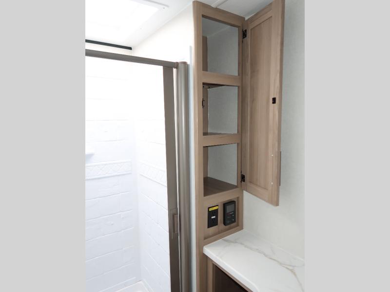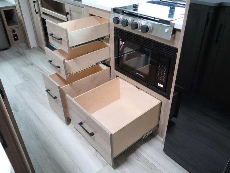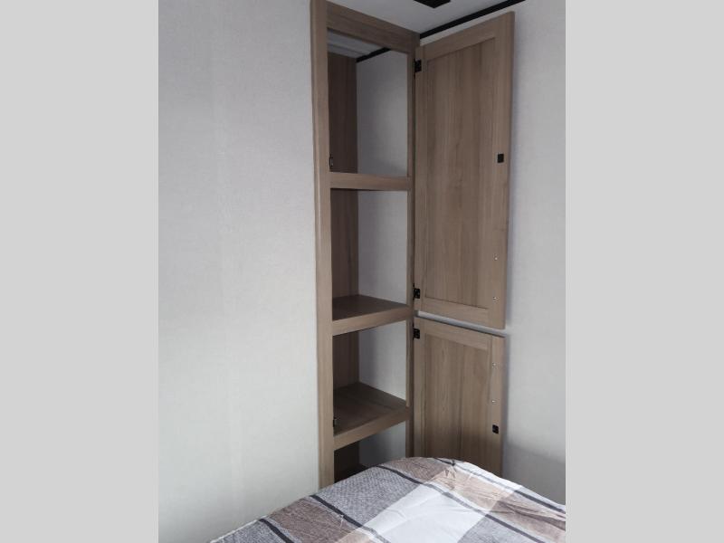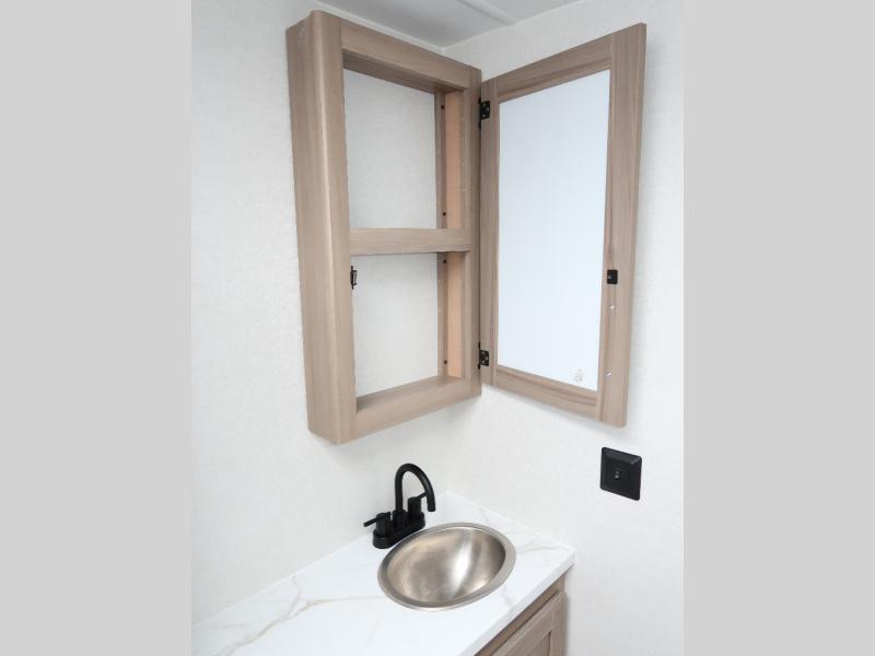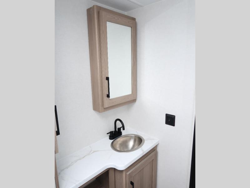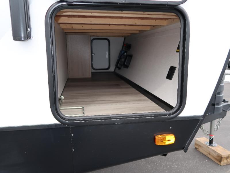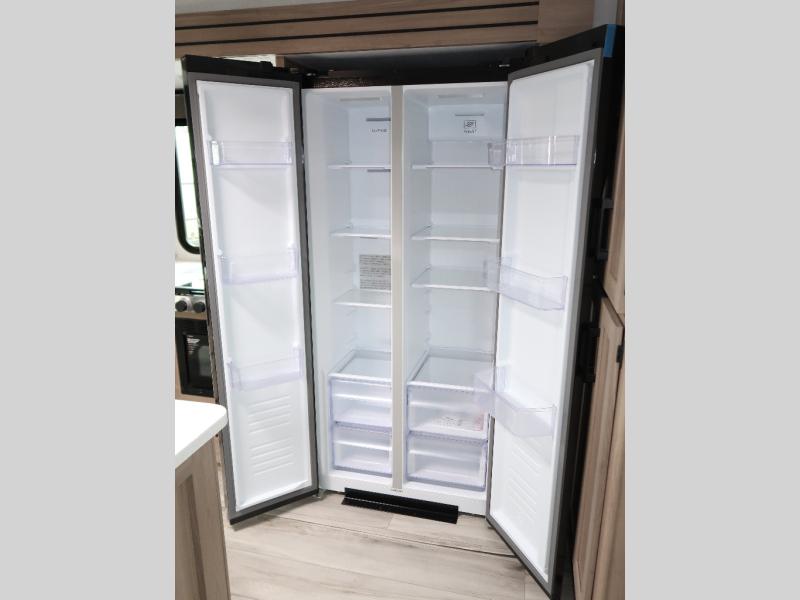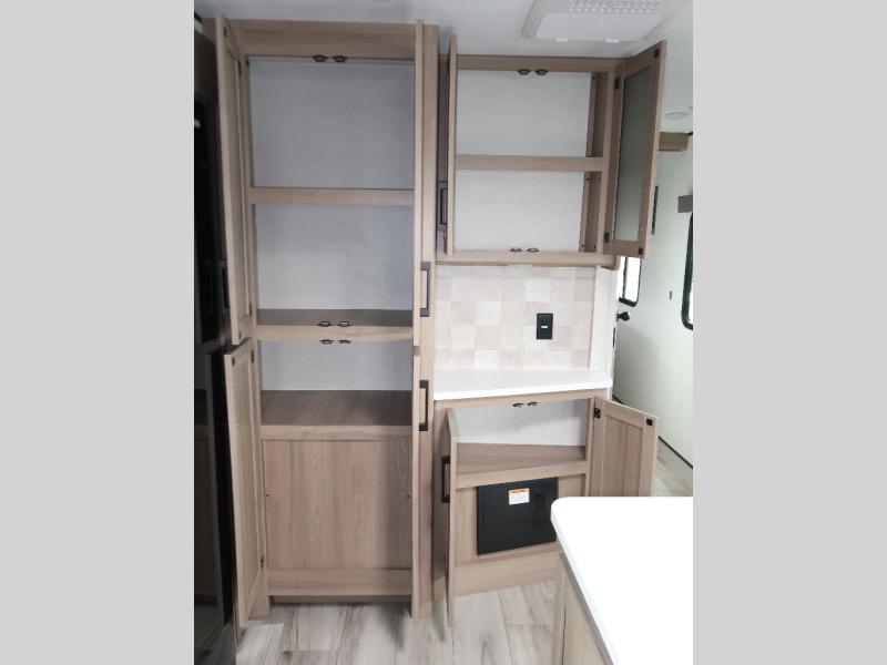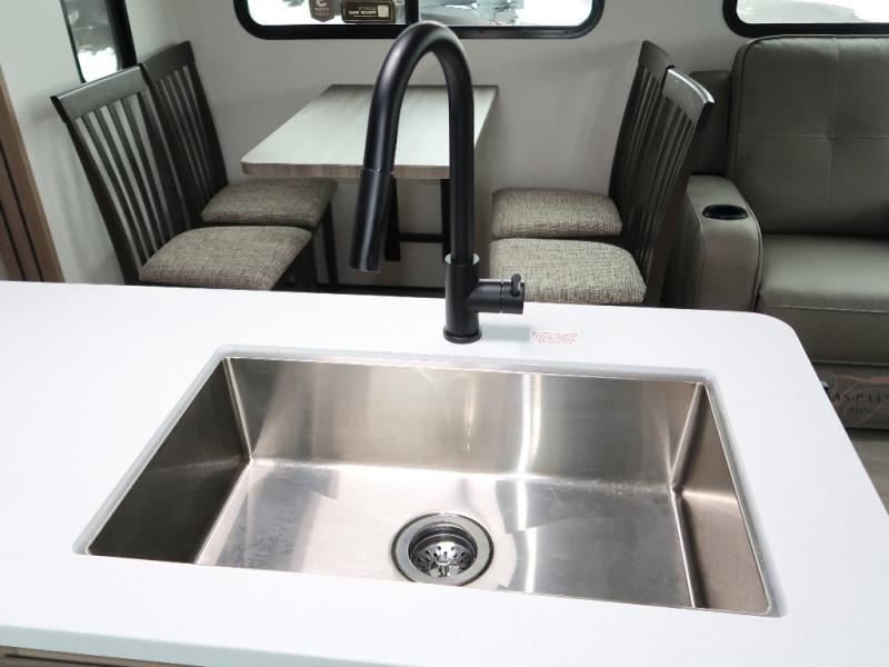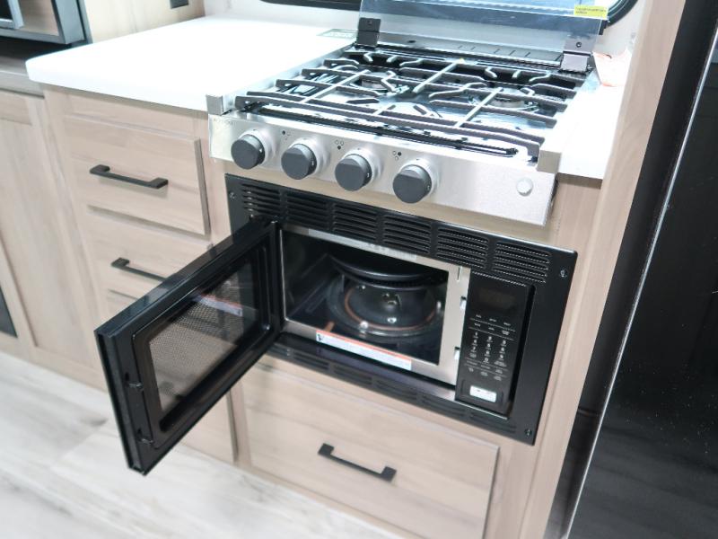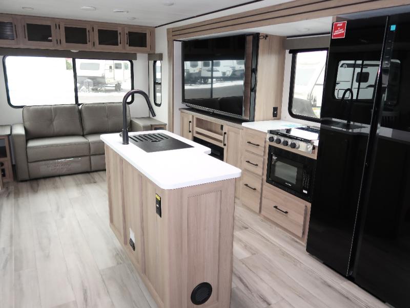 It won't be hard to find comfort in this travel trailer with dual opposing slides! These slides will provide a more open floorplan and allow the chef of your group more space to prep meals on the kitchen island. There is also an air fryer/convection microwave, a three burner gas range, plus a pantry and 16 cu. ft. 12V refrigerator for food storage. A free-standing dinette provides a place to dine together, and a rear tri-fold sofa gives your guests a place to sleep at night. There is also a theater seat directly across from the 65" TV and fireplace to for easy viewing! A full bath on board removes the need to use the camp's facilities, and you'll feel right at home in the front private bedroom with a king bed!