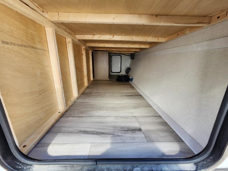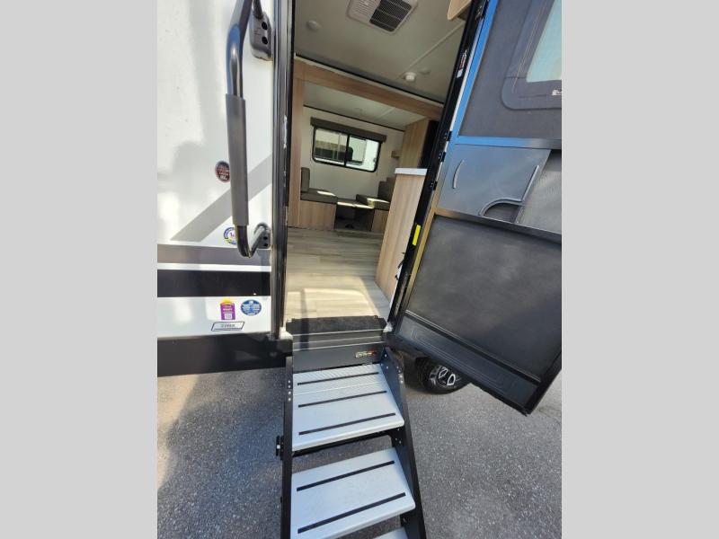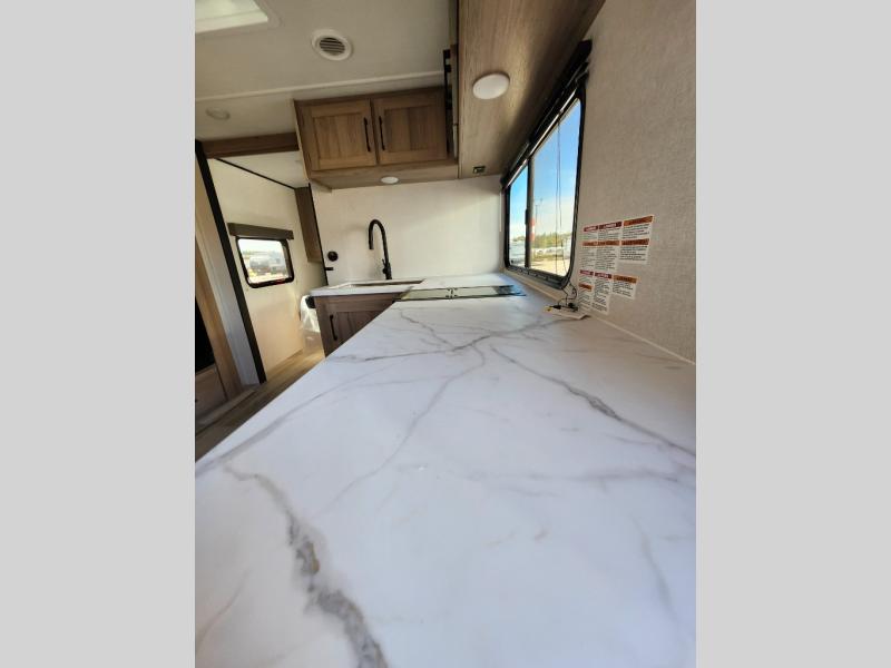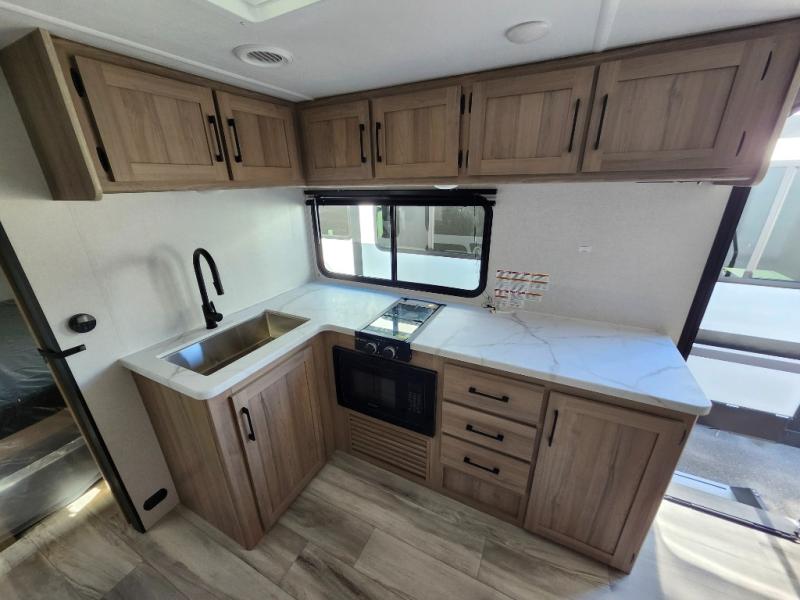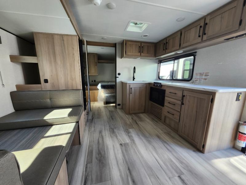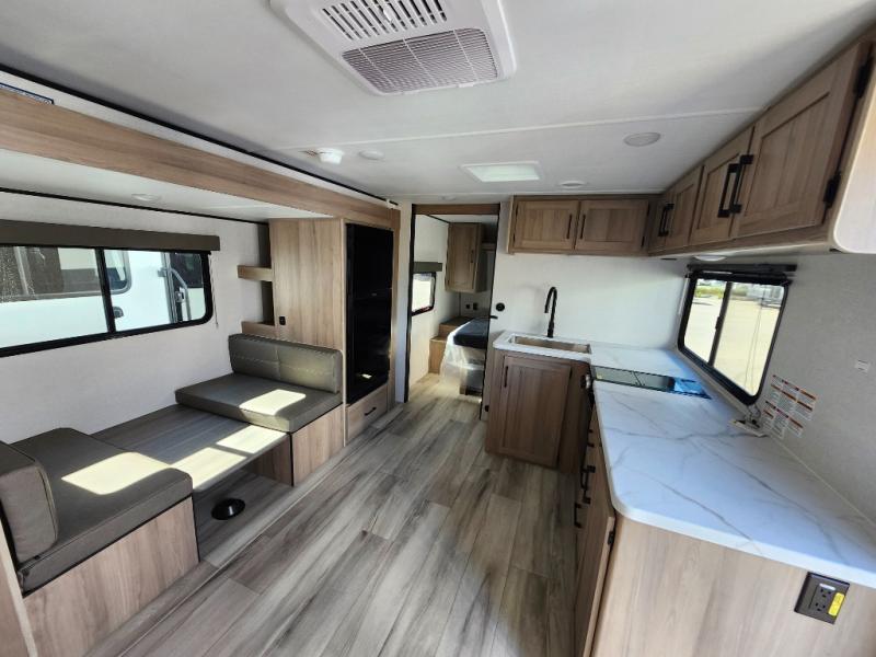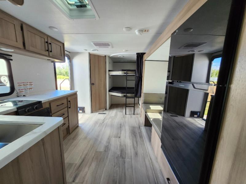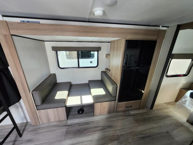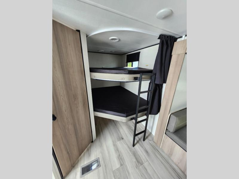 Your crew of seven to eight will love camping in this travel trailer with bunks! Once you arrive at the campground, you can unload the pass-thru storage, put out the 16' power awning, and grab a cold drink from the 2.6 cu. ft. outdoor refrigerator. Head inside to whip up lunch on the two burner gas range or in the air fryer/convection microwave. There is a booth dinette slide out where you can dine, and this space can even be transformed into sleeping space for one to two little ones. A rear corner full bath lets you clean up daily, and the double-size bunks with a ladder are sure to be a hit!