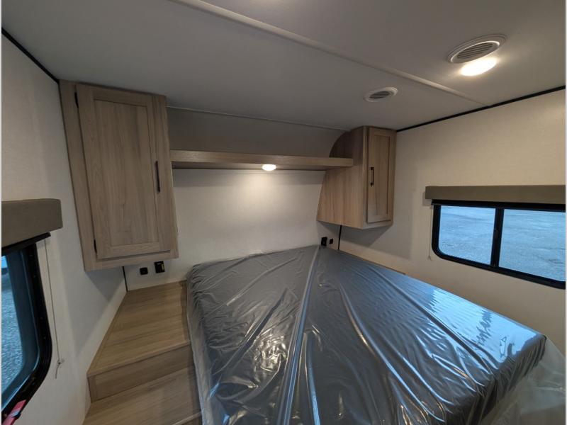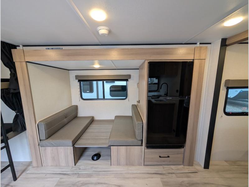 If you're needing additional sleeping space and added comfort in your next RV, this travel trailer is the one! There are double-size bunks and step in the back for your guests or little ones, and the full bath includes one of the dual entry doors to the unit for added convenience. The combined kitchen and living area is made spacious thanks to the large slide out which houses the sofa and booth dinette. You can make meals on the two burner range or in the air fryer/convection microwave, and there is an 8 cu. ft. 12V refrigerator to keep food fresh. You'll appreciate having your own bedroom up front, complete with sliding doors, a queen bed and dual bedside wardrobes to keep your clothes off of the floor!