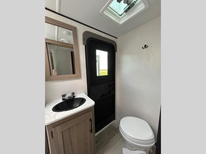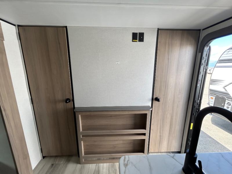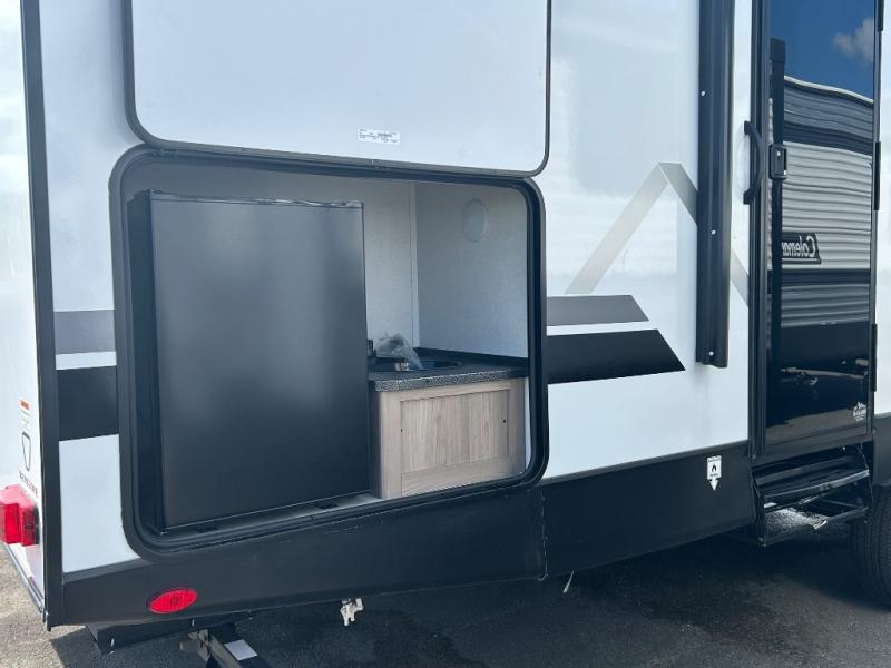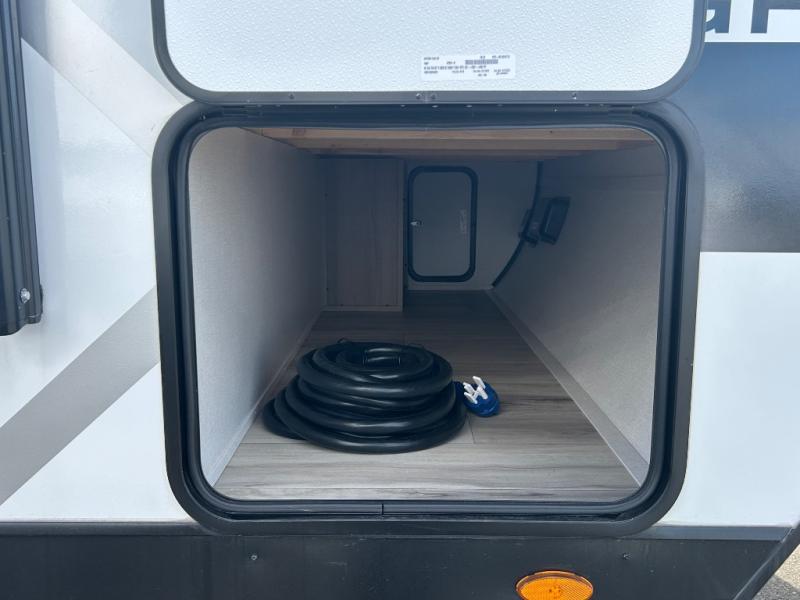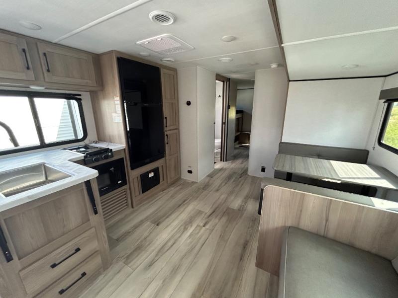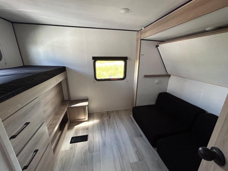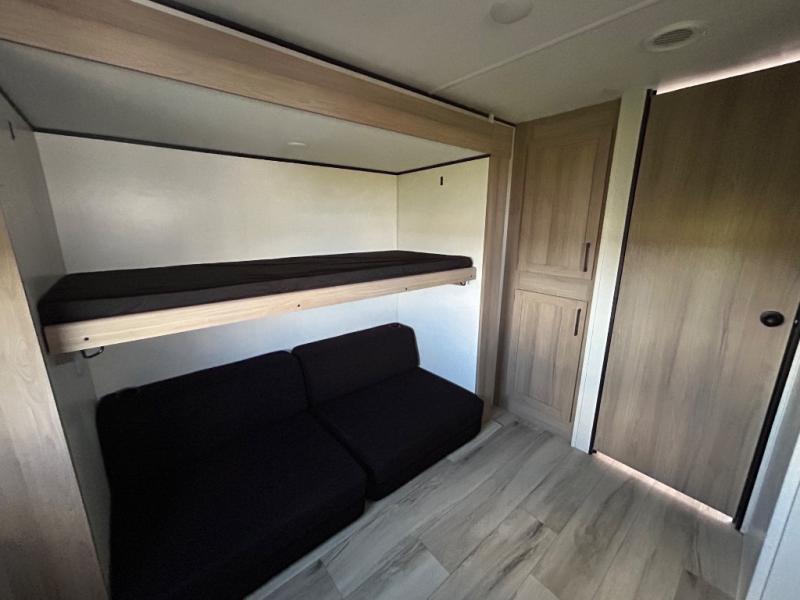The whole gang will love camping in this rear bunkhouse travel trailer! Here, you'll find a slide out with a flip-up bunk and couch below, across from a second bunk plus a wardrobe for clothes. The full bath is right next to the bunkhouse for easy nighttime use, and you'll find one of the dual entry doors here for added convenience. Up front, a private bedroom will make this unit feel more like home, and there are two entry doors to the bedroom, providing easy access to each side of the bed. Your crew can meet in the combined kitchen and living area to play a game at the booth dinette or relax on the sofa within the large slide out. If the weather is nice, you may just find yourselves outside under the 21' power awning, while enjoying the outdoor sink and refrigerator!