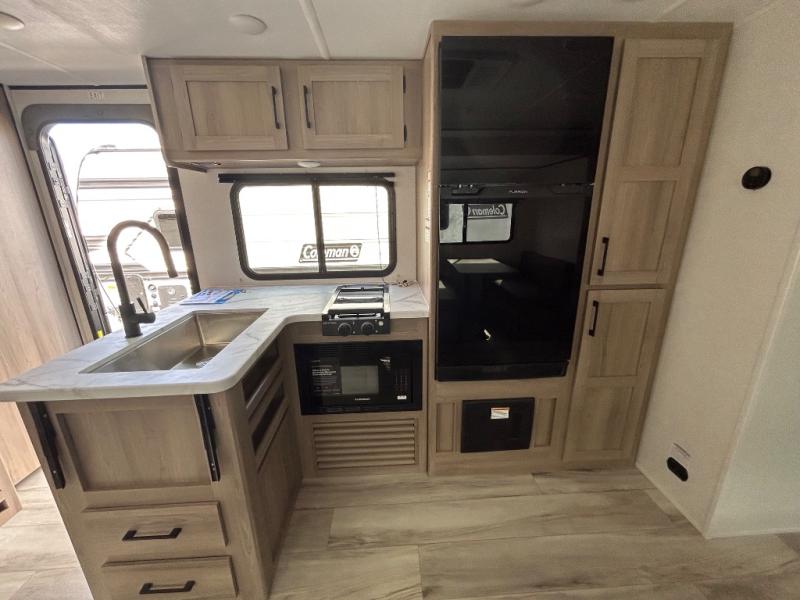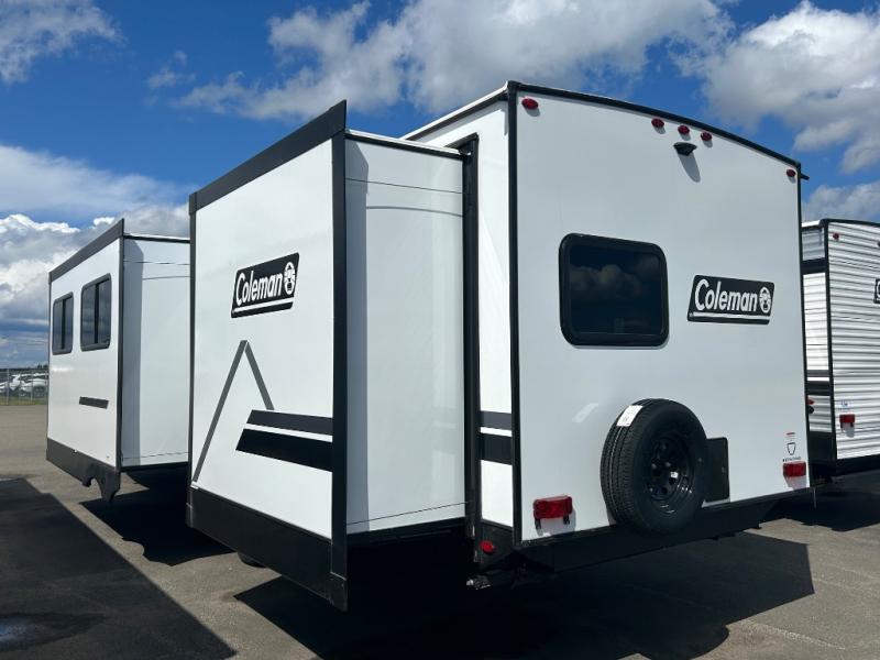 With any Coleman Light travel trailer, you will experience Keystone's quality throughout, plus enjoy lightweight towing to the campground or RV park. There is a .040" smooth front metal, tinted safety glass windows, and a power awning outdoors for an inviting space to relax. The friction hinge entry door is another convenience you'll appreciate, and there is Furrion backup camera prep if you want the option to make parking easier. Inside, you'll find blackout night shades, a 6' 6" ceiling height, bedside outlets, and many more comforts.