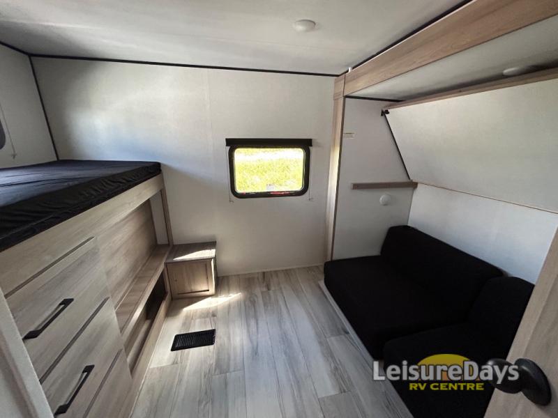 The whole gang will love camping in this rear bunkhouse travel trailer! Here, you'll find a slide out with a flip-up bunk and couch below, across from a second bunk plus a wardrobe for clothes. The full bath is right next to the bunkhouse for easy nighttime use, and you'll find one of the dual entry doors here for added convenience. Up front, a private bedroom will make this unit feel more like home, and there are two entry doors to the bedroom, providing easy access to each side of the bed. Your crew can meet in the combined kitchen and living area to play a game at the booth dinette or relax on the sofa within the large slide out. If the weather is nice, you may just find yourselves outside under the 21' power awning, while enjoying the outdoor sink and refrigerator!