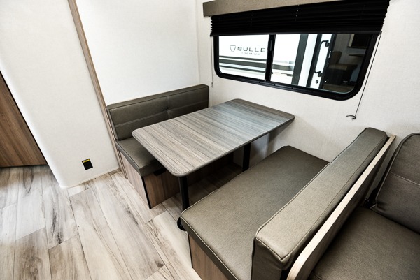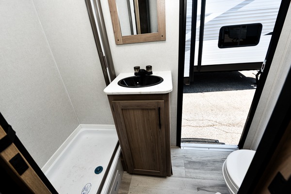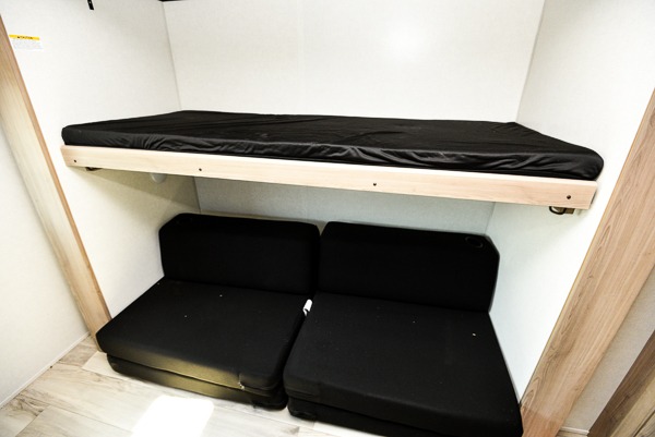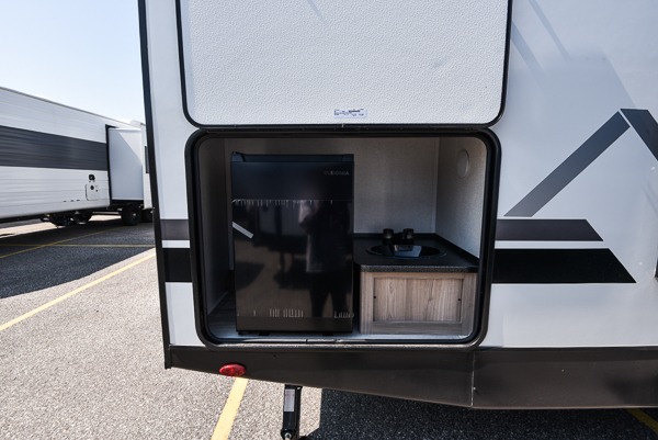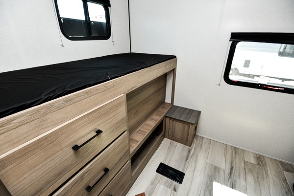 The whole gang will love camping in this rear bunkhouse travel trailer! Here, you'll find a slide out with a flip-up bunk and couch below, across from a second bunk plus a wardrobe for clothes. The full bath is right next to the bunkhouse for easy nighttime use, and you'll find one of the dual entry doors here for added convenience. Up front, a private bedroom will make this unit feel more like home, and there are two entry doors to the bedroom, providing easy access to each side of the bed. Your crew can meet in the combined kitchen and living area to play a game at the booth dinette or relax on the sofa within the large slide out. If the weather is nice, you may just find yourselves outside under the 21' power awning, while enjoying the outdoor sink and refrigerator!
