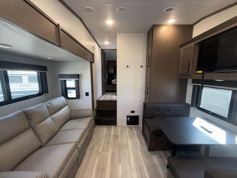 Your family of five or six will love traveling in this Cougar Sport lightweight fifth wheel! Enter to find a convenient rear kitchen layout just steps inside the door. Drop your shoes off in the shoe cubby to your right at the door, and relax on either the tri-fold sleeper sofa or at the booth dinette. The sofa and a 12 volt refrigerator are situated within the slide for added roominess. Head up the steps to a complete bath and private front bedroom featuring a queen size bed with dual shirt wardrobes and nightstands on both sides of the bed. There is also a wardrobe off the foot of the bed along the inside wall with two convenient drawers as well. The bathroom offers a shower with a skylight for added headroom and natural lighting. You will also appreciate the medicine cabinet over the sink for your personal items. Back down to the main living and kitchen area, a nice size pantry will hold all of your dry goods and snacks, and there is ample storage in the overhead cabinets above the dinette on either side of the TV, plus in the kitchen area all along the rear wall. Here you can cook your family their camp favorites using either the three burner range with oven, or overhead microwave. Outside, a 17' awning provides added living space protected from the elements!