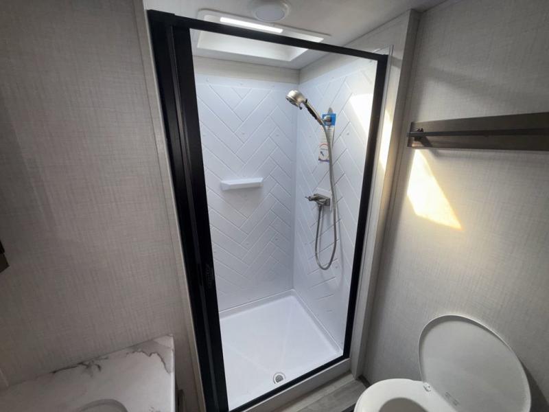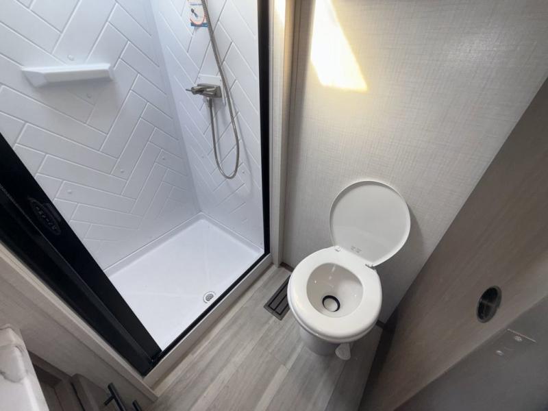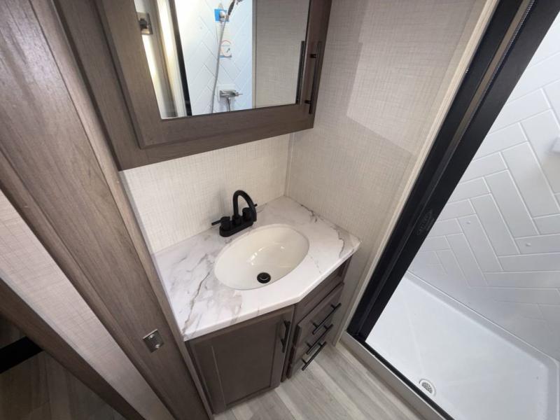 The Cougar Sport structural I-beam frame with stamped steel cross-members and outriggers, plus its laminated sidewalls with five-sided aluminum superstructure and Alpha Super Flex roof membrane are what active RVers love about the construction of the Cougar line. The Cougar Sport models are no exception when it comes to a great package, as well as being smaller and lighter weight than their big brother Cougar models. A one-piece, heated and enclosed polypropylene underbelly means a longer camping season. On the inside, residential shaker style hardwood cabinet doors and decorative crown molding, plus seamless pressed countertops and an on-demand water heater will make your unit feel even more like home. You are also sure to appreciate the shiplap style decorative accent wall behind the bed, a porcelain foot flush toilet in the bathroom, plus residential kitchen hardware, and so much more.