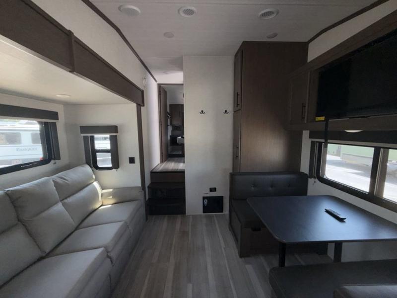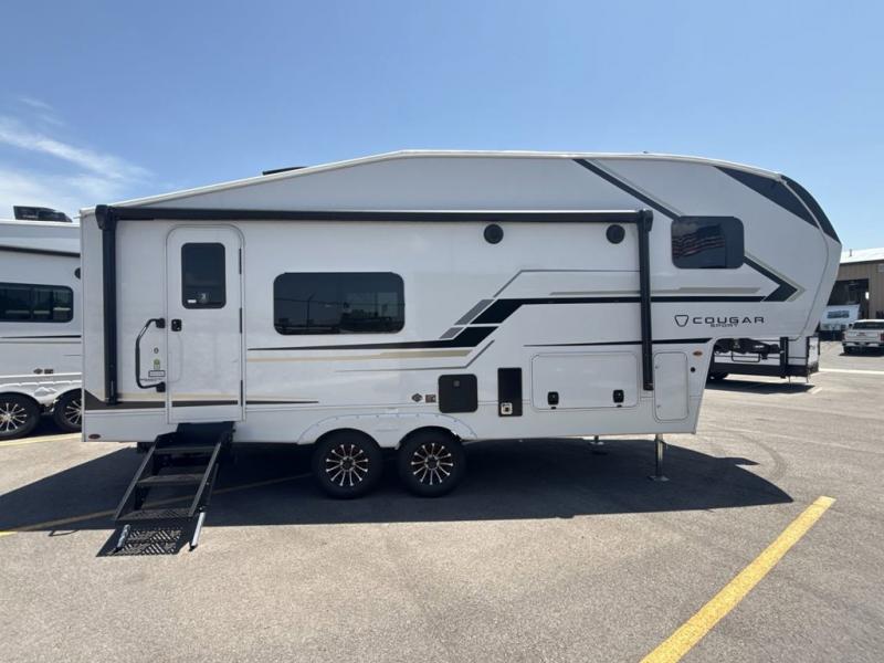 Your family of five or six will love traveling in this Cougar Sport lightweight fifth wheel! Enter to find a convenient rear kitchen layout just steps inside the door. Drop your shoes off in the shoe cubby to your right at the door, and relax on either the tri-fold sleeper sofa or at the booth dinette. The sofa and a 12 volt refrigerator are situated within the slide for added roominess. Head up the steps to a complete bath and private front bedroom featuring a queen size bed with dual shirt wardrobes and nightstands on both sides of the bed. There is also a wardrobe off the foot of the bed along the inside wall with two convenient drawers as well. The bathroom offers a shower with a skylight for added headroom and natural lighting. You will also appreciate the medicine cabinet over the sink for your personal items. Back down to the main living and kitchen area, a nice size pantry will hold all of your dry goods and snacks, and there is ample storage in the overhead cabinets above the dinette on either side of the TV, plus in the kitchen area all along the rear wall. Here you can cook your family their camp favorites using either the three burner range with oven, or overhead microwave. Outside, a 17' awning provides added living space protected from the elements!