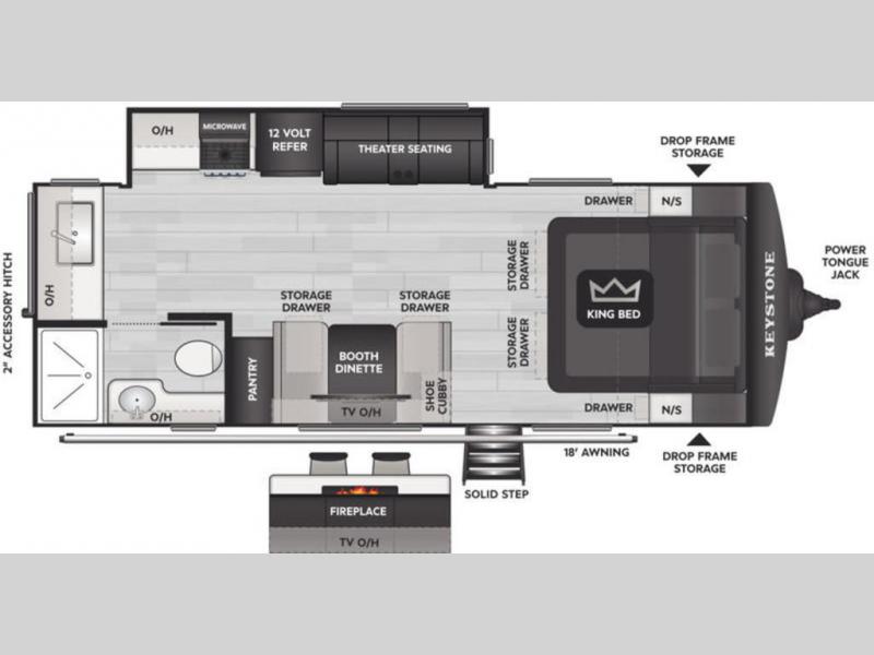 With a king-size bed, this Cougar Half-Ton travel trailer shows that you can still be comfortable even while you're away from home! The bed has drawers and nightstands on either side to keep your belongings tidy. There is a convenient shoe cubby right as you enter the unit to keep this space picked up as well. Right next to the booth dinette is the pantry, and next to the pantry is the full bathroom which is certainly one of the most valuable features to any trailer.