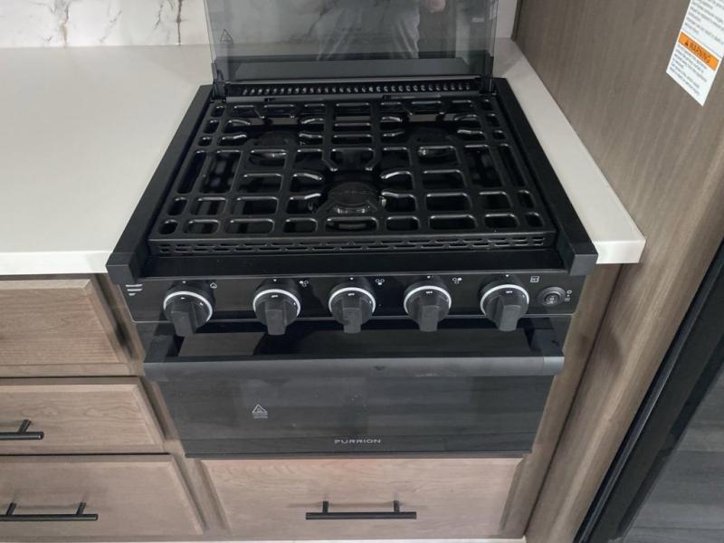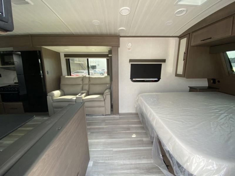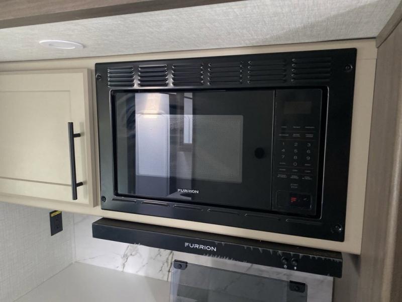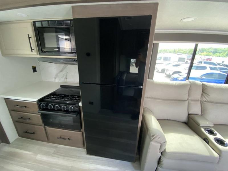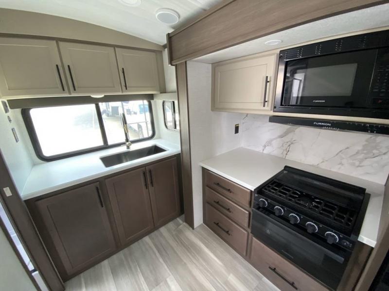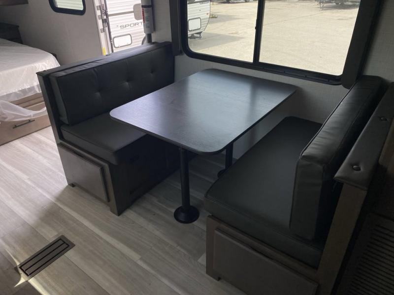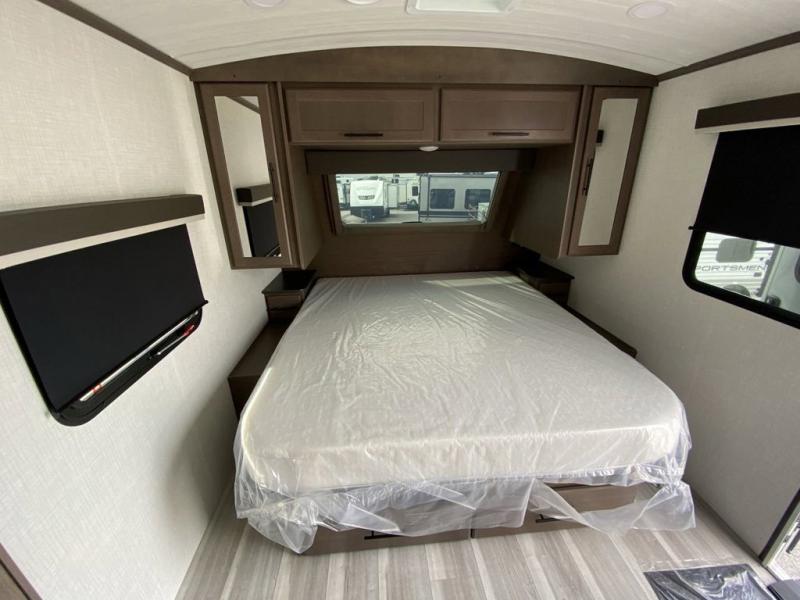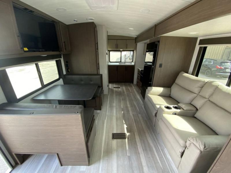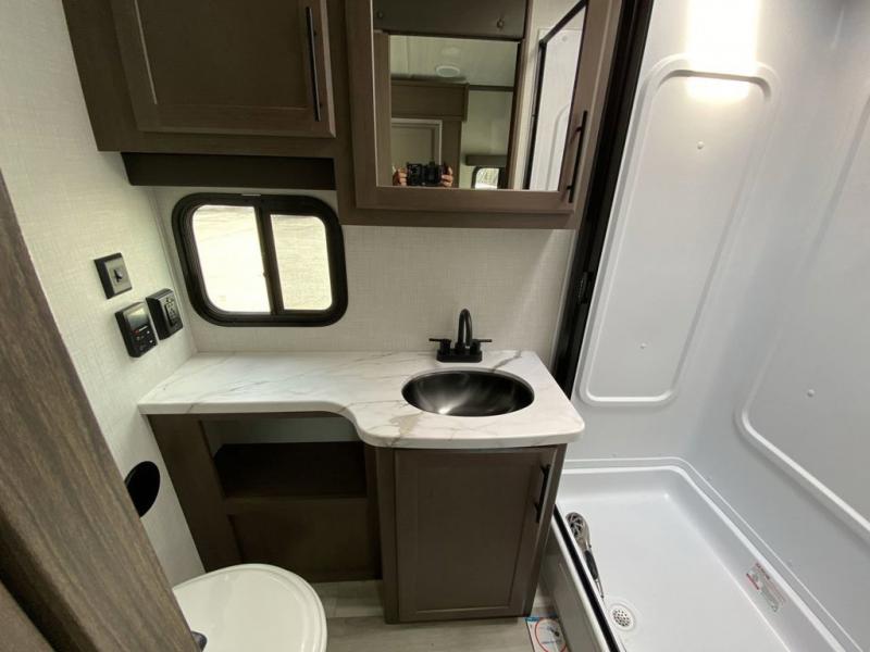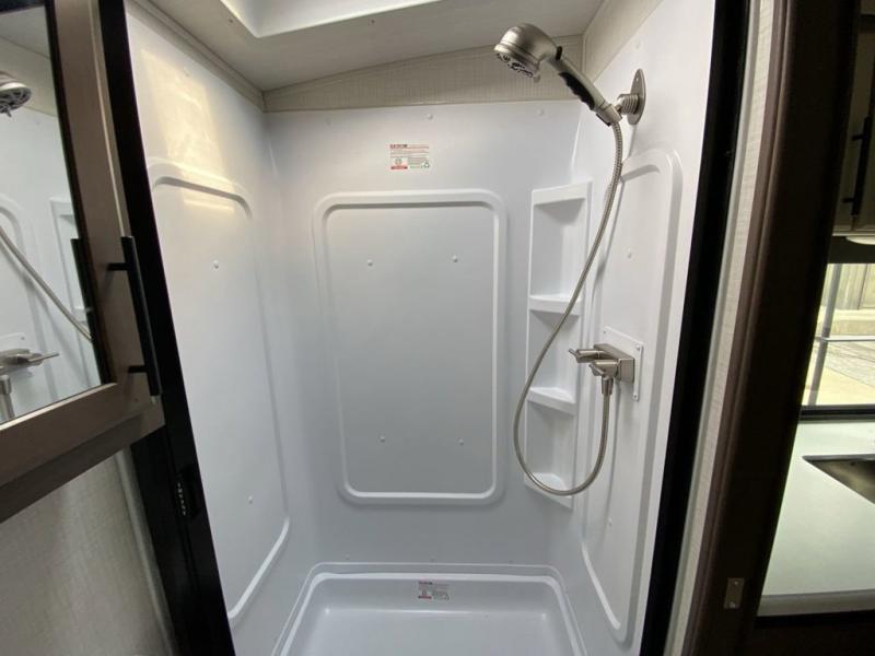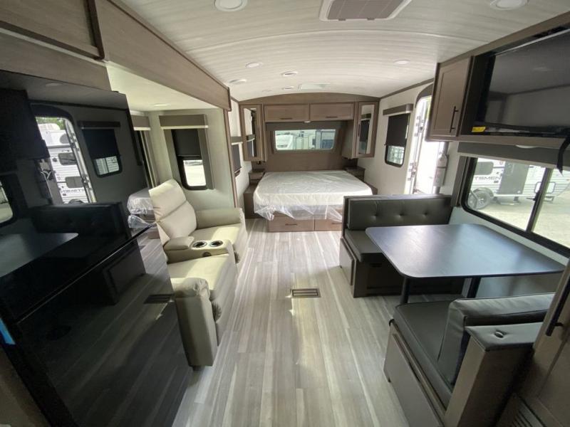 With a king-size bed, this Cougar Half-Ton travel trailer shows that you can still be comfortable even while you're away from home! The bed has drawers and nightstands on either side to keep your belongings tidy. There is a convenient shoe cubby right as you enter the unit to keep this space picked up as well. Right next to the booth dinette is the pantry, and next to the pantry is the full bathroom which is certainly one of the most valuable features to any trailer.
