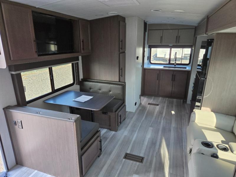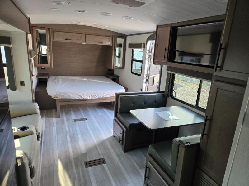 With a king-size bed, this Cougar Half-Ton travel trailer shows that you can still be comfortable even while you're away from home! The bed has drawers and nightstands on either side to keep your belongings tidy. Right next to the booth dinette is the pantry, and next to the pantry is the full bathroom which is certainly one of the most valuable features to any trailer.