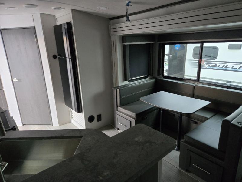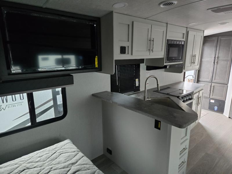 Imagine waking up from your own king bed to enjoy a hike, a bike ride, or a relaxing time outside under the 16' power awning while you wait for your spouse to wake up. With this Cougar Half-Ton travel trailer, you can make breakfast inside with full amenities and eat at the U-shaped dinette while looking out at the views. You will be able to get cleaned up in the full bathroom without having to wait your turn for the public facilities. The front bedroom includes a king bed with dual storage drawers and nightstands, and there is a bar top in the kitchen for a little more counter space!