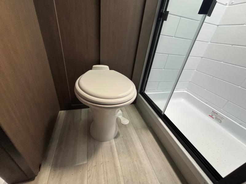 You'll love camping in this rear kitchen fifth wheel that can sleep five to six! Up front, you will enjoy a private bedroom with a king bed and bedside wardrobe/nightstands as well as a wardrobe with washer and dryer prep. A complete bath provides a large shower, toilet and sink, plus linen storage which you are sure to appreciate as you travel. There are plenty of options for this unit making it easy to customize to your use and style. The theater seating and free standing dinette options can be selected in place of the sleeper sofa and booth dinette if you prefer. There is also a 16' awning to create even more living space to enjoy, and the unobstructed pass-through storage compartment can easily house all of your outdoor camping gear like lawn chairs and yard games.