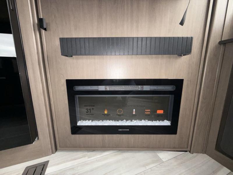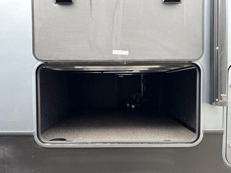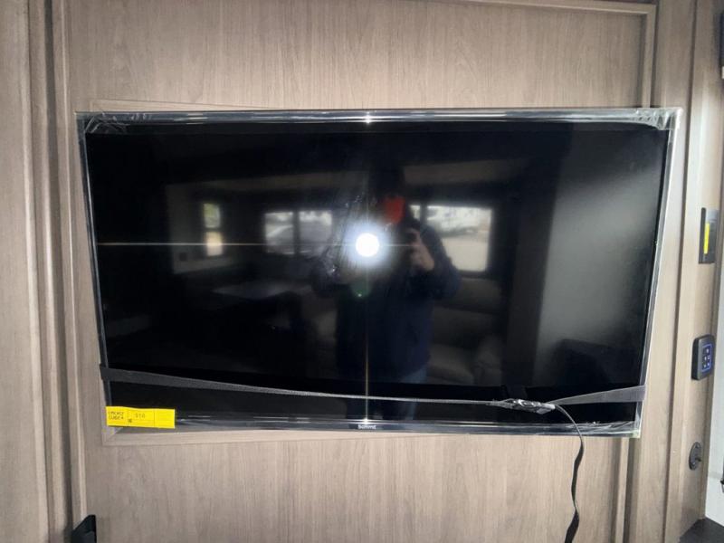 This lightweight fifth wheel is big enough for your small family to camp together! Enter to find a convenient combined kitchen and living space with large slide for added space. The slide features theater seating and a booth dinette which offers ample seating for meals and hanging out. There is a flip up table along the rear wall with a nearby 40" LED TV which features a butler pantry behind. Head up the steps to the right of the entry door to a complete bath and private front bedroom featuring a queen size bed with dual nightstands on both sides of the bed. The bathroom offers a shower with a skylight for added headroom and natural lighting. Outside, a 16' awning provides added living space protected from the elements!