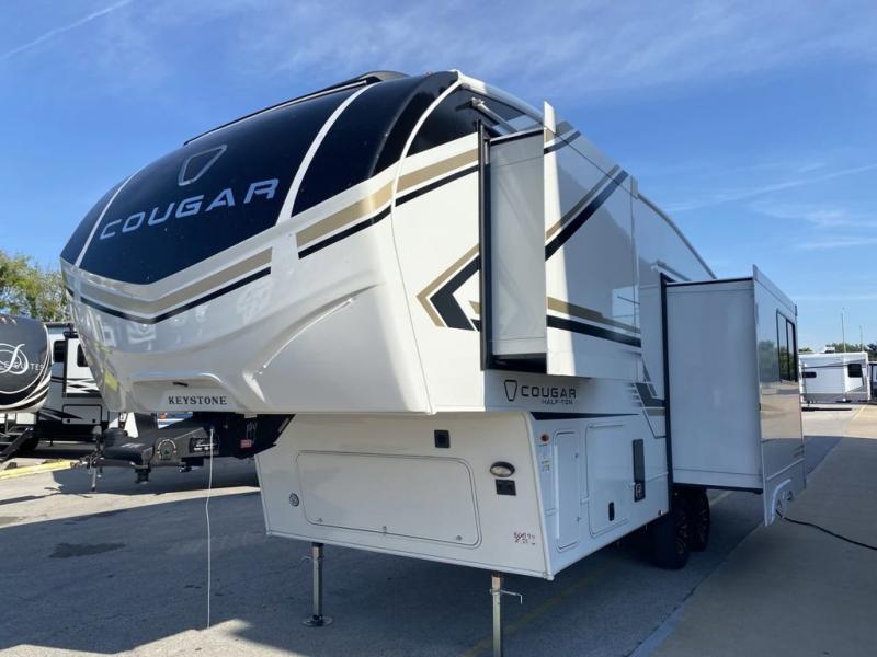 The Keystone Cougar Half-Ton fifth wheel and travel trailers are known as one of America's favorites for a reason! Some of those reasons are the exclusive features that come from Keystone, like the Winegard Air 360+ omni-directional rooftop antenna, the in-floor heating ducts, and the HyperCore composite wall construction with Vixen Fibrogloss high-gloss finish. The Cougar Half-Ton has a Climate Guard protection package with heat-deflecting white sidewalls, two roof attic vents, PEX plumbing and more to enjoy four season camping. Inside, you'll love the dimmable lighting, night roller shades throughout, shower skylight, and bedside USB outlets to keep your electronics charged.