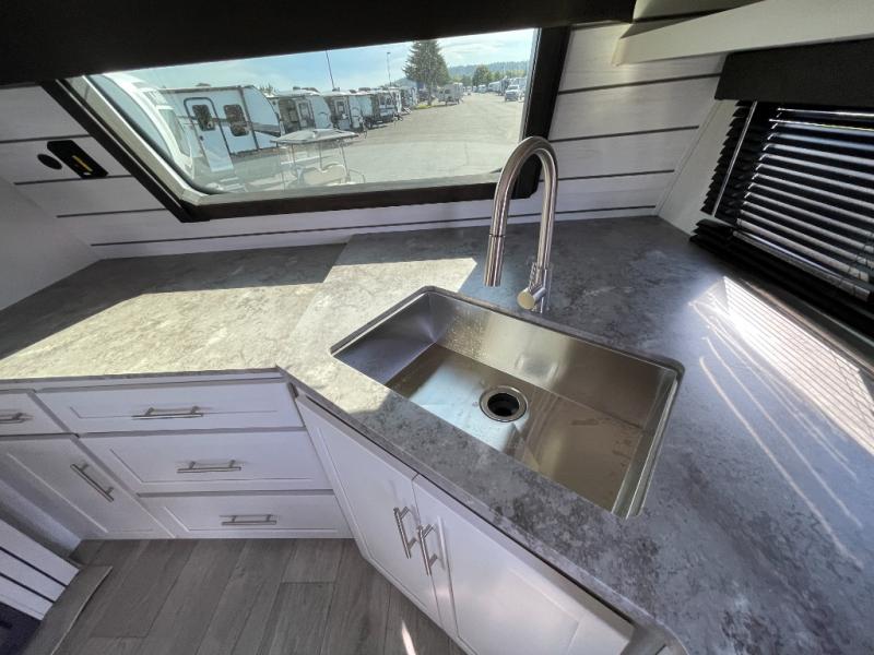 With a queen-size bed and a king bed option, this Cougar Half-Ton travel trailer shows that you can still be comfortable even while you're away from home! The bed slides out to provide more floor space and there is a wardrobe opposite near the private entry door. The main entry up front leads into a spacious combined kitchen and living area with the front kitchen offering plenty of counter space and overhead storage. There is a 12-volt refrigerator to the left of the entry door, and access to a walk-in pantry is right around the corner from the pivoting entertainment center opposite a tri-fold sofa sleeper and booth dinette slide. This unit also features a full-width walk-thru bath giving you plenty of room to shower and change.