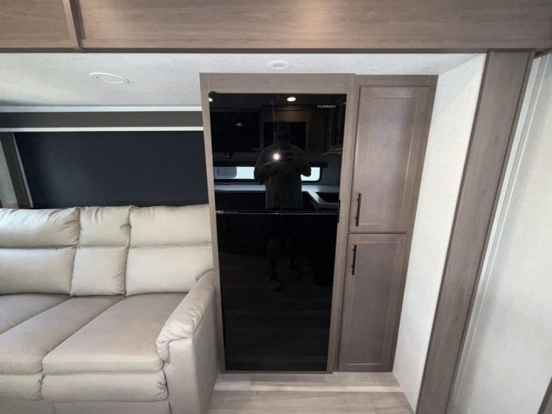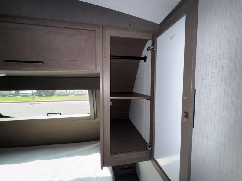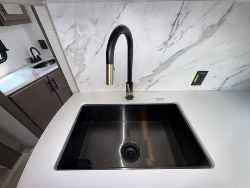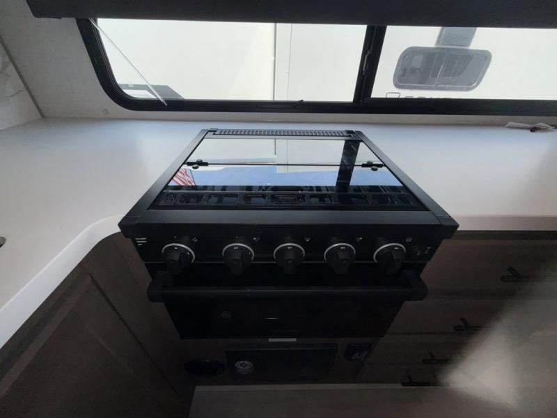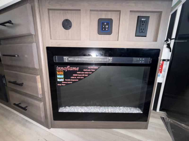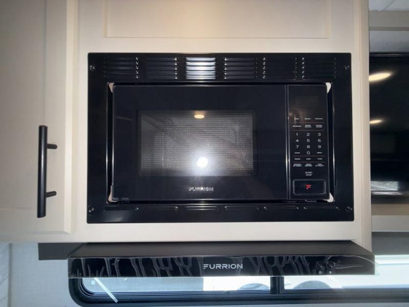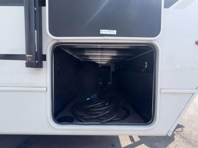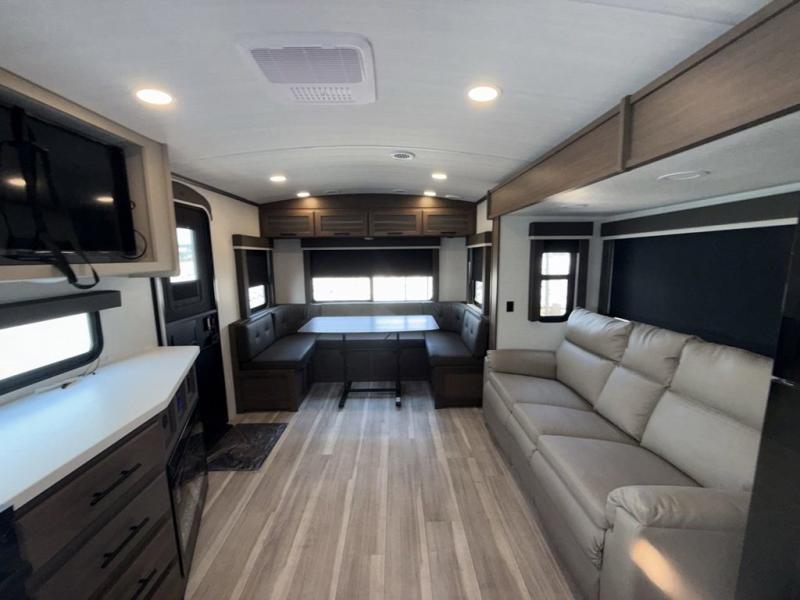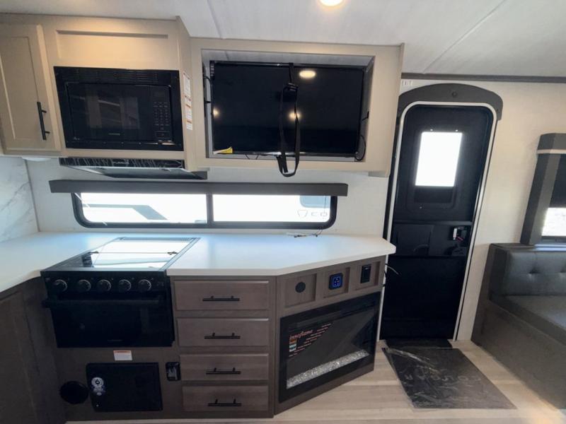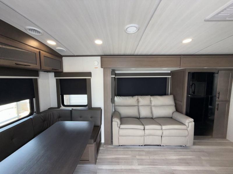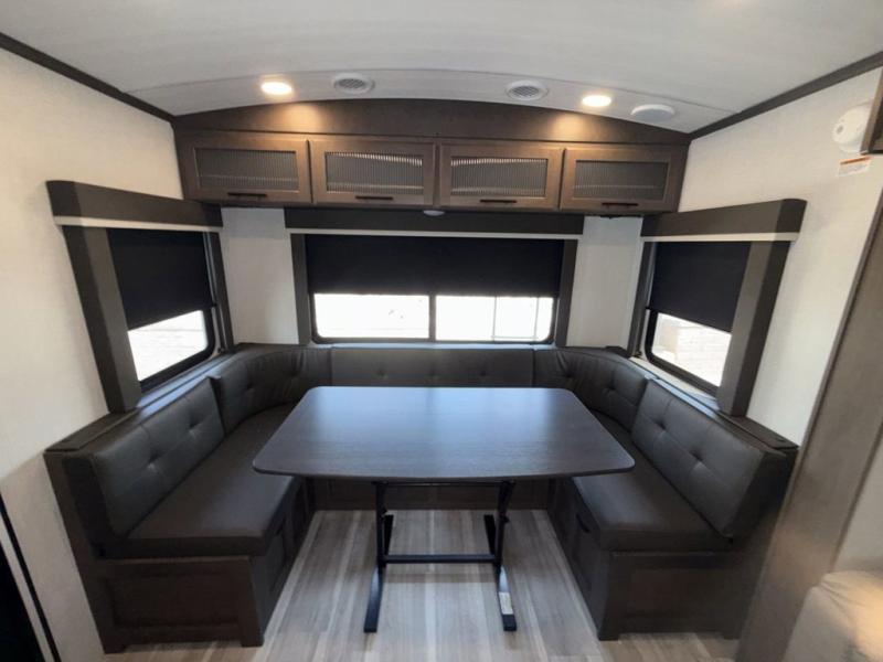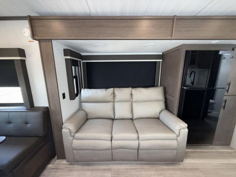 This Cougar Half-Ton travel trailer has an excellent dining area with its huge rear U-shaped dinette! Right next to the dinette is a large slide out that holds the tri-fold sleeper sofa, 12V refrigerator, and a pantry. The kitchen has been excellently appointed with a Furrion range, seamless, pressed countertops, a stainless steel undermount sink, and a microwave, and you will be grateful that you can access both sides of the walk-through bathroom. The private bedroom is ultra convenient with its exterior entrance, king-size bed, and dual storage drawers and dual nightstands.