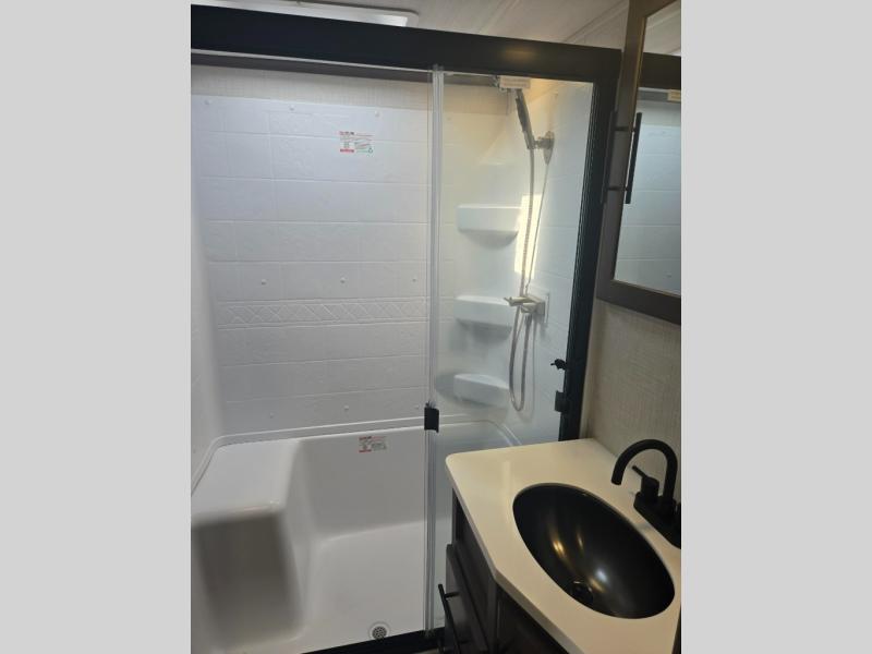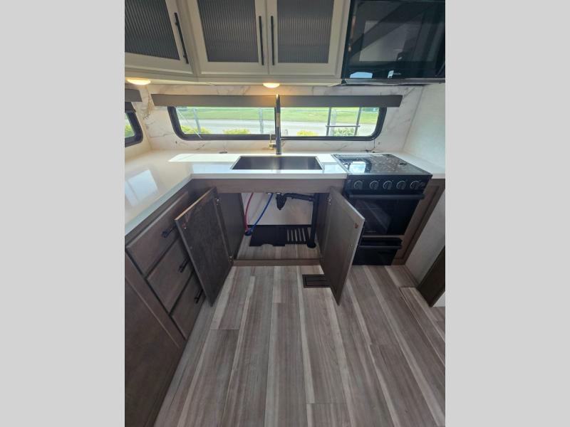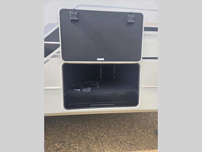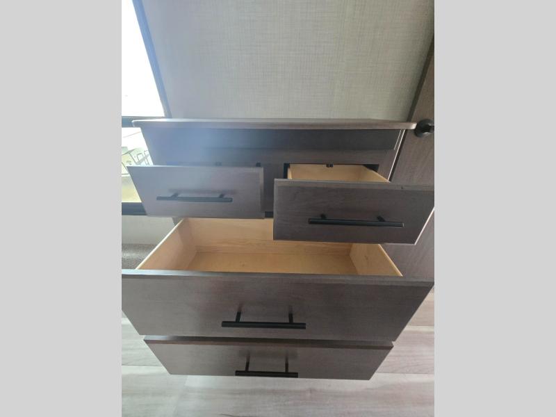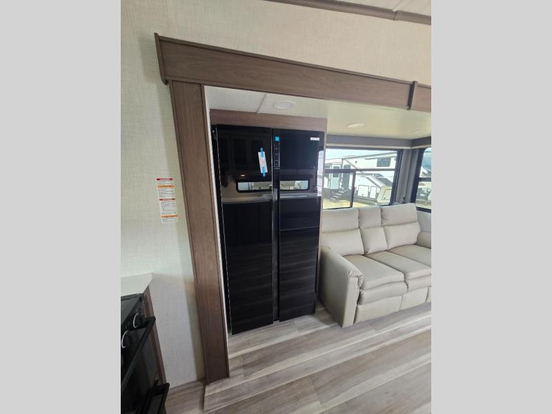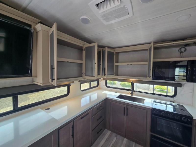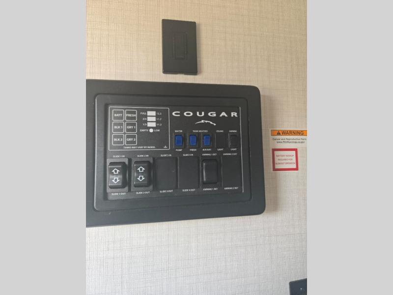 This fifth wheel is packed with premium features you won't want to camp without. You'll feel at home in the front private bedroom with its queen bed slide out with storage underneath, full-height wardrobe, plus a wardrobe with washer and dryer prep. There is even dresser with a sliding top with hidden storage for your valuables. If you have any guests, they can sleep on the tri-fold sleeper sofa within the living room slide, and there is a fireplace and LED HDTV here in perfect view for movie nights. This Cougar fifth wheel features a rear kitchen with tons of counter space, a convenient pull out trash can, and a high-rise chef's faucet and sprayer. The pull-out table in front of the fireplace will provide a place to dine at, or you can sit outdoors under the 20' power awning, and you'll also find an outside kitchen here the chef of your group is sure to love!