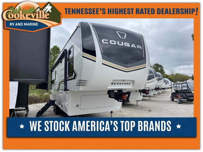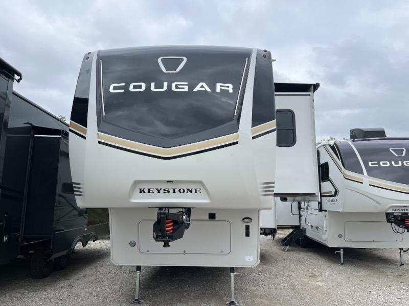 Spend more time having fun and less time worrying about your RV with the Keystone Cougar fifth wheel! These units have all that you will need for excellent vacations. The interior comes with 5/8" one-piece DynaSpan® flooring, tall slide outs for added comfort and head room, night roller shades throughout, and residential, shaker style hardwood cabinet doors and drawers. You will also enjoy Lock-It decorative crown molding, a 5,500 BTU electric fireplace with thermostat control and remote, and a Max Air exhaust fan with rain sensor. The exterior is also fully outfitted with a convenience center, friction-hinge entry door, electric four-point auto leveling system, and slam-latch baggage doors. Each model is available with the optional Hero Edition. By choosing this edition, you can help support our nation's heros and their families by contributing to the Wounded Warrior Project. This optional package features an industry exclusive full-body paint matte finish, frameless windows, a glass entry door, blackout rims, and green LED exterior accent lighting; see dealer for more details!