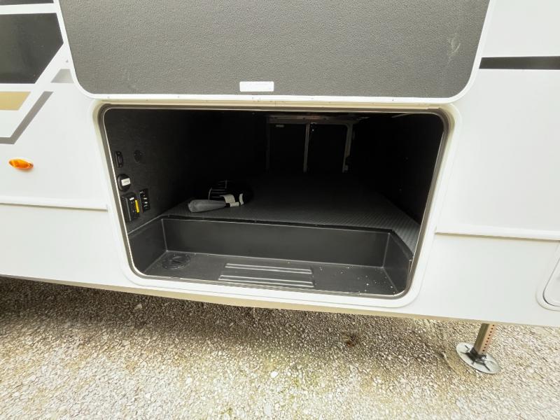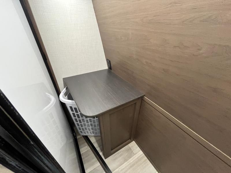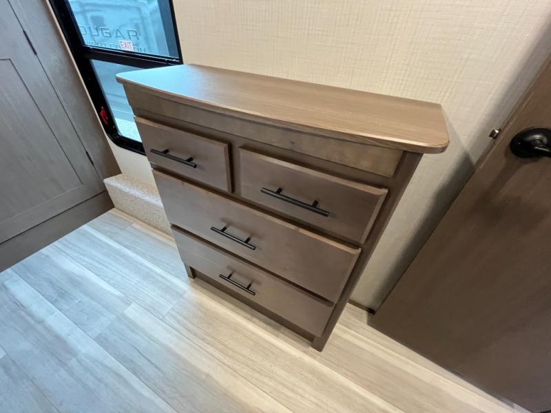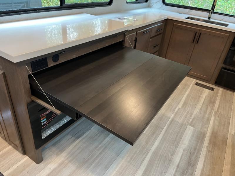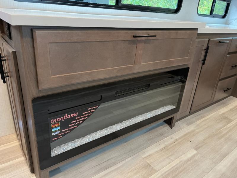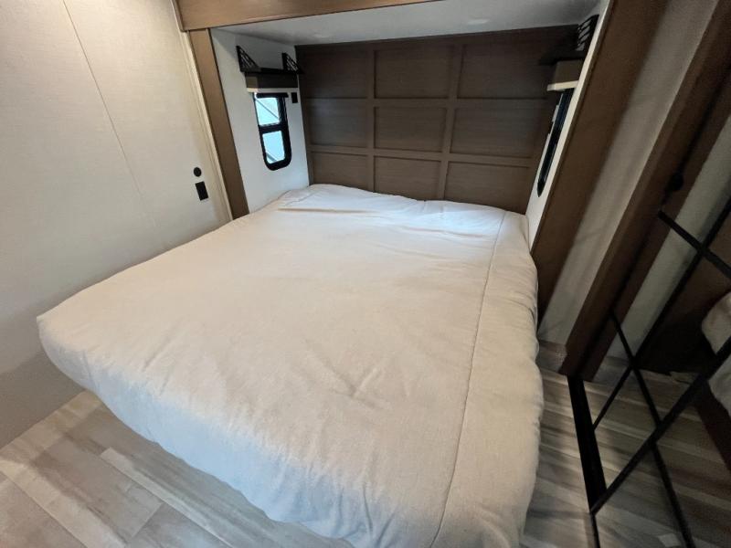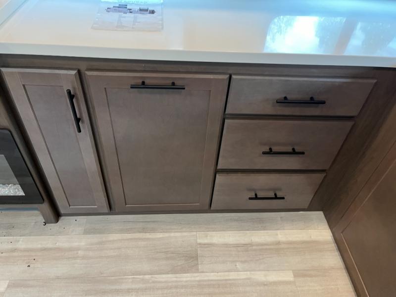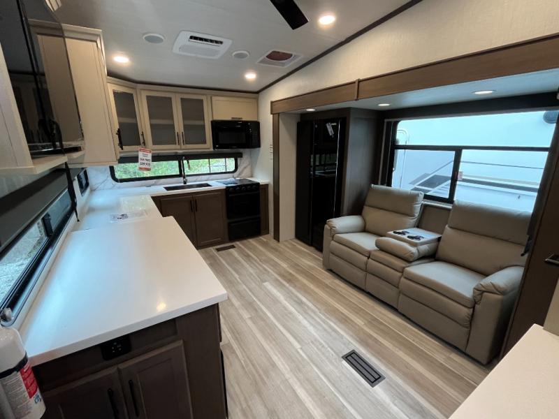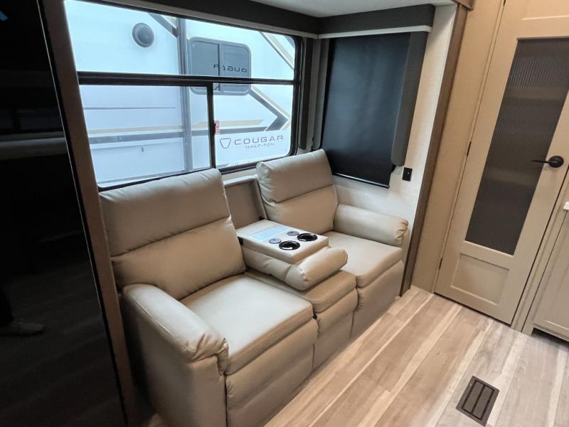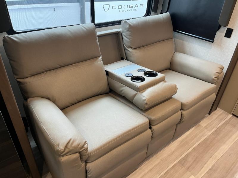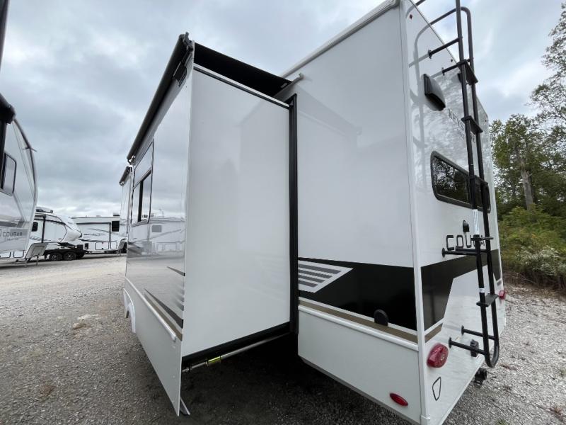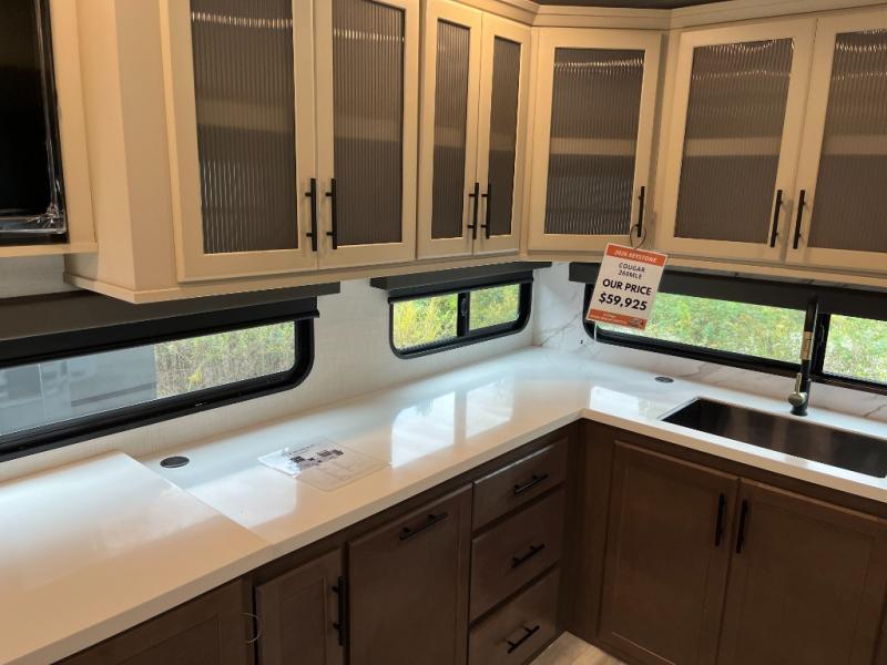 This fifth wheel is packed with premium features you won't want to camp without. You'll feel at home in the front private bedroom with its queen bed slide out with storage underneath, full-height wardrobe, plus a wardrobe with washer and dryer prep. There is even dresser with a sliding top with hidden storage for your valuables. If you have any guests, they can sleep on the tri-fold sleeper sofa within the living room slide, and there is a fireplace and LED HDTV here in perfect view for movie nights. This Cougar fifth wheel features a rear kitchen with tons of counter space, a convenient pull out trash can, and a high-rise chef's faucet and sprayer. The pull-out table in front of the fireplace will provide a place to dine at, or you can sit outdoors under the 20' power awning, and you'll also find an outside refrigerator to keep drinks stocked!