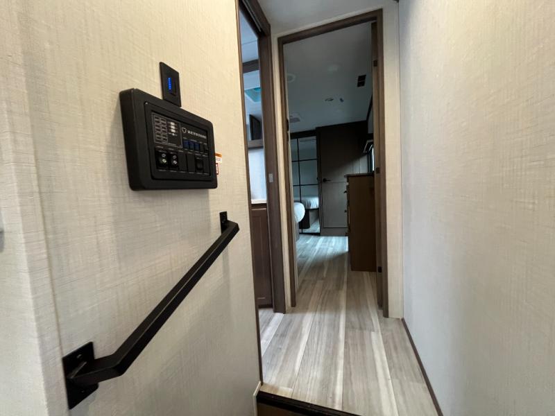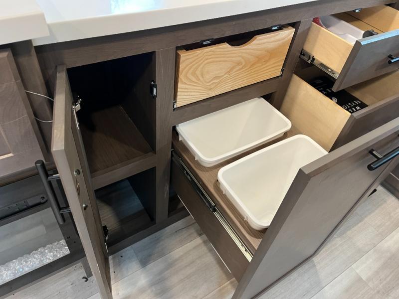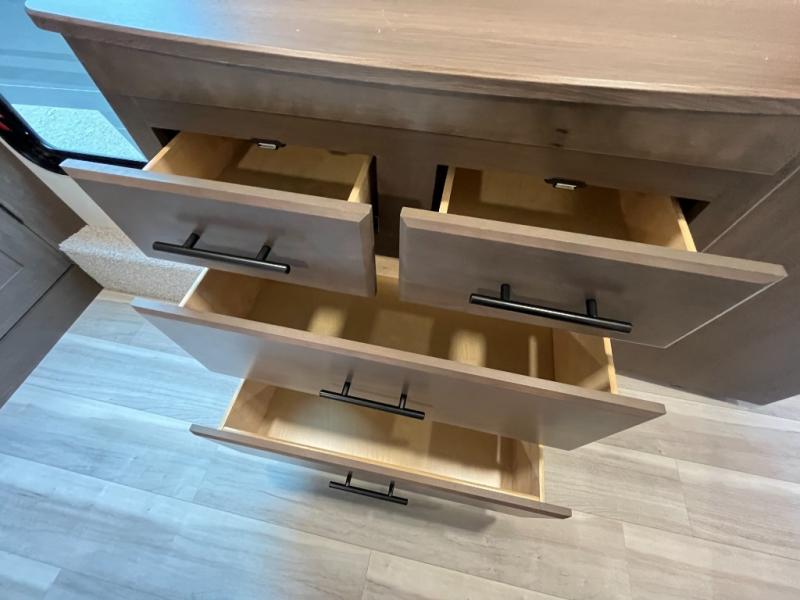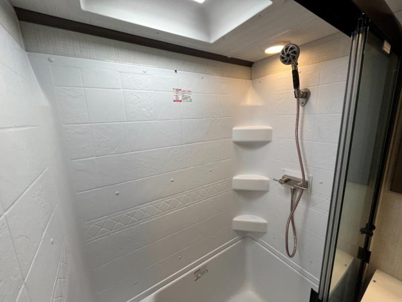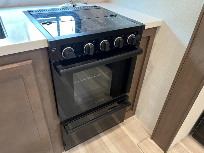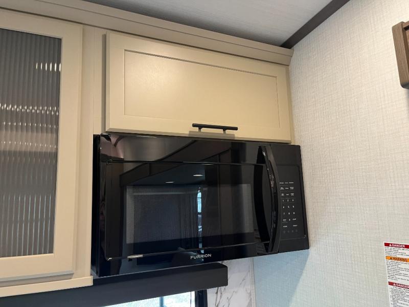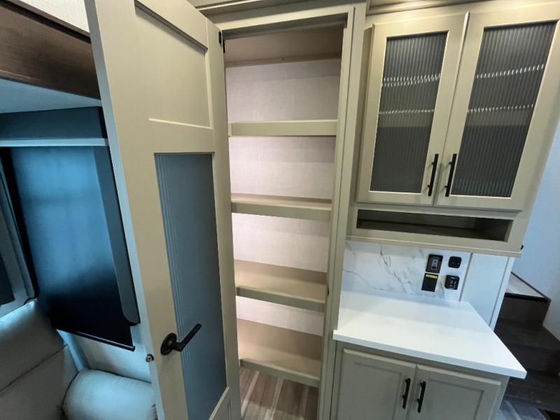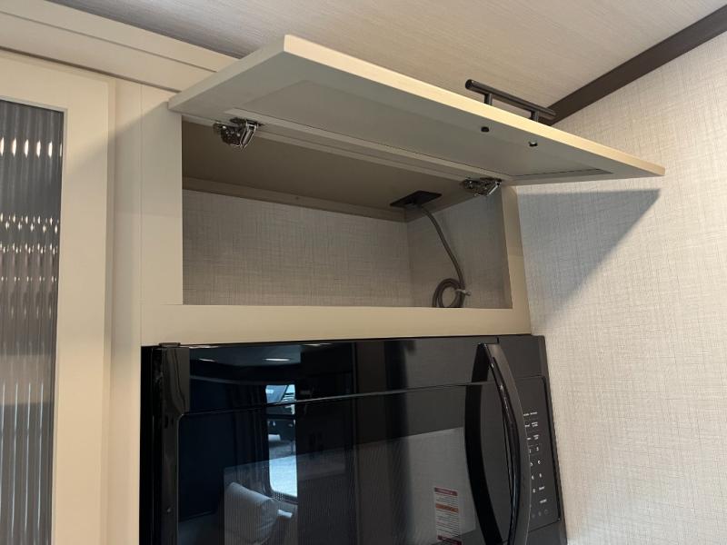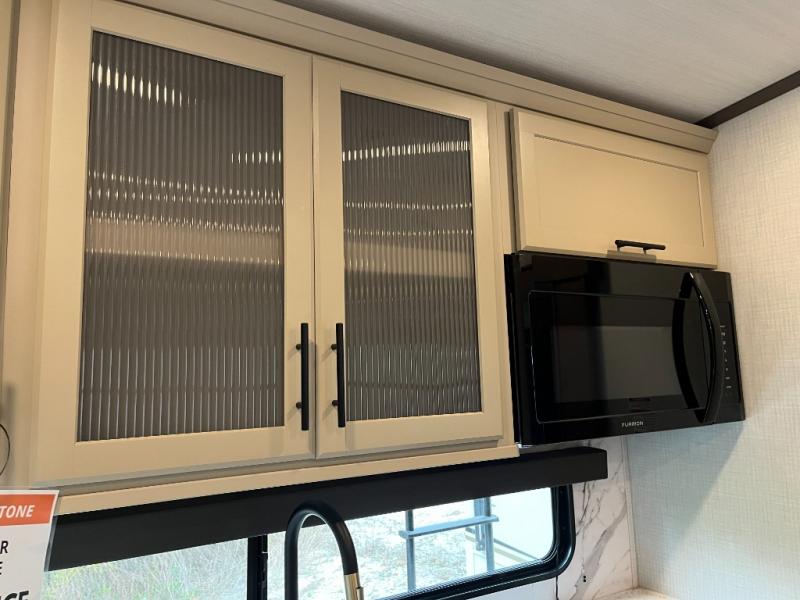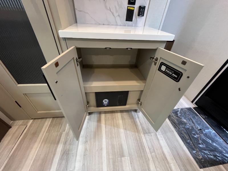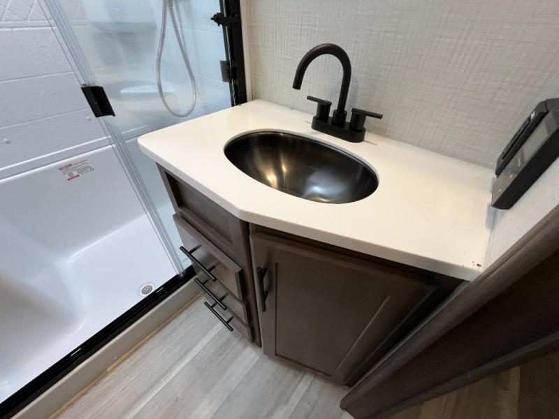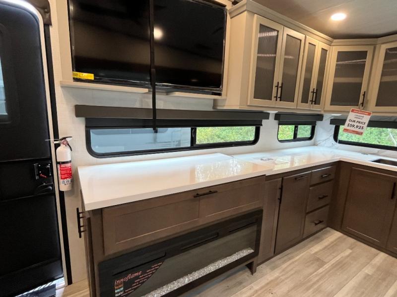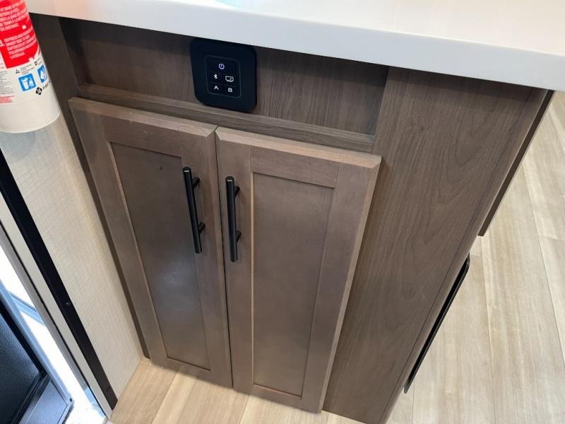 This fifth wheel is packed with premium features you won't want to camp without. You'll feel at home in the front private bedroom with its queen bed slide out with storage underneath, full-height wardrobe, plus a wardrobe with washer and dryer prep. There is even dresser with a sliding top with hidden storage for your valuables. If you have any guests, they can sleep on the tri-fold sleeper sofa within the living room slide, and there is a fireplace and LED HDTV here in perfect view for movie nights. This Cougar fifth wheel features a rear kitchen with tons of counter space, a convenient pull out trash can, and a high-rise chef's faucet and sprayer. The pull-out table in front of the fireplace will provide a place to dine at, or you can sit outdoors under the 20' power awning, and you'll also find an outside refrigerator to keep drinks stocked!