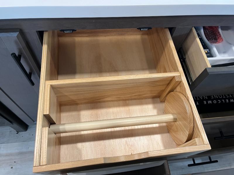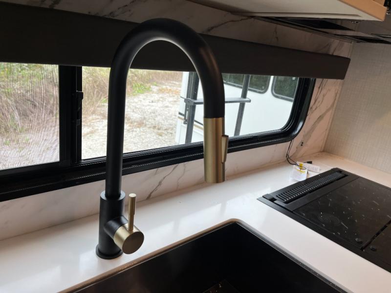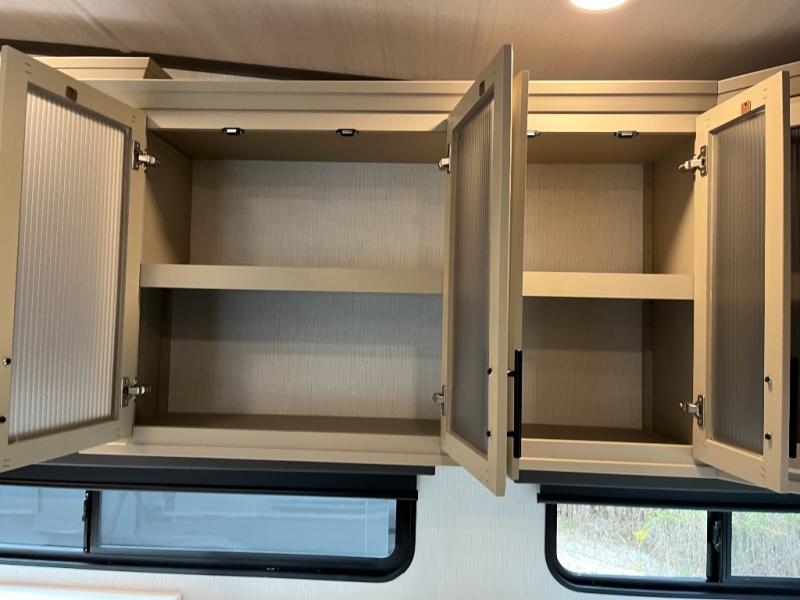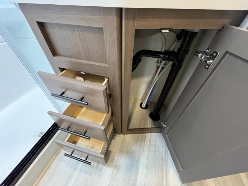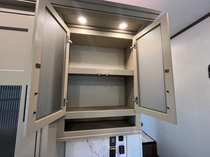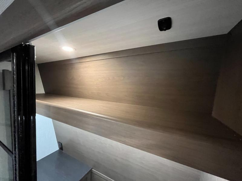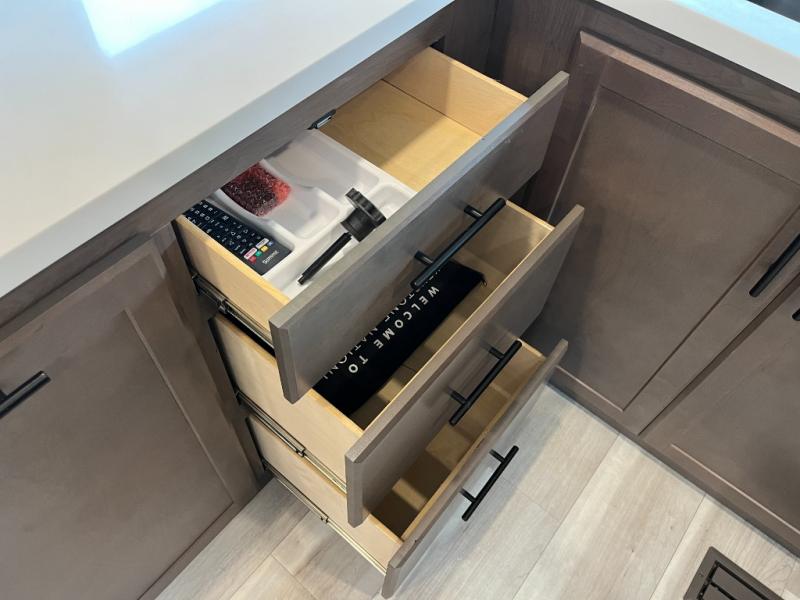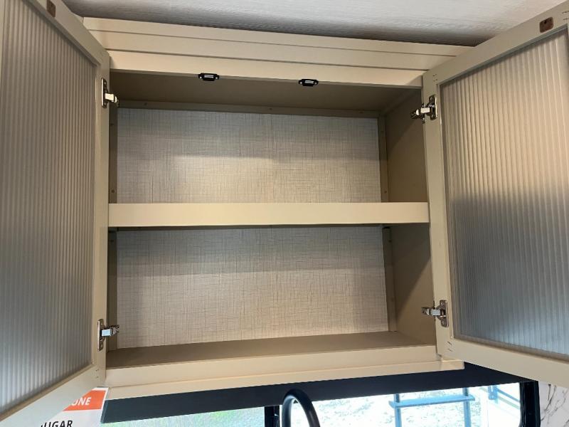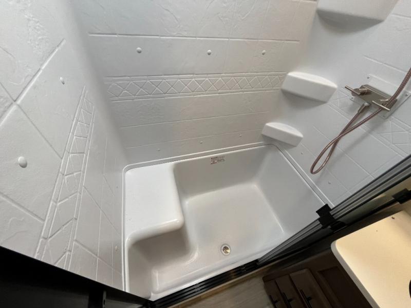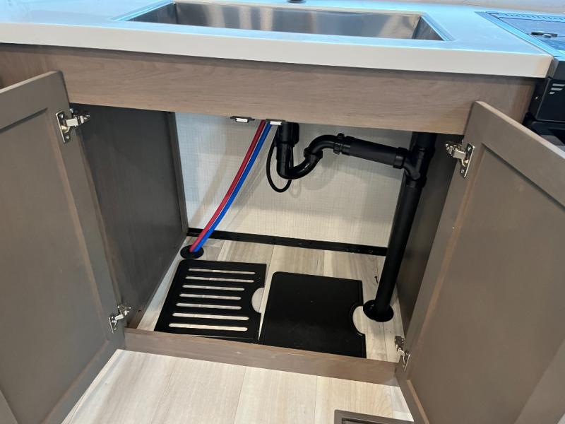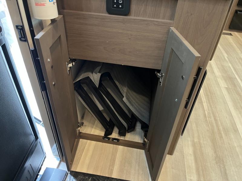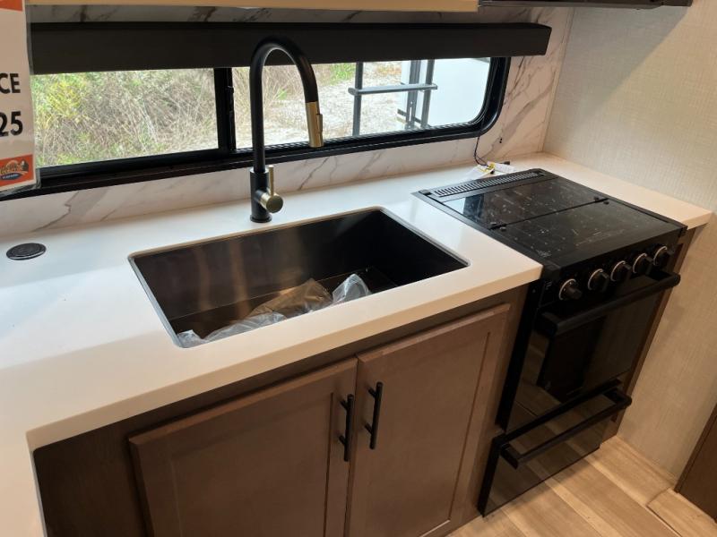 This fifth wheel is packed with premium features you won't want to camp without. You'll feel at home in the front private bedroom with its queen bed slide out with storage underneath, full-height wardrobe, plus a wardrobe with washer and dryer prep. There is even dresser with a sliding top with hidden storage for your valuables. If you have any guests, they can sleep on the tri-fold sleeper sofa within the living room slide, and there is a fireplace and LED HDTV here in perfect view for movie nights. This Cougar fifth wheel features a rear kitchen with tons of counter space, a convenient pull out trash can, and a high-rise chef's faucet and sprayer. The pull-out table in front of the fireplace will provide a place to dine at, or you can sit outdoors under the 20' power awning, and you'll also find an outside refrigerator to keep drinks stocked!