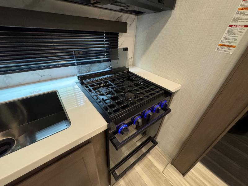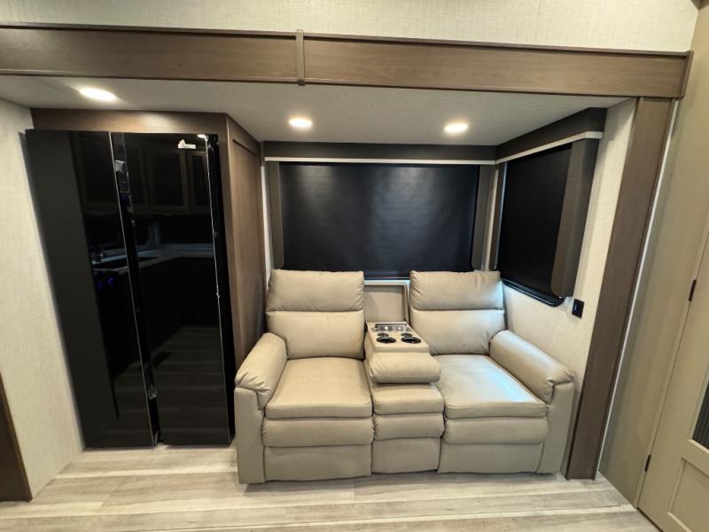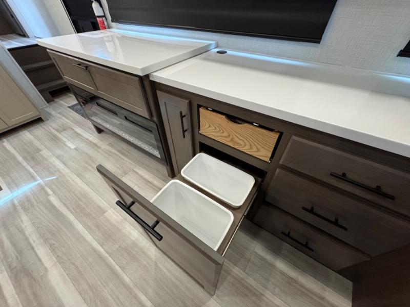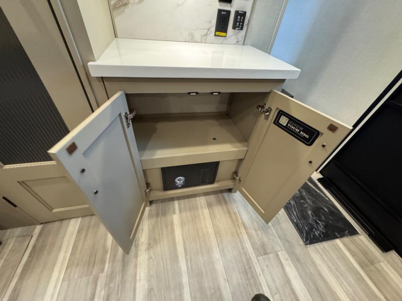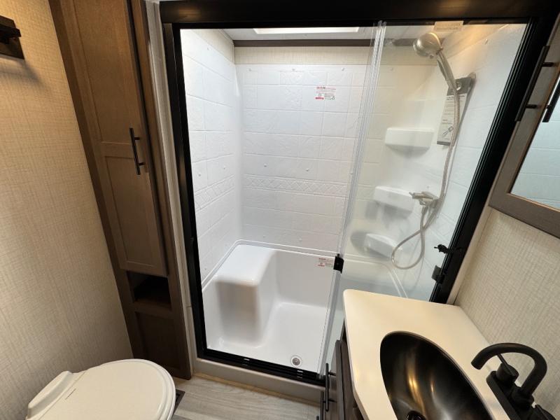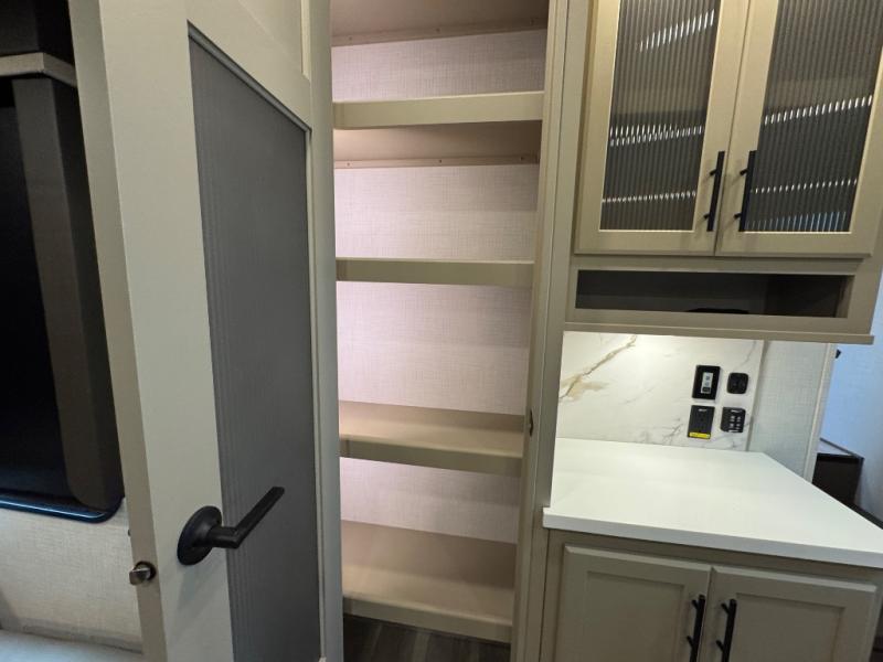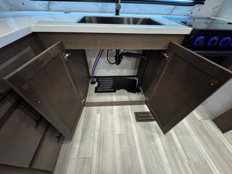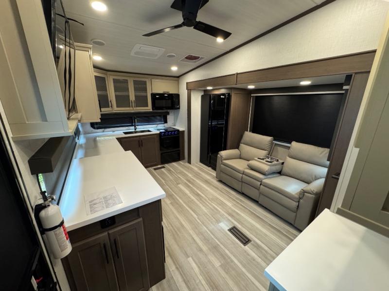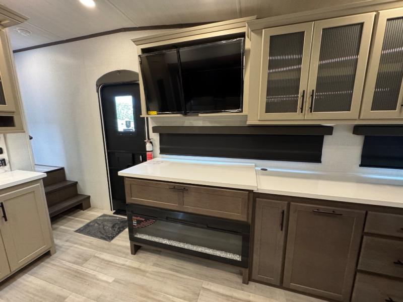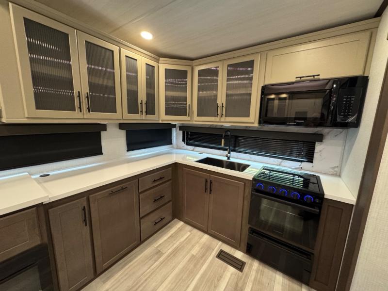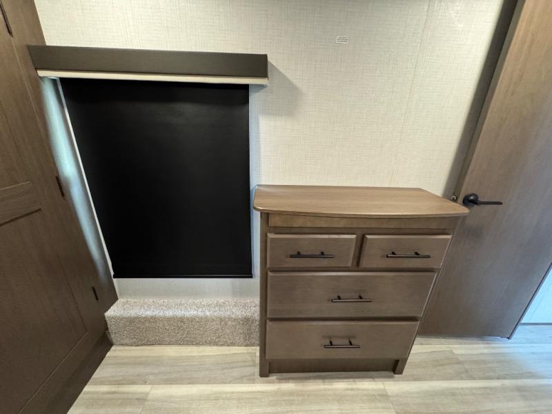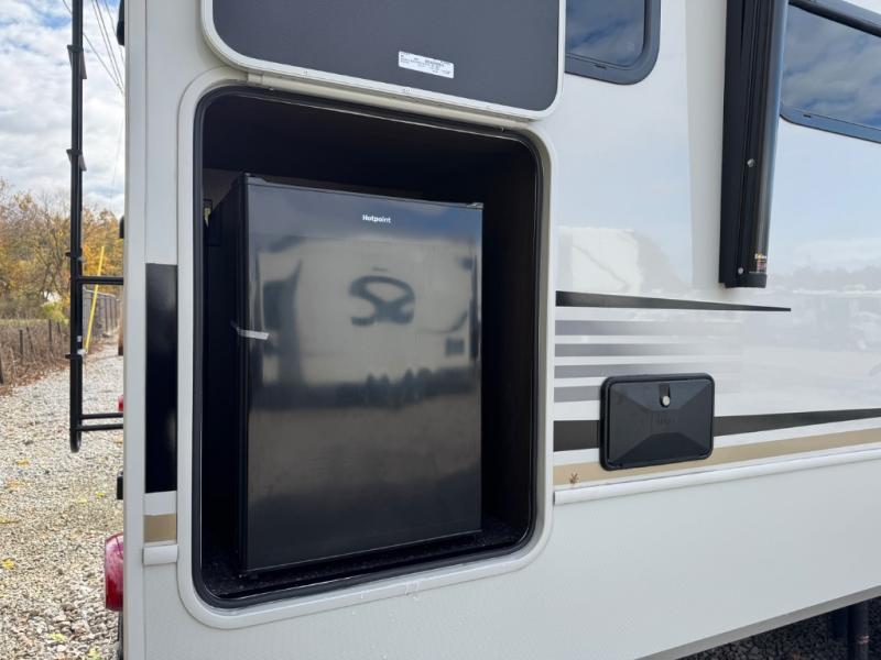 This fifth wheel is packed with premium features you won't want to camp without. You'll feel at home in the front private bedroom with its queen bed slide out with storage underneath, full-height wardrobe, plus a wardrobe with washer and dryer prep. There is even dresser with a sliding top with hidden storage for your valuables. If you have any guests, they can sleep on the tri-fold sleeper sofa within the living room slide, and there is a fireplace and LED HDTV here in perfect view for movie nights. This Cougar fifth wheel features a rear kitchen with tons of counter space, a convenient pull out trash can, and a high-rise chef's faucet and sprayer. The pull-out table in front of the fireplace will provide a place to dine at, or you can sit outdoors under the 20' power awning, and you'll also find an outside refrigerator to keep drinks stocked!