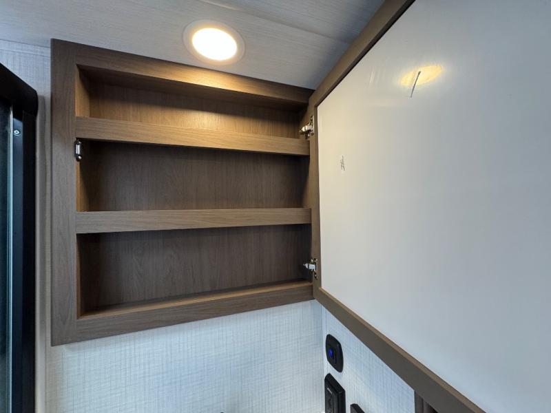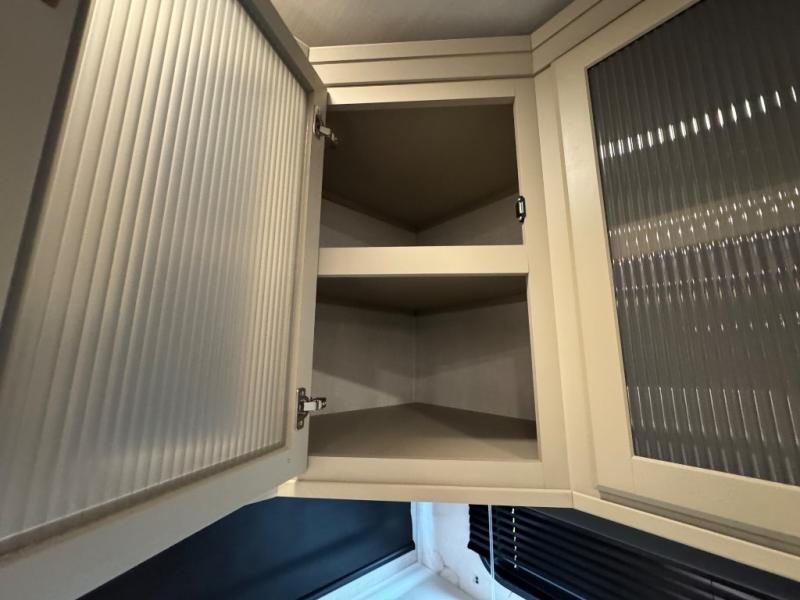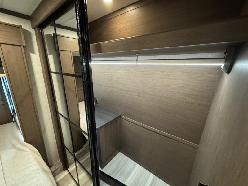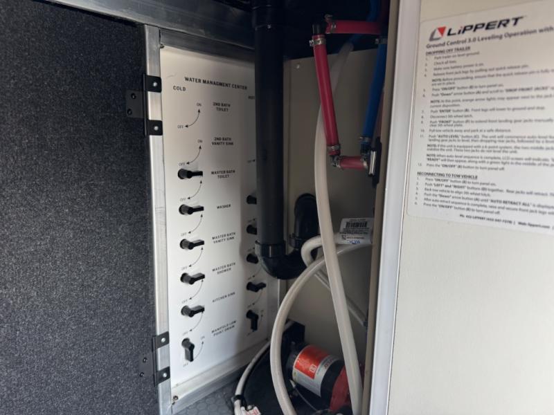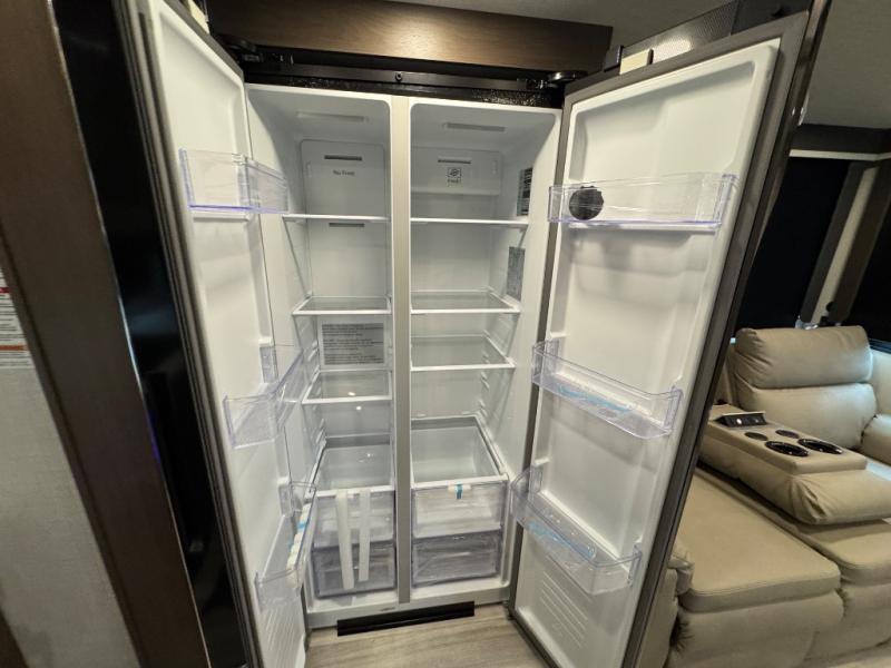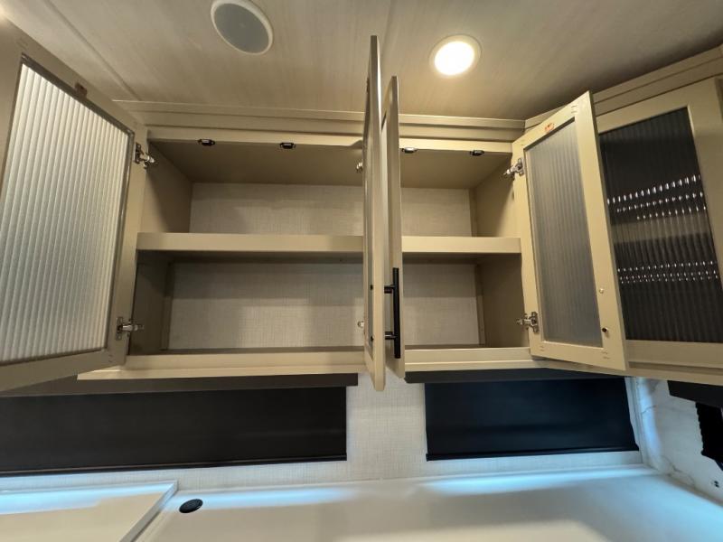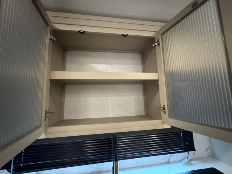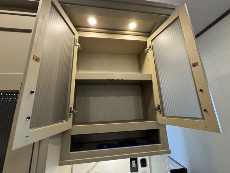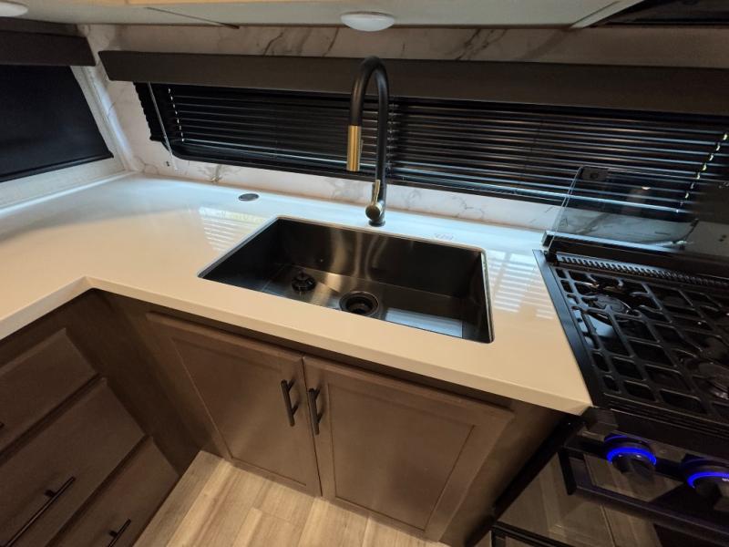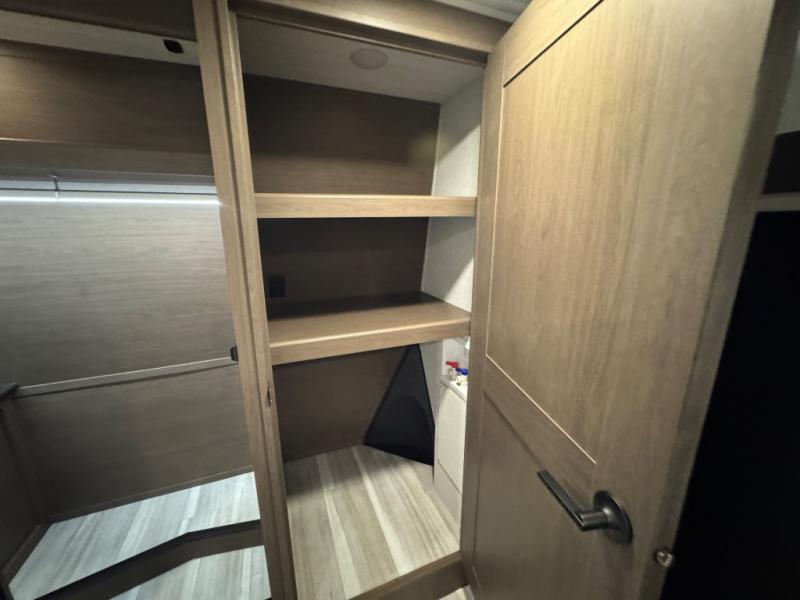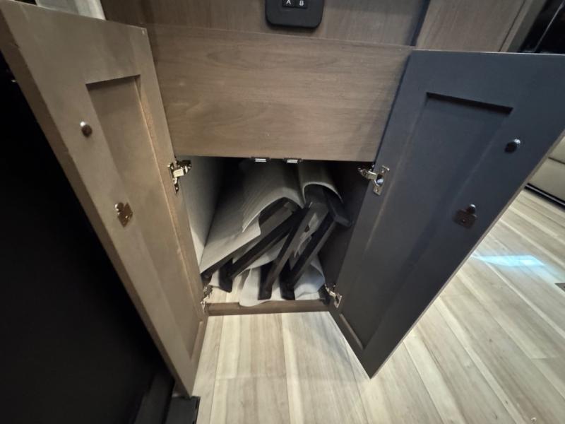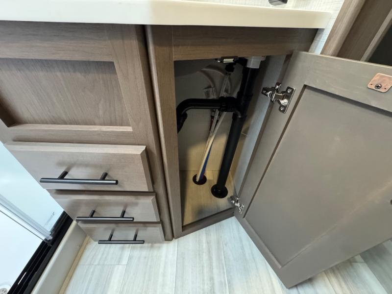 This fifth wheel is packed with premium features you won't want to camp without. You'll feel at home in the front private bedroom with its queen bed slide out with storage underneath, full-height wardrobe, plus a wardrobe with washer and dryer prep. There is even dresser with a sliding top with hidden storage for your valuables. If you have any guests, they can sleep on the tri-fold sleeper sofa within the living room slide, and there is a fireplace and LED HDTV here in perfect view for movie nights. This Cougar fifth wheel features a rear kitchen with tons of counter space, a convenient pull out trash can, and a high-rise chef's faucet and sprayer. The pull-out table in front of the fireplace will provide a place to dine at, or you can sit outdoors under the 20' power awning, and you'll also find an outside refrigerator to keep drinks stocked!